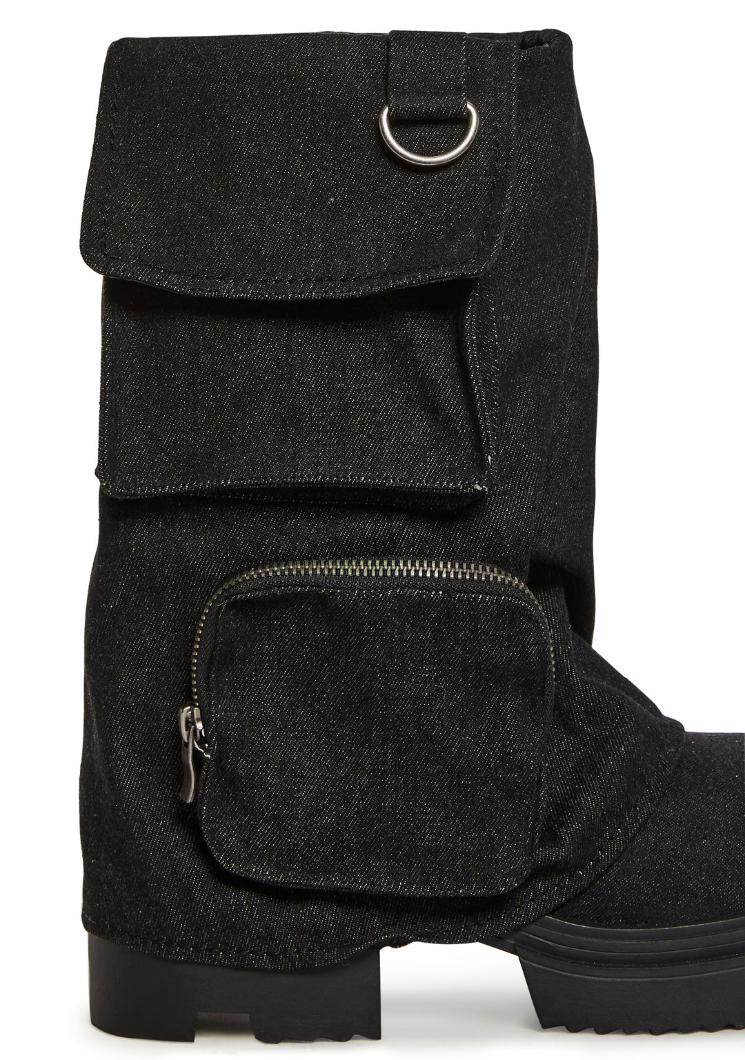 In a denim construction with a foldover design with zippered and snap button cargo pockets. D-ring hardware, a round toe design, and treaded soles.