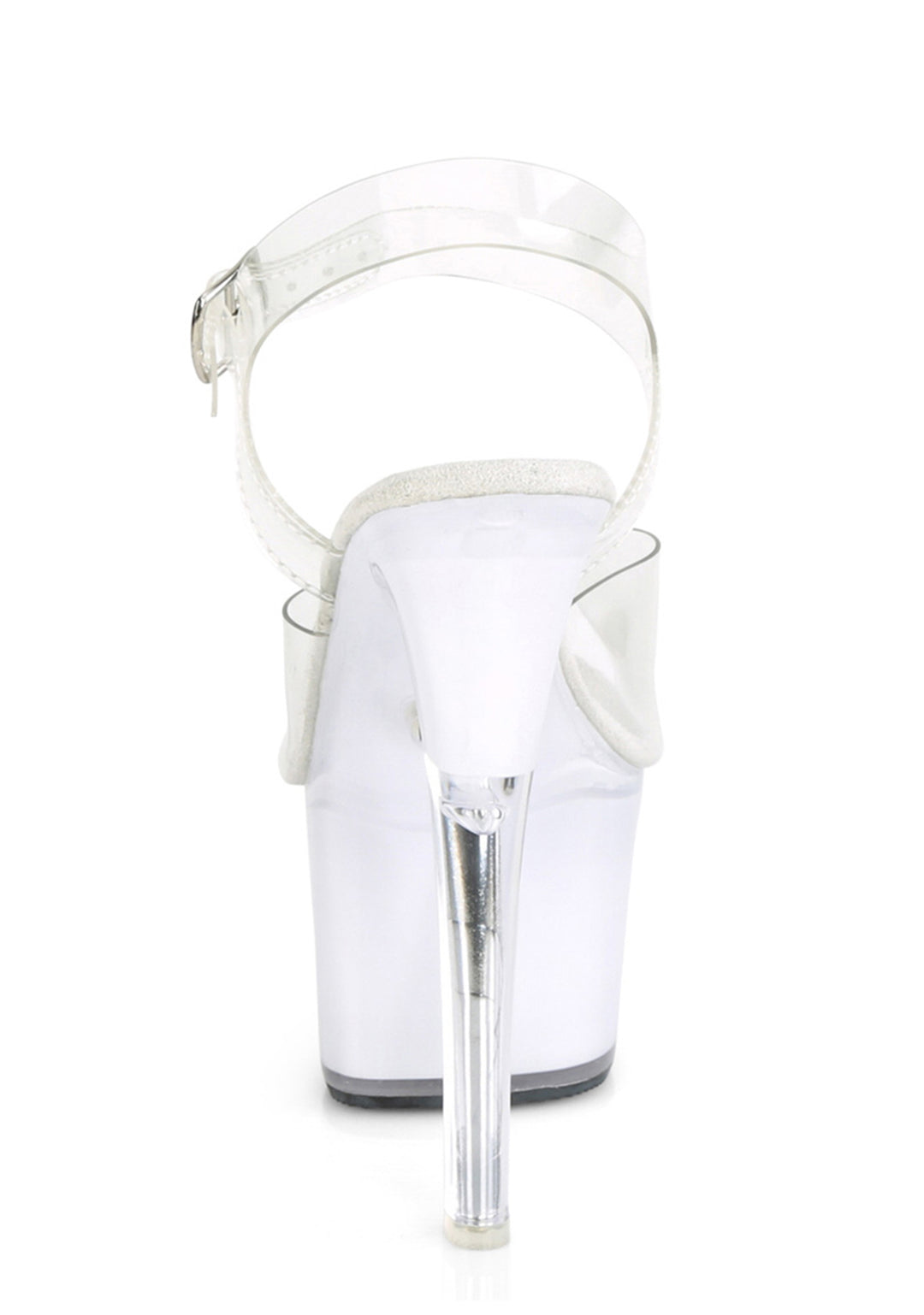 These shoes have clear vinyl uppers, platform soles, stiletto heels, and a USB chargeable LED light-up design with dazzling multi-color disco lighting effects.