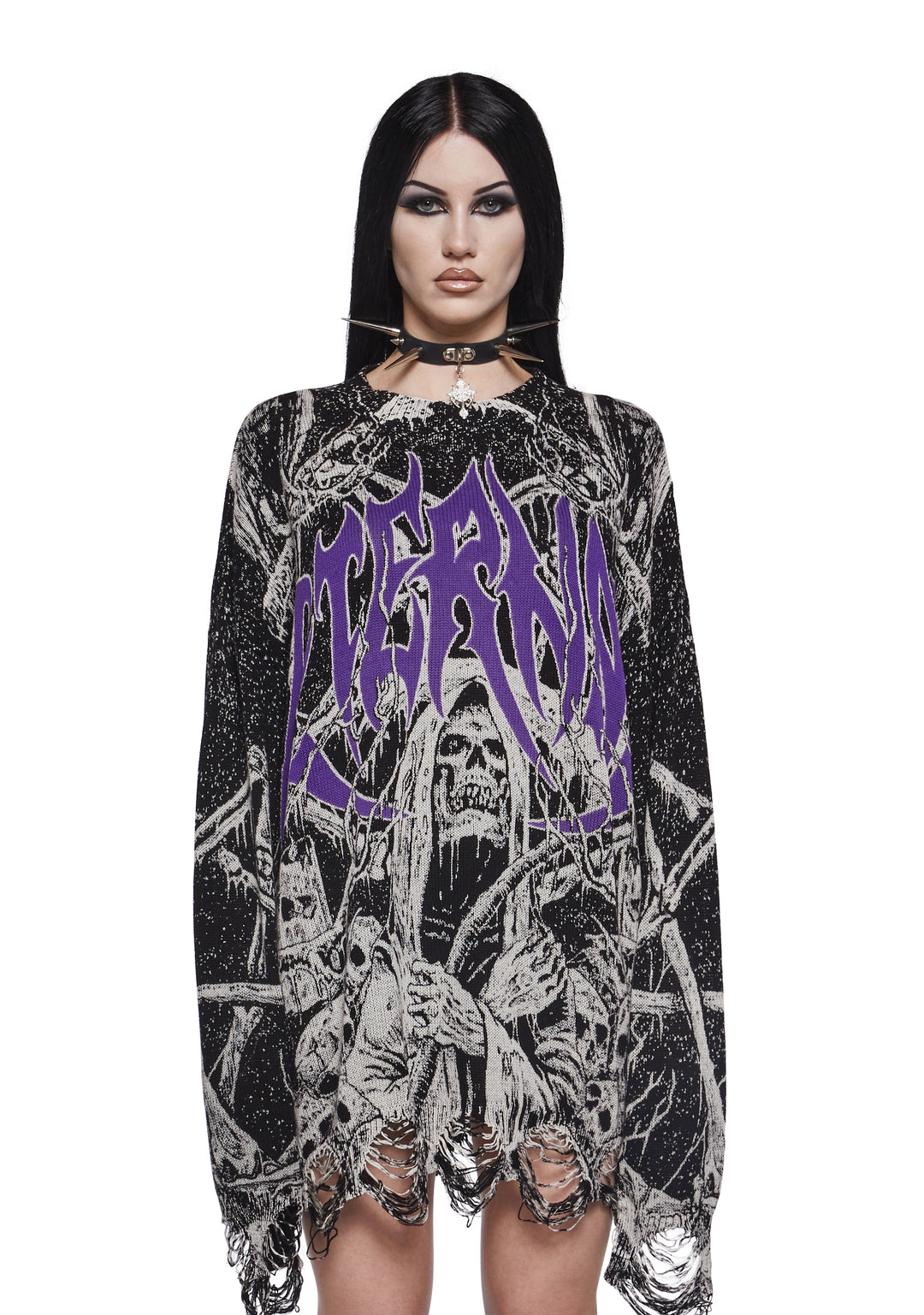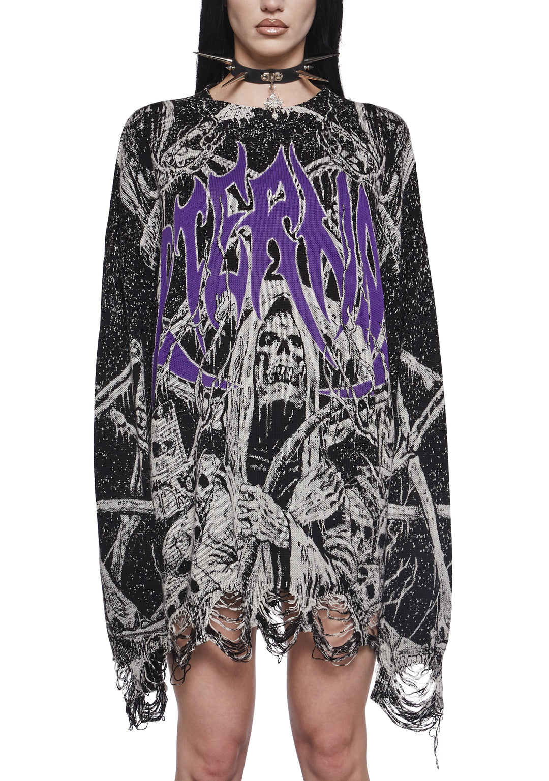This sweater has a knit construction with a distressed design, a crew neckline, an all-over skull graphic print, a front graphic of the Grim Reaper with the word ‘Eternal,’ a back graphic of a pentagram, and an oversized fit.