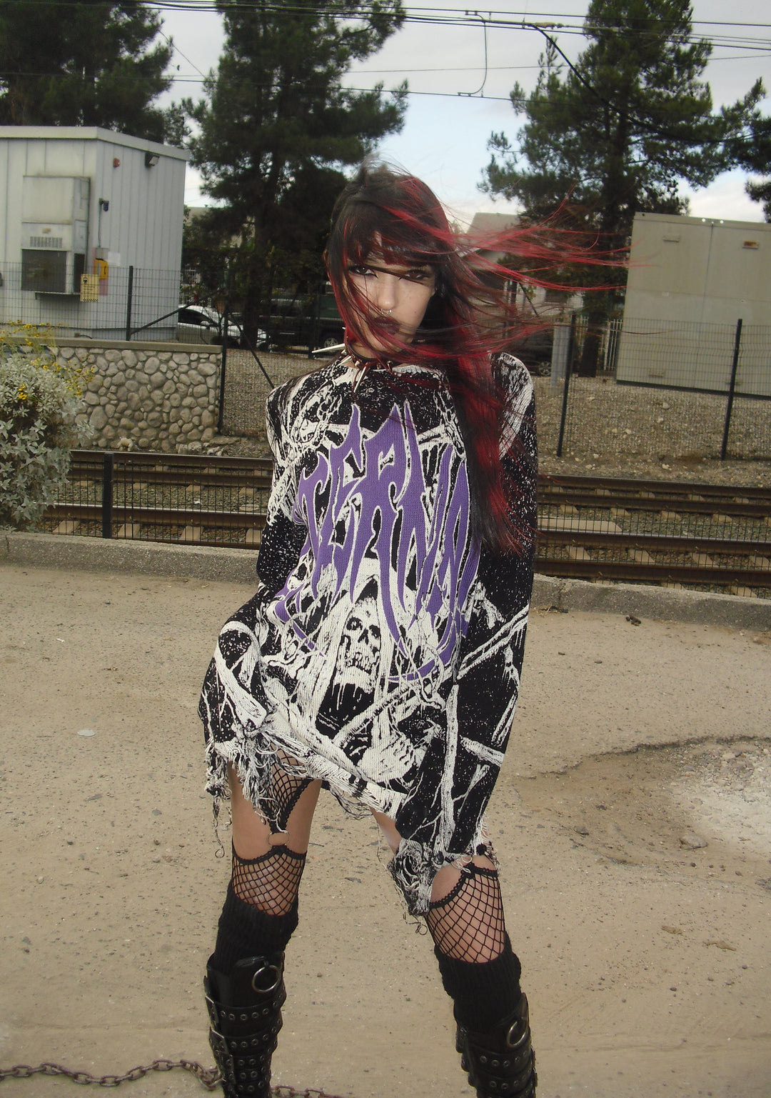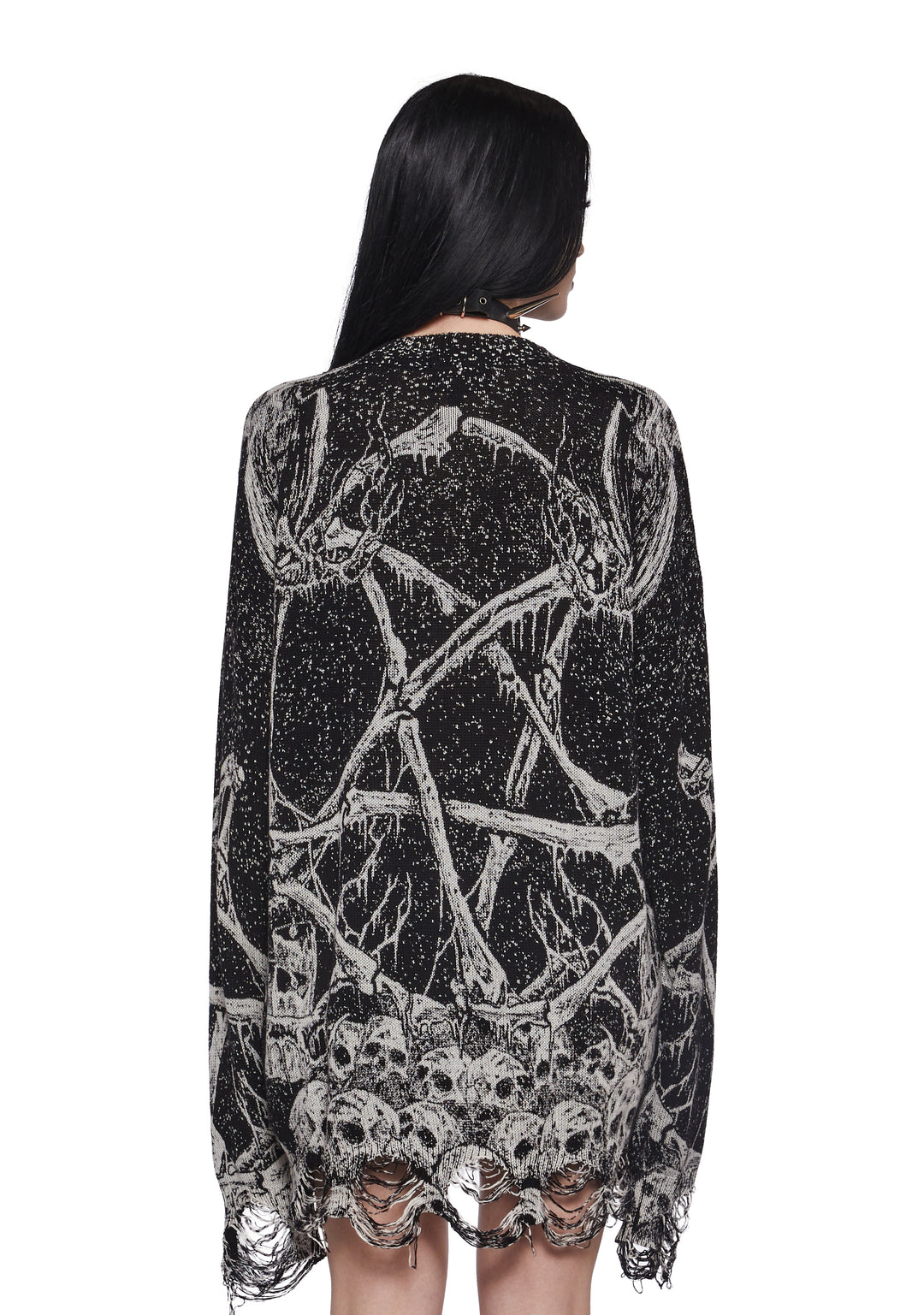 Distressed Stretchy Knit Grim Reaper Skull Graphic Print Oversized Sweater Widow – Black