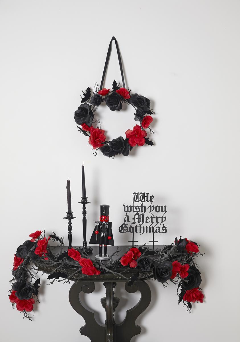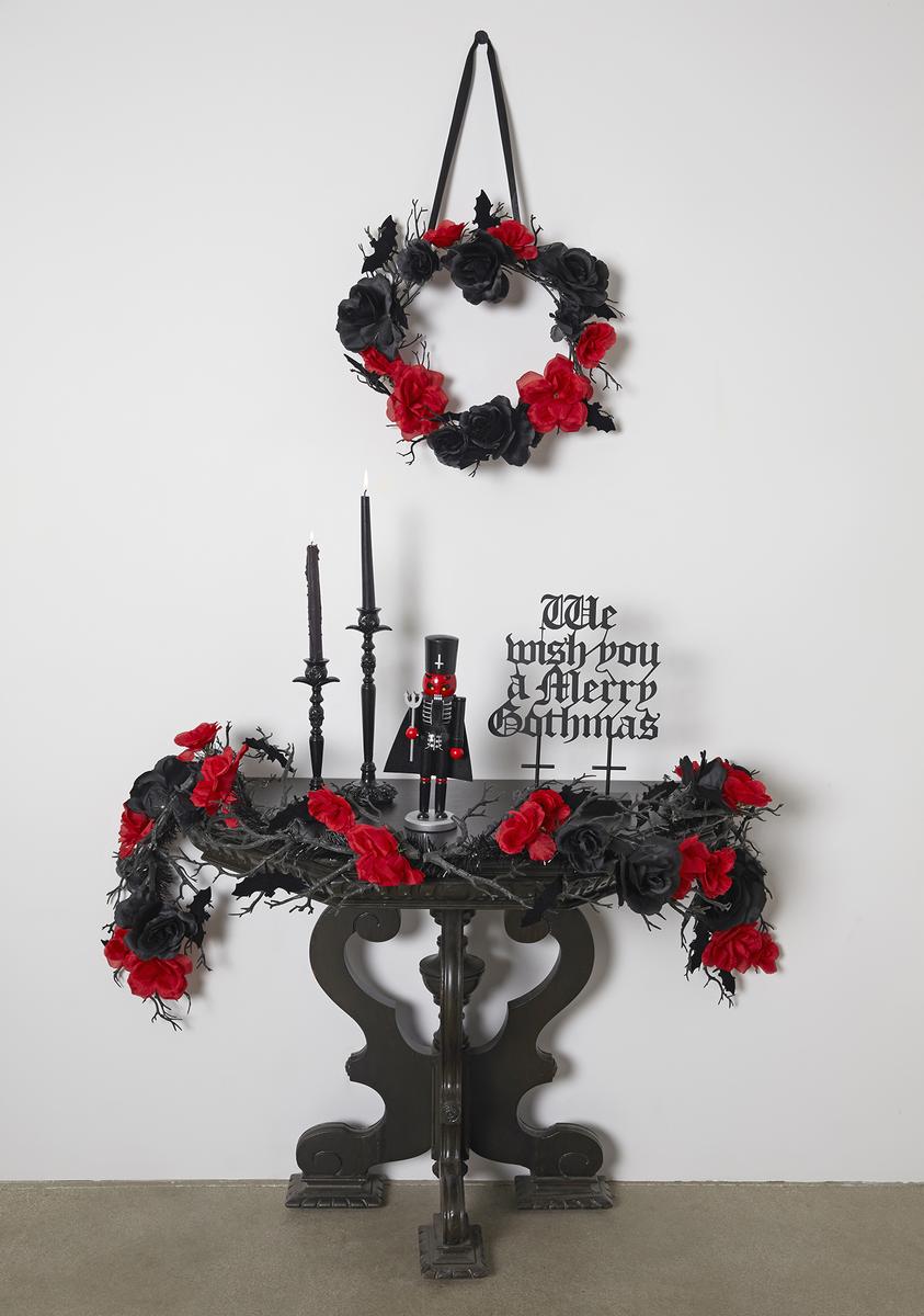 season’s creepings! This wreath is decorated with branches, roses, and bats and has a ribbon top handle.