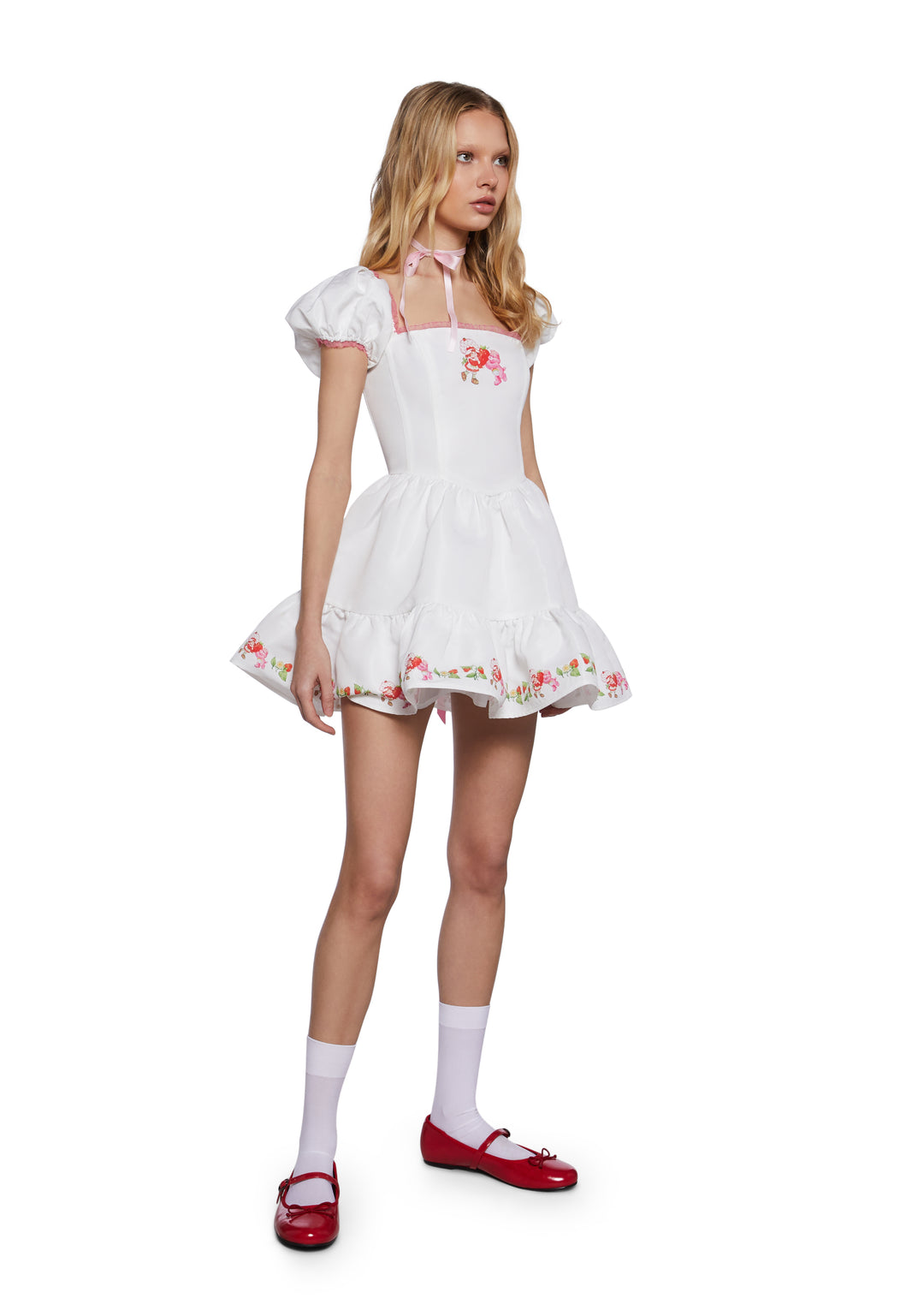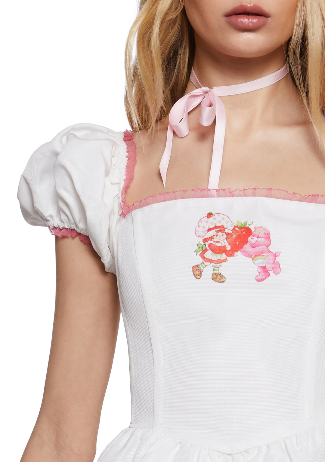Look berry sweet in this mini dress that has a textured taffeta construction, structured boning, puffy sleeves with elastic cuffs, a square neckline with a contrast colored organza trim, a satin ribbon lace-up design on the back, a graphic of Cheer Bear and Strawberry Shortcake on the front and skirt hem, and a side zipper closure.