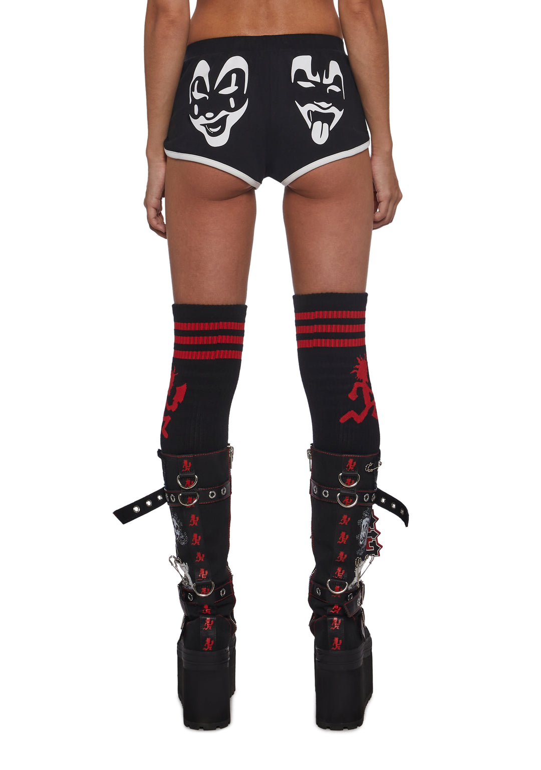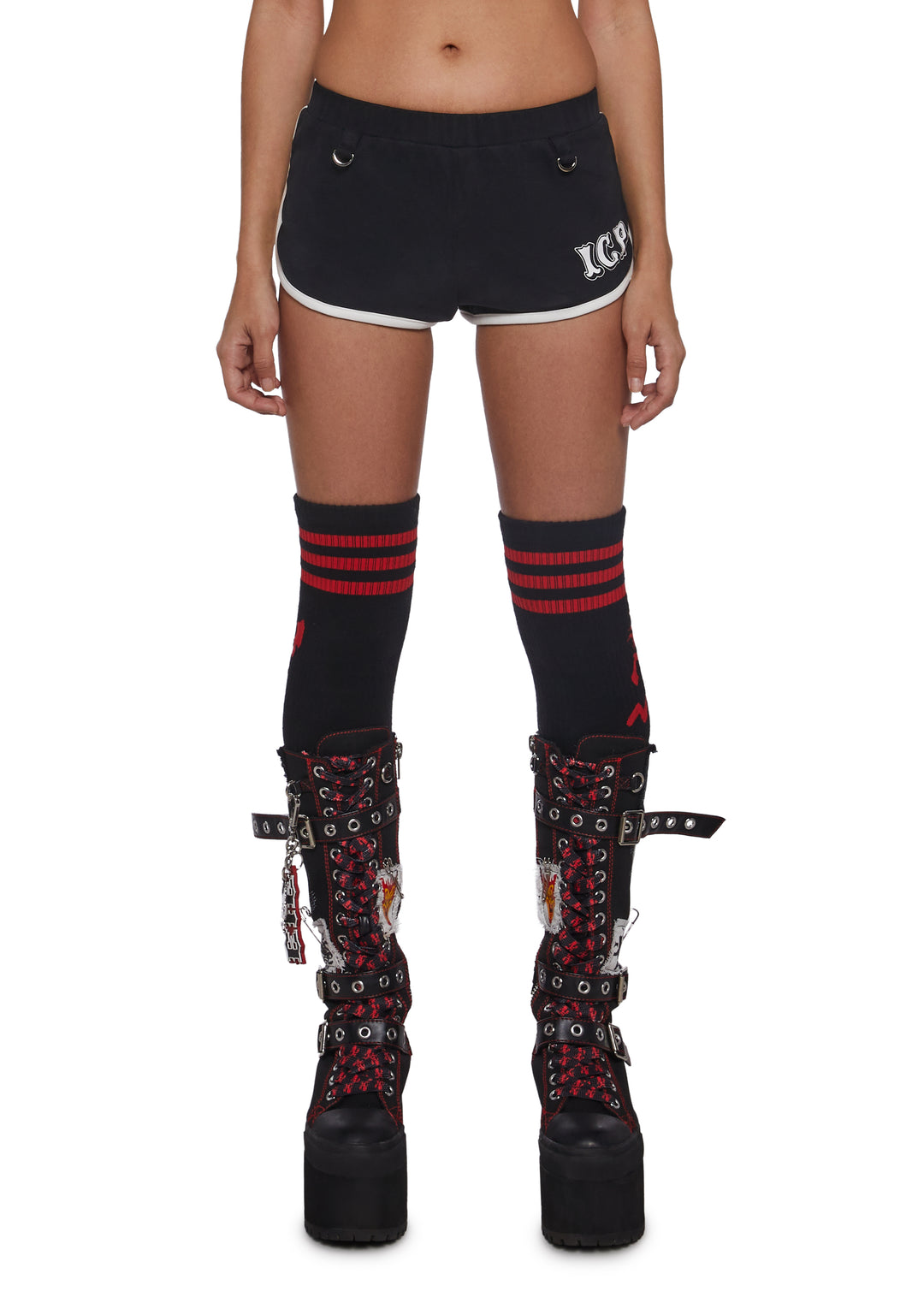 These booty shorts have a stretchy cotton construction, an elastic waistband, D-ring hardware, ICP logo on the front, a contrast colored trim, and Violent J and Shaggy 2 Dope graphics on the front.