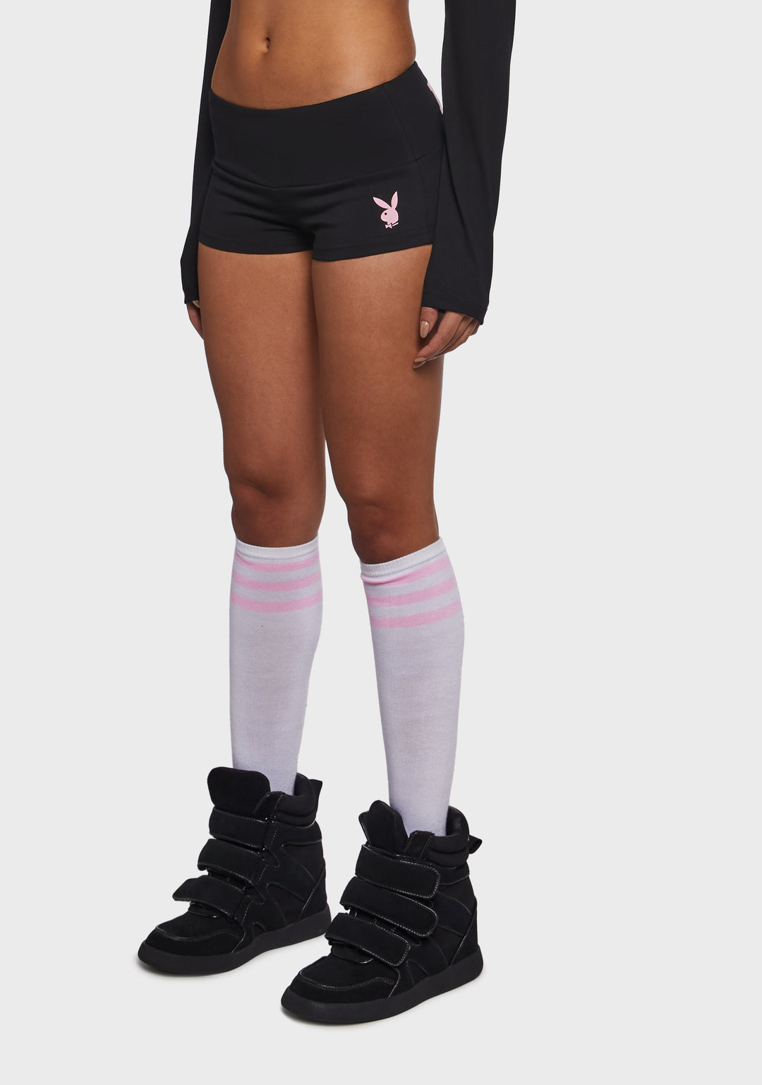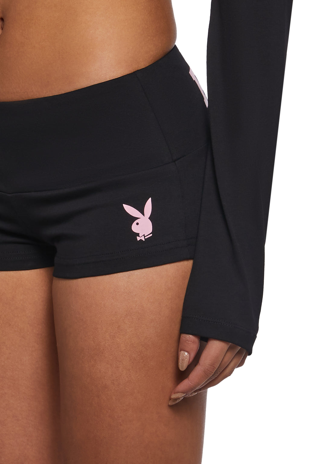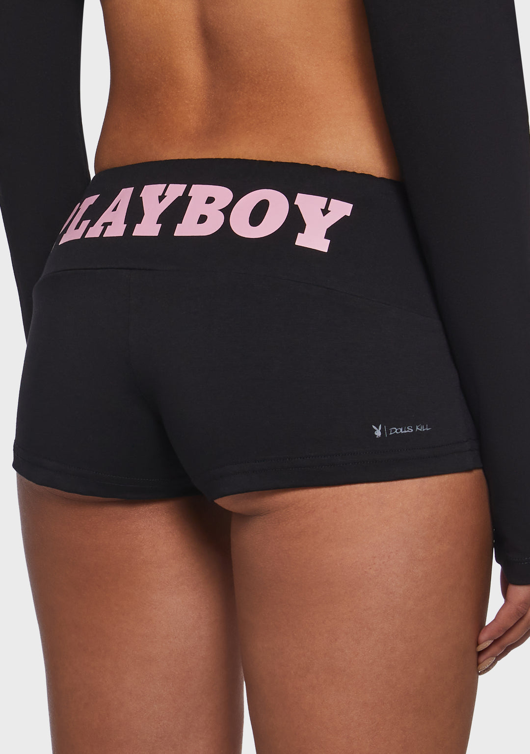 These mini shorts have a stretchy spandex construction, an elastic waistband, Playboy bunny logo printed on the front, and “Playboy” printed on the front.