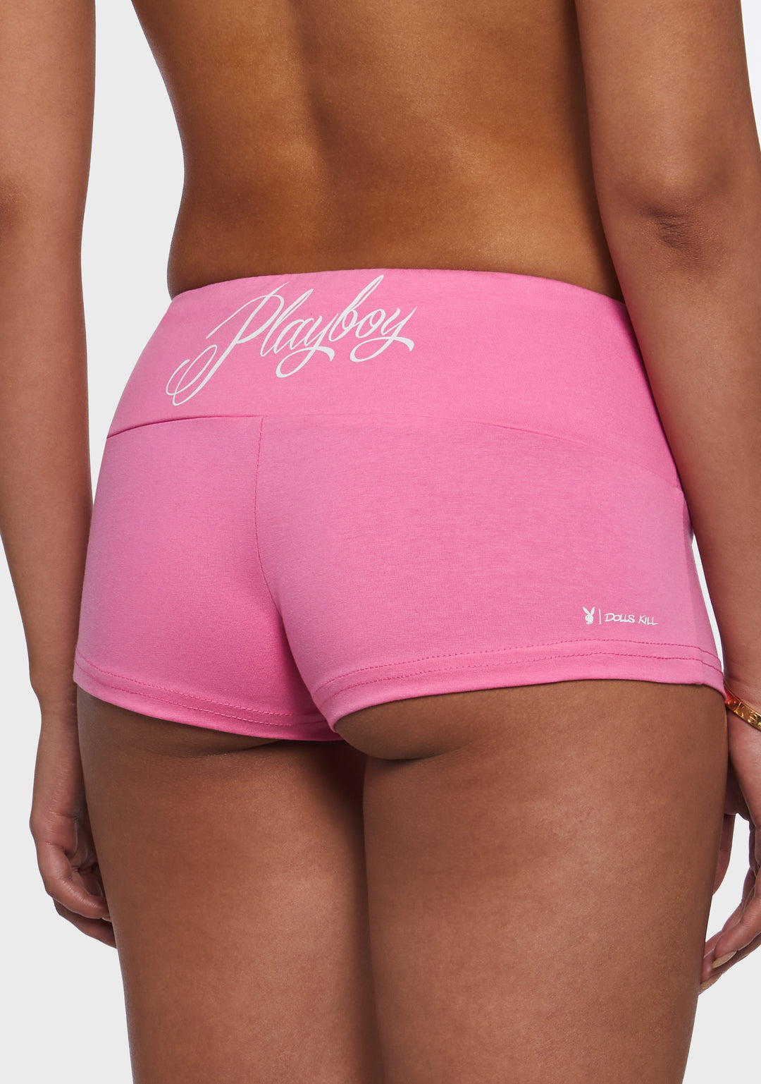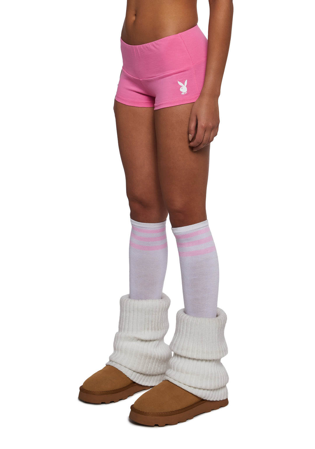 These mini shorts have a stretchy spandex construction, an elastic waistband, Playboy bunny logo printed on the front, and “Playboy” printed on the front.