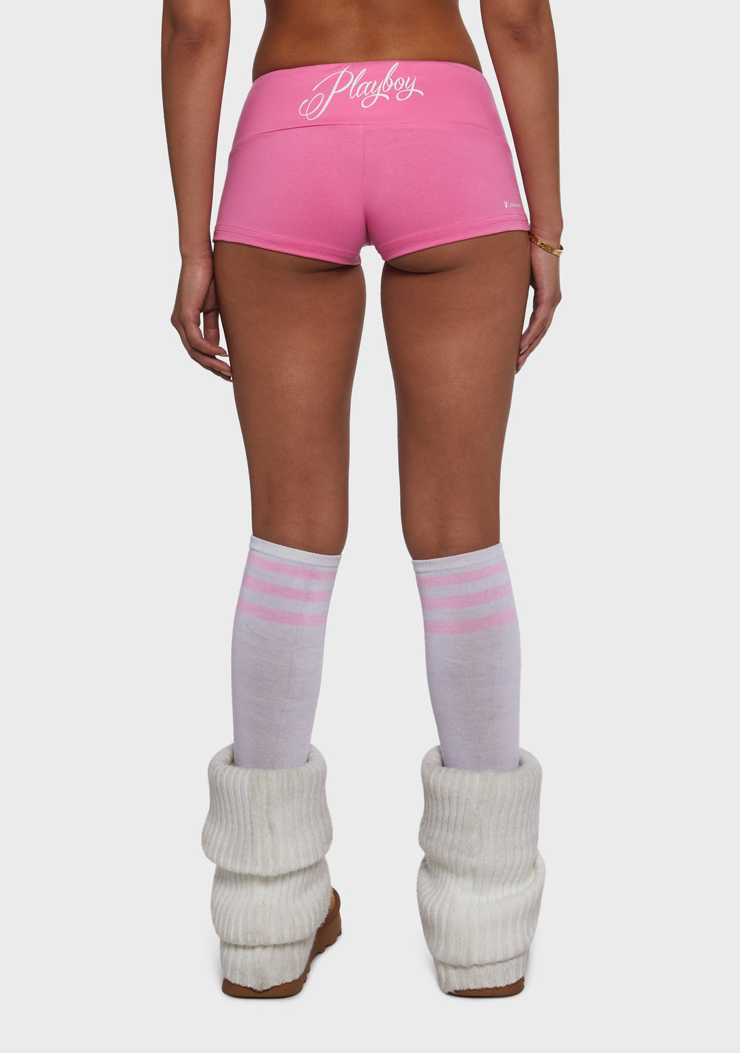 Style these Playboy mini shorts with a fitted tank, oversized graphic tee, and chunky sneakers for a playful, casual streetwear look.