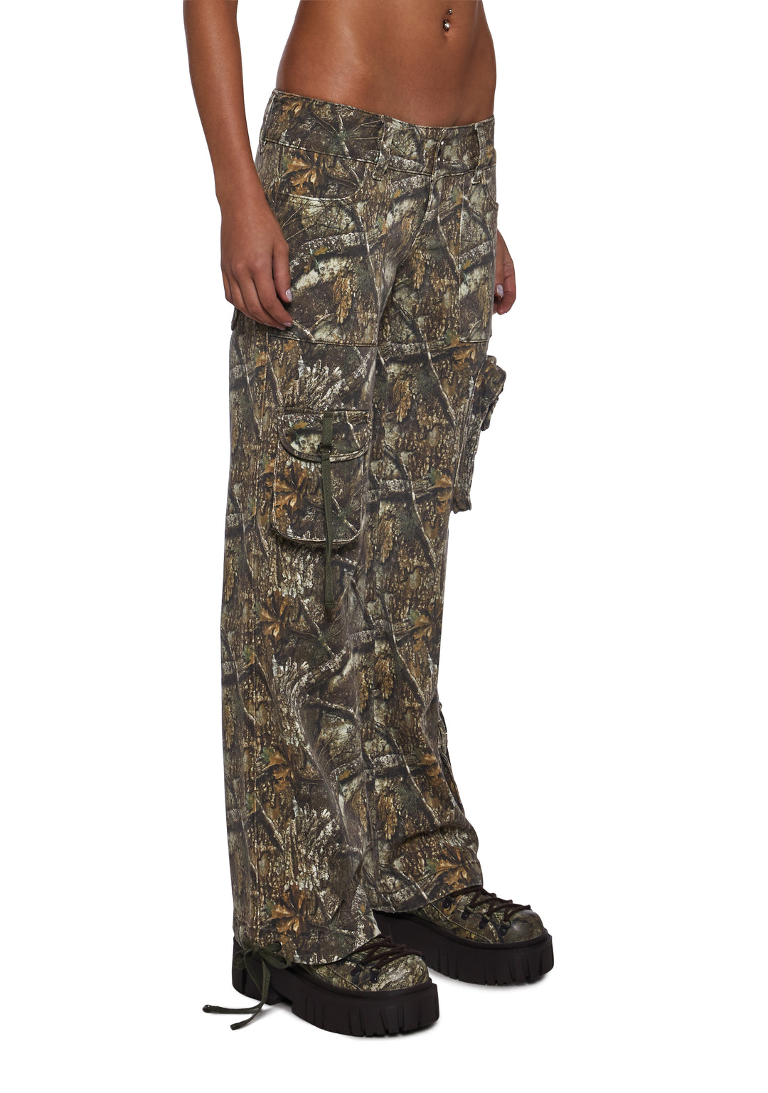 These jeans have a stretchy denim construction, an all over camo print pattern, front and back pockets, cargo pockets with zipper and tie closures, adjustable ties on the pant legs, a low waist fit, and a front double button and zipper closure.