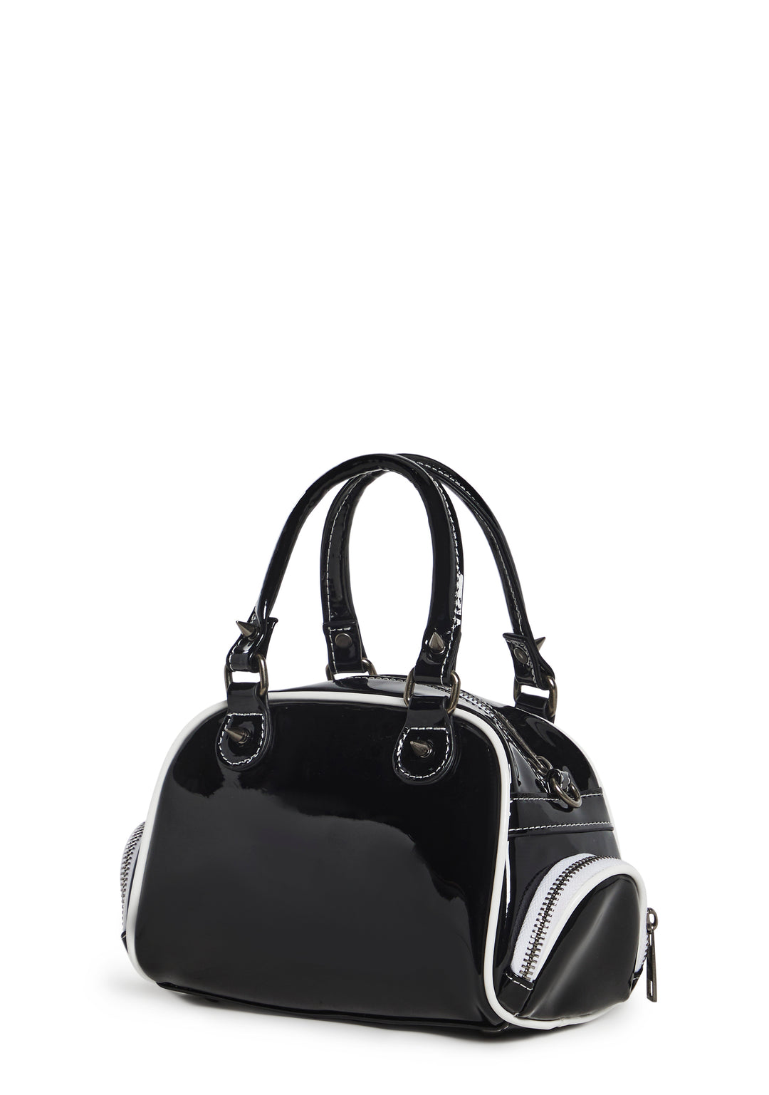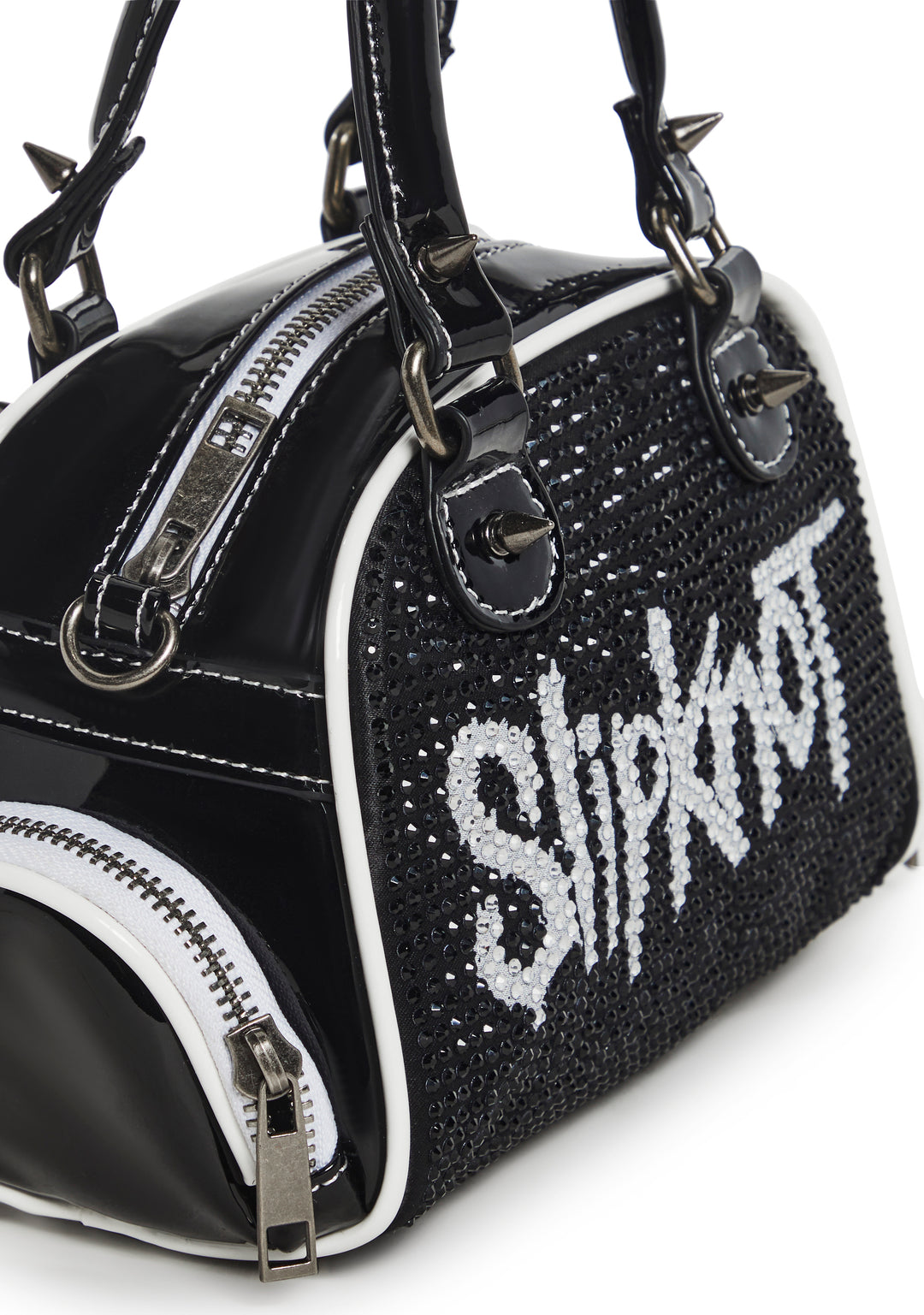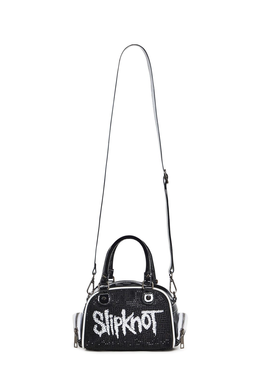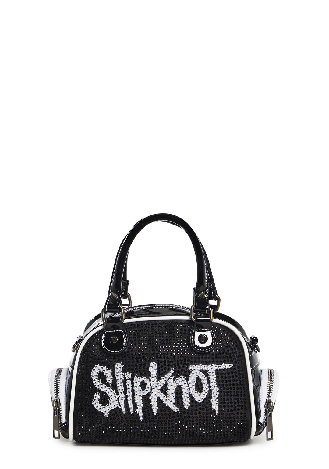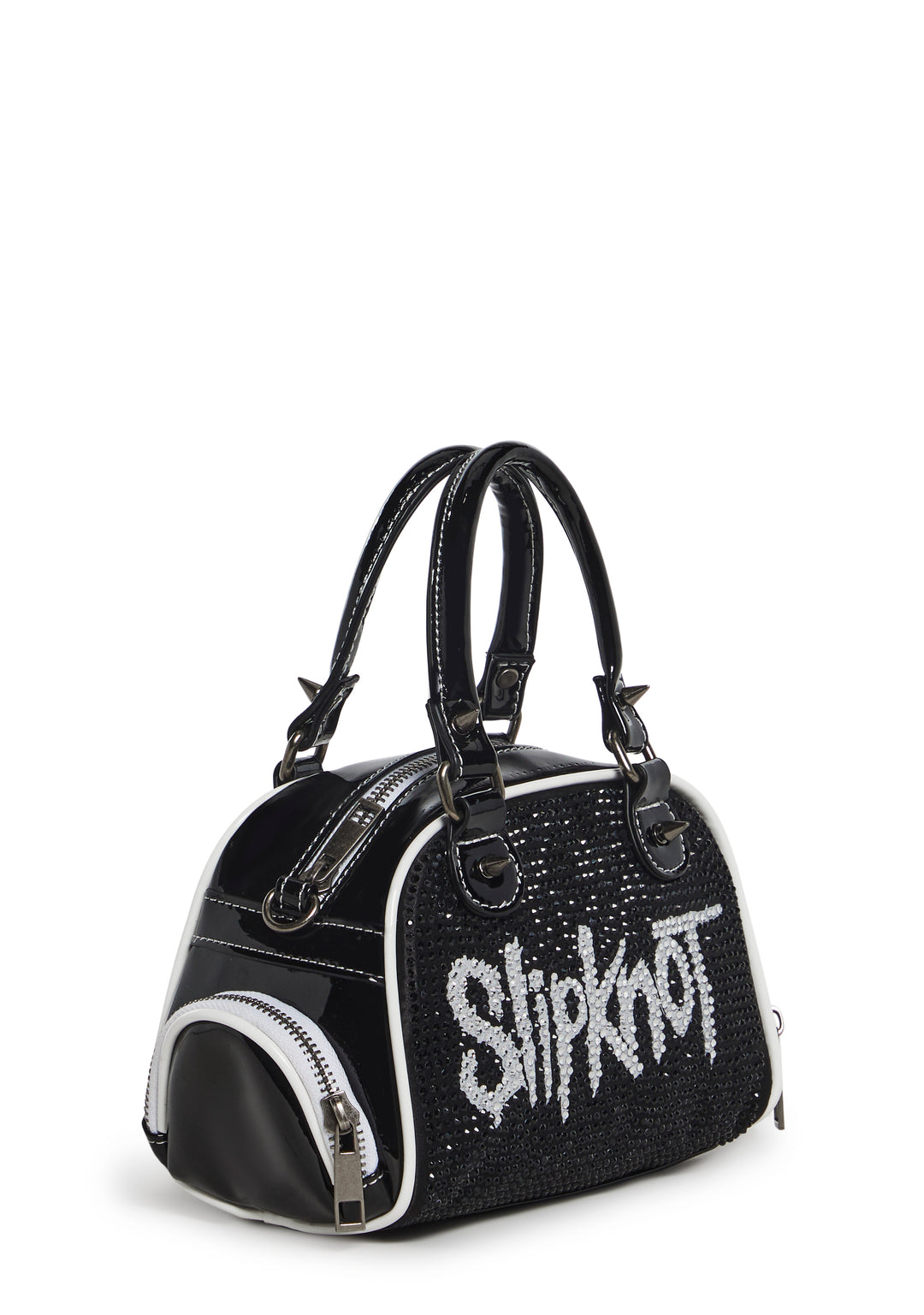 cuz you??ve got no time to lose. This bowler bag has a patent vegan leather construction with encrusted rhinestones and the Slipknot band logo on the front, top handles, a removable shoulder strap, metal spike detailing, two zippered side pockets, and a top zipper closure.