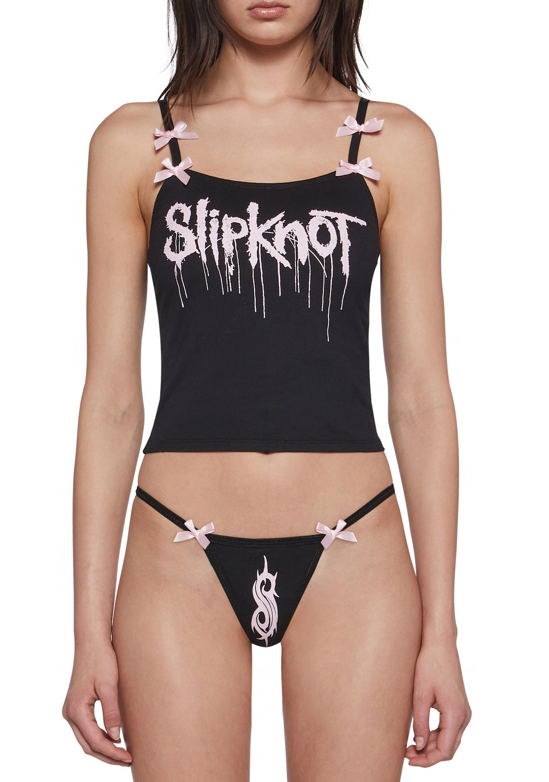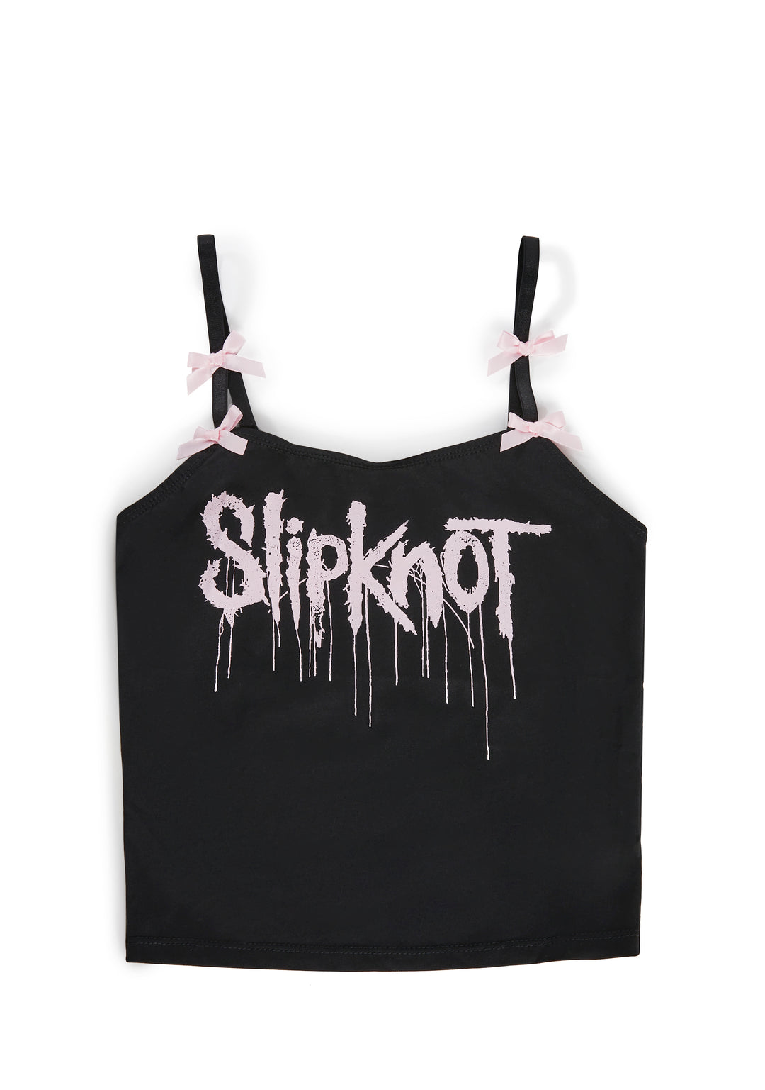 This tank top has the Slipknot band logo on the front and decorative pink bows on the shoulder straps.