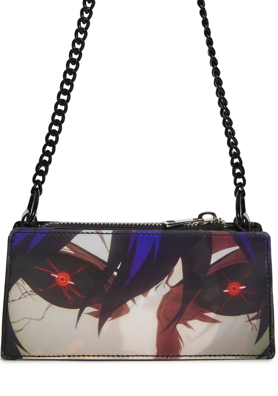 For fans of Shuu Tsukiyama, this vinyl shoulder bag has lenticular images of Tsukiyama or Gourmet’s glowing red eyes,chainlink vegan leather shoulder strap with Tokyo Ghoul embroidered graphics, and a top zipper closure.