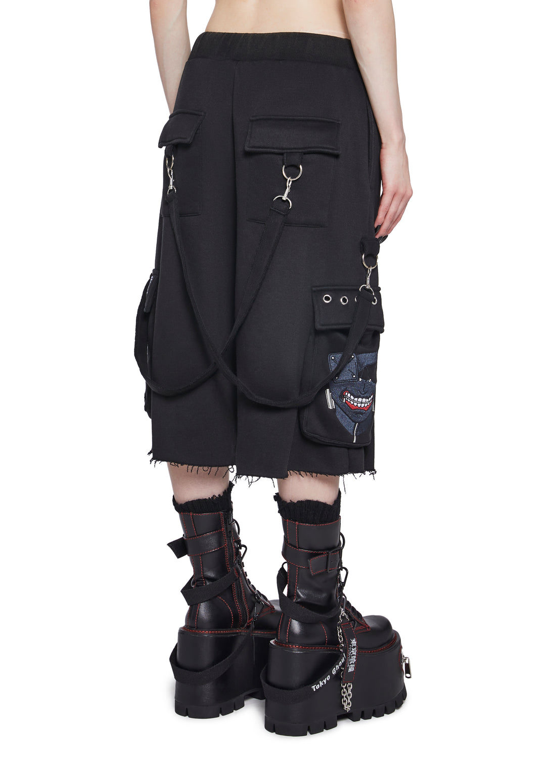 These sweatshorts have a washed cotton construction,removable adjustable straps, front and back pockets, cargo pockets with embroidered Tokyo Ghoul graphics on one pocket, and graphics on the other pocket, a frayed hem, and an elastic ribbed waistband with front adjustable tie closures.
