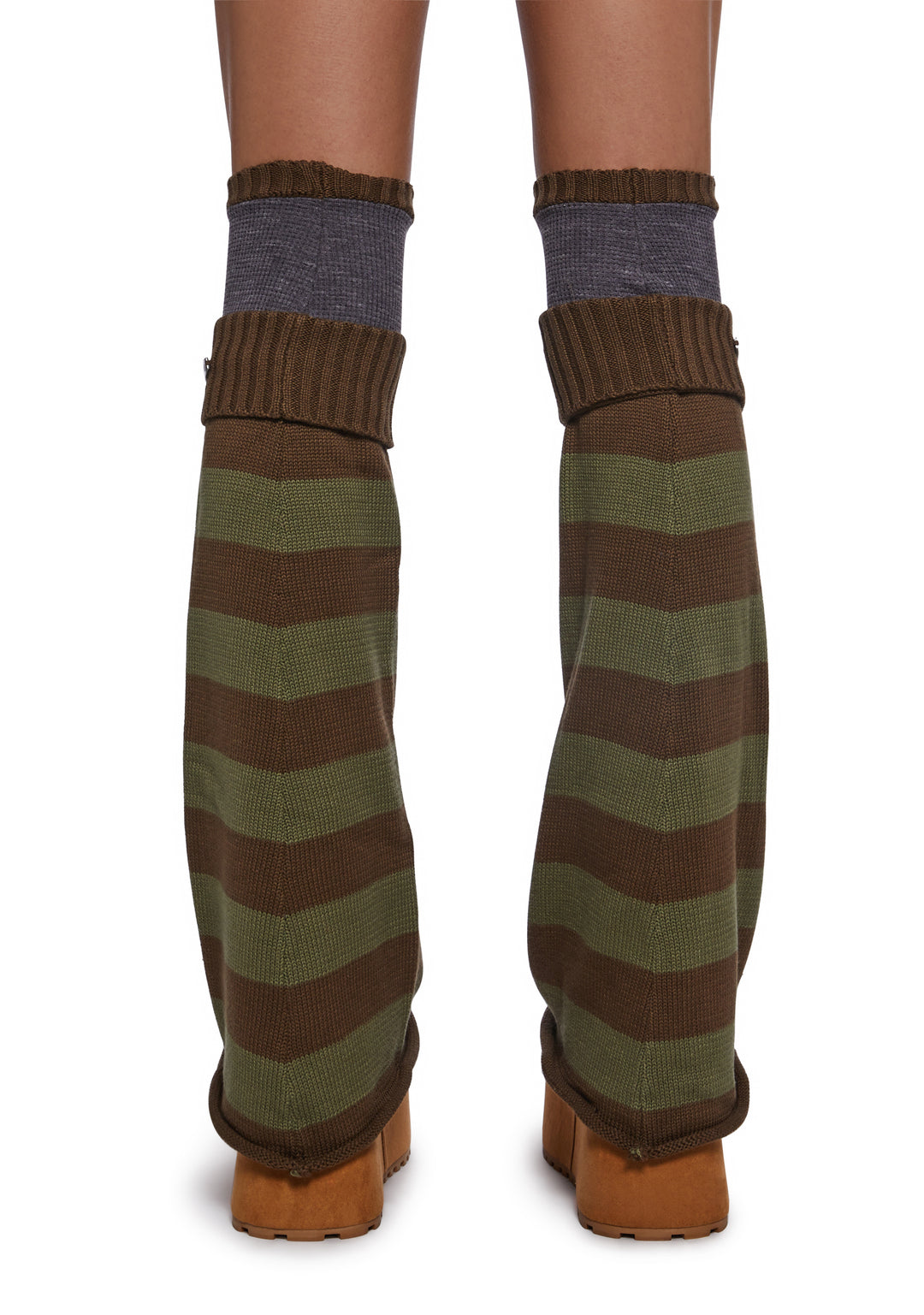 These leg warmers have a distressed thermal knit construction, a striped pattern, a foldover design with metal “Twilight” charm on the sides, and adjustable front pom pom tie closures.
