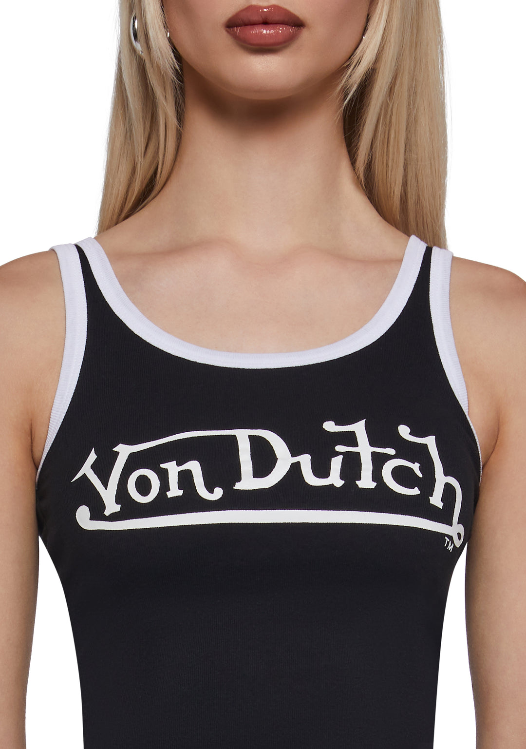 This tank top has a ribbed construction, contrast colored shoulder straps, and Von Dutch brand logo printed on the front.