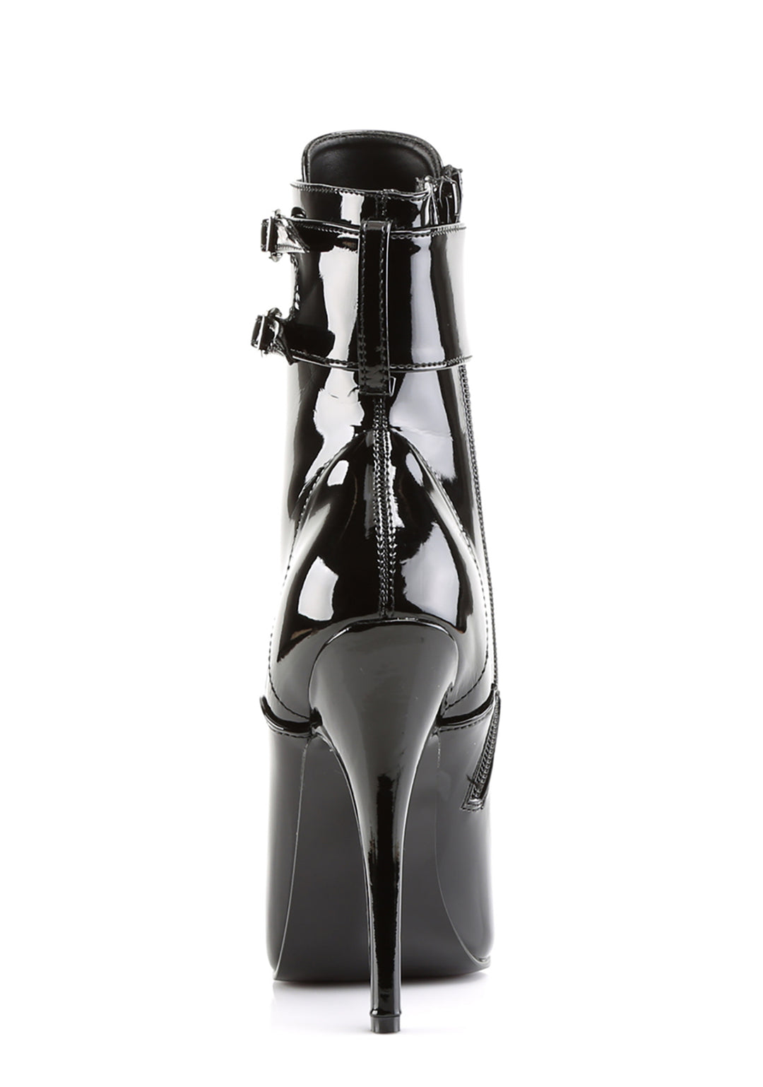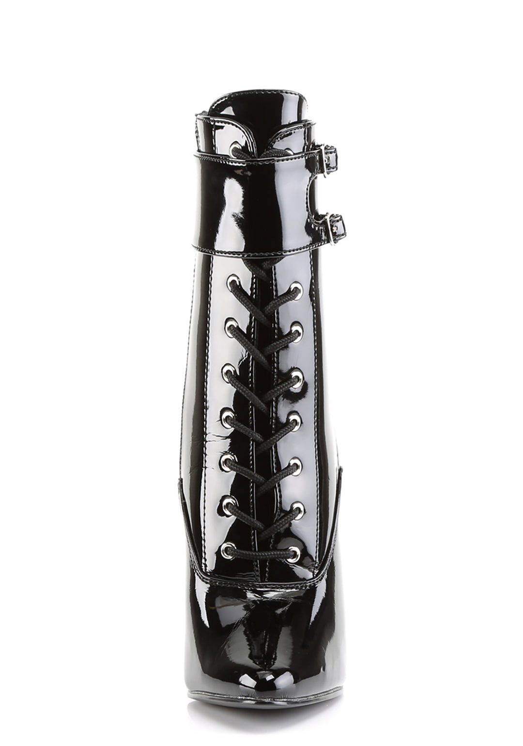 These shoes have a vinyl construction, a pointed toe design, stiletto heels, front lace-up closures, inside zipper closures, and interchangeable ankle cuffs.