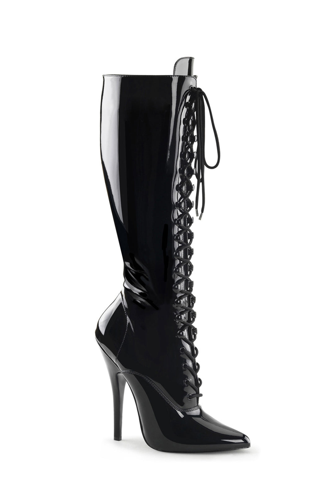 These boots have a vegan vinyl construction, a pointed toe design, front lace-ups, and side zipper closures.