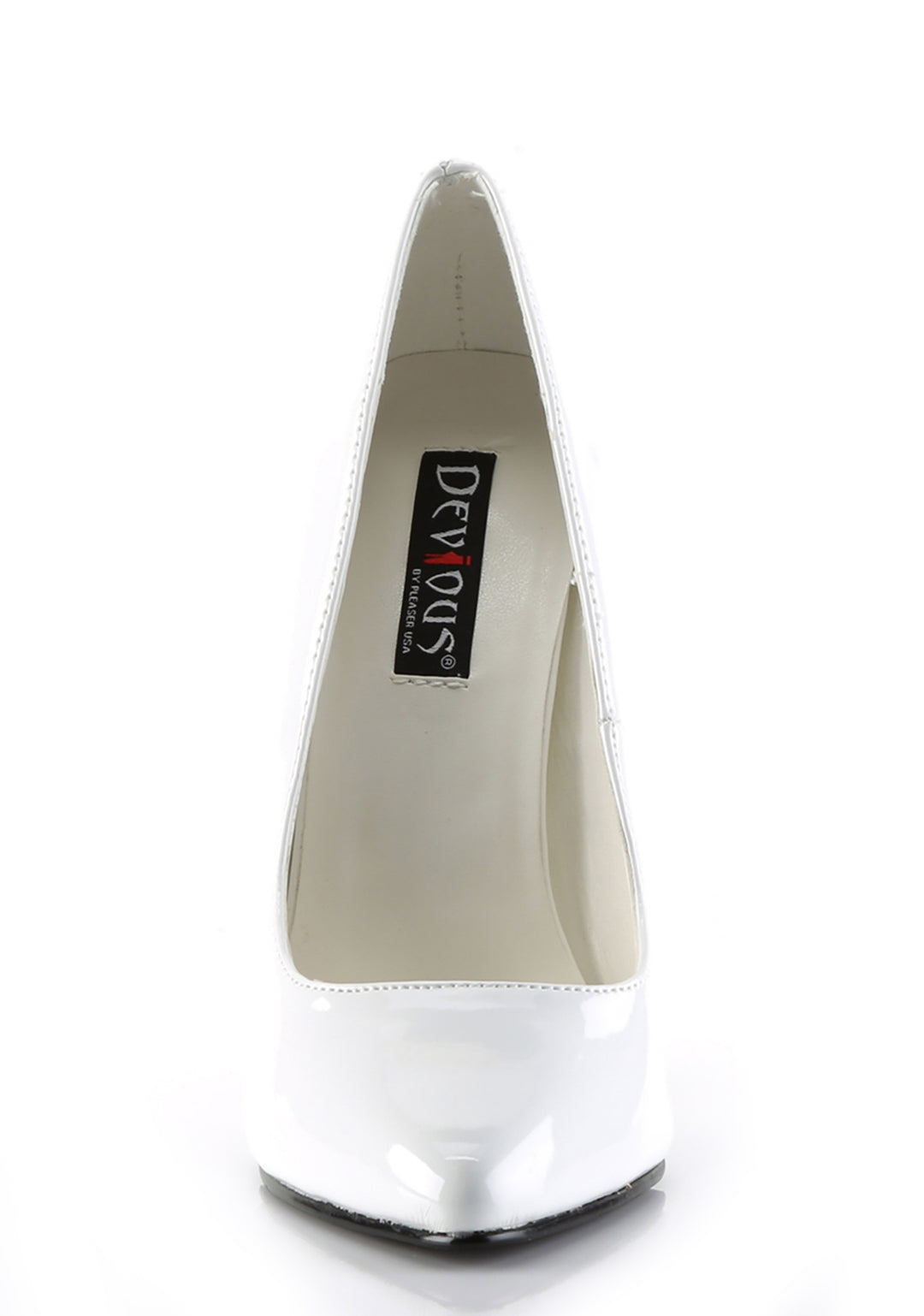 These classic pumps have a sleek vinyl construction,a pointed toe design, stiletto heels, and a slip on fit.