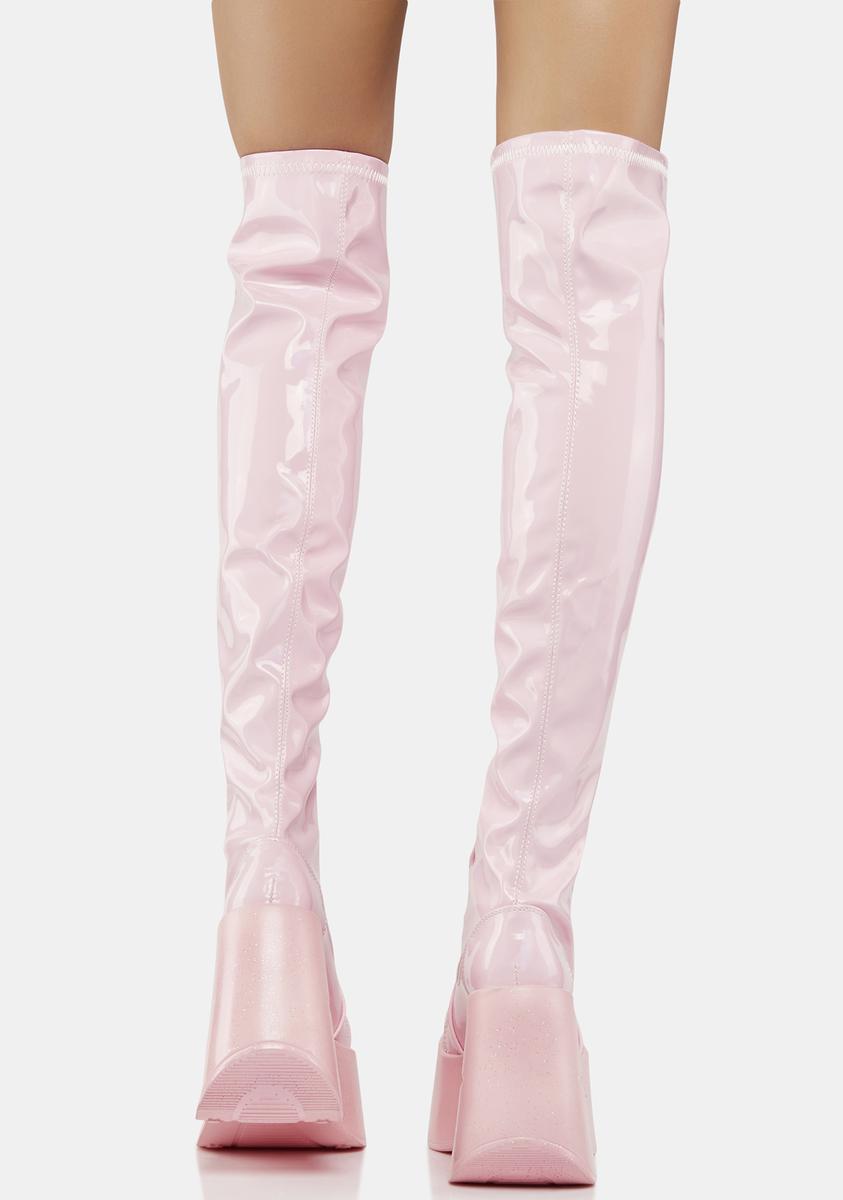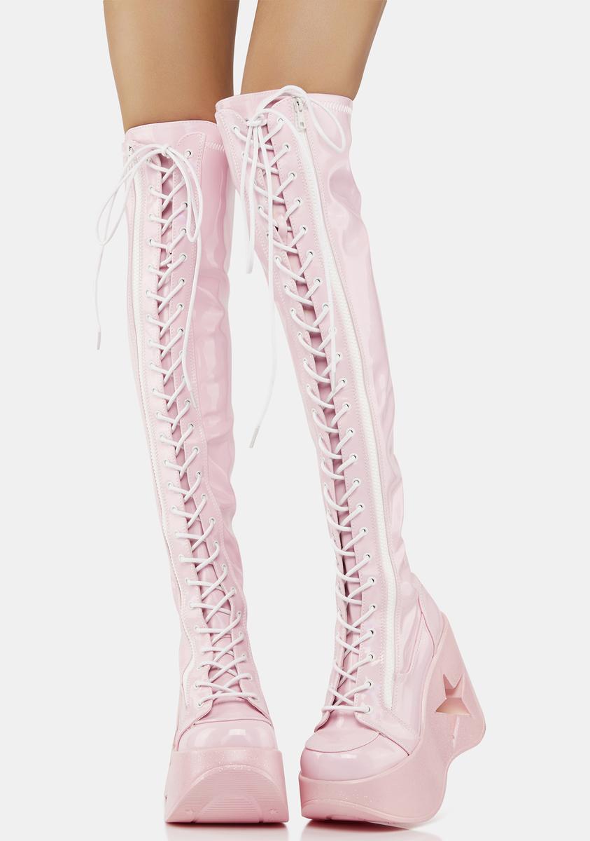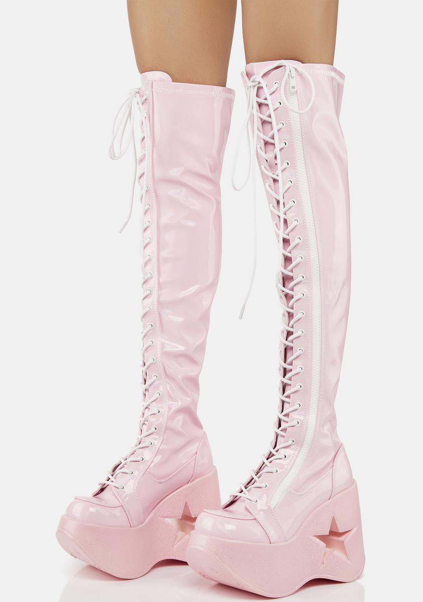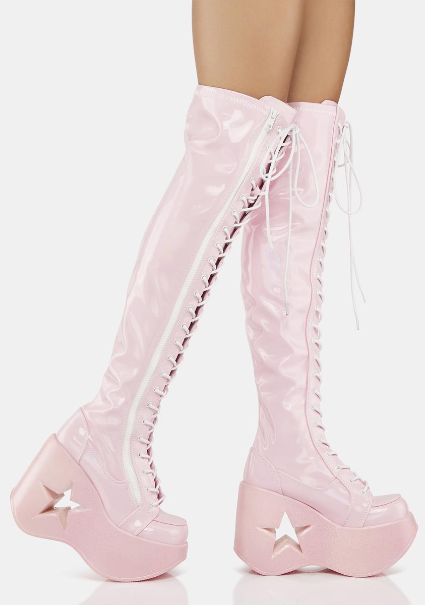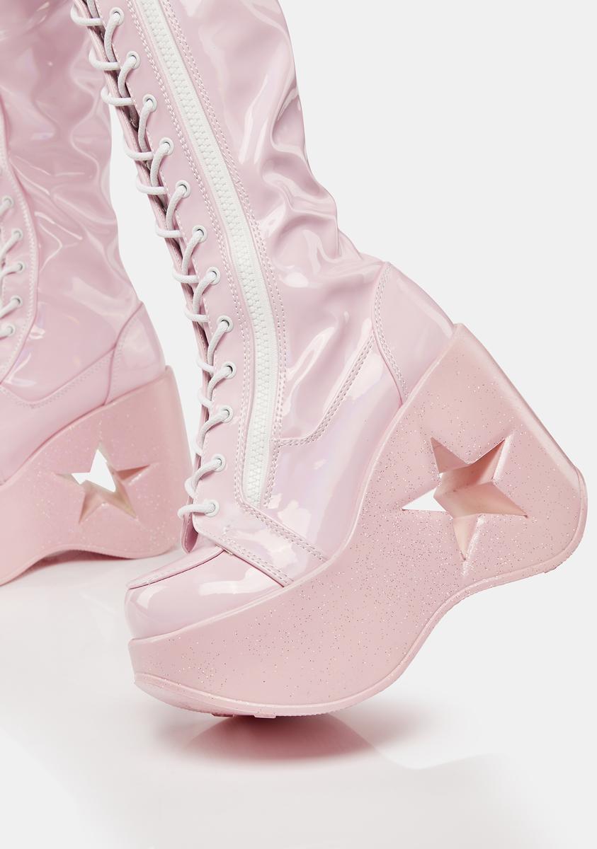 cuz you’re the center of attention! These knee high boots have a vegan leather construction, glitter wedge platform soles with star cut-outs, adjustable lace-ups, and side zip closures.