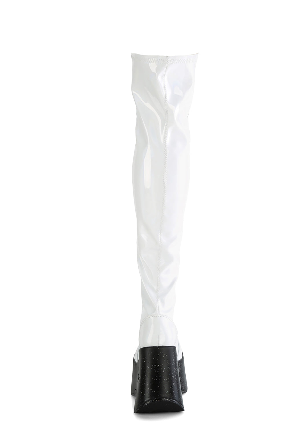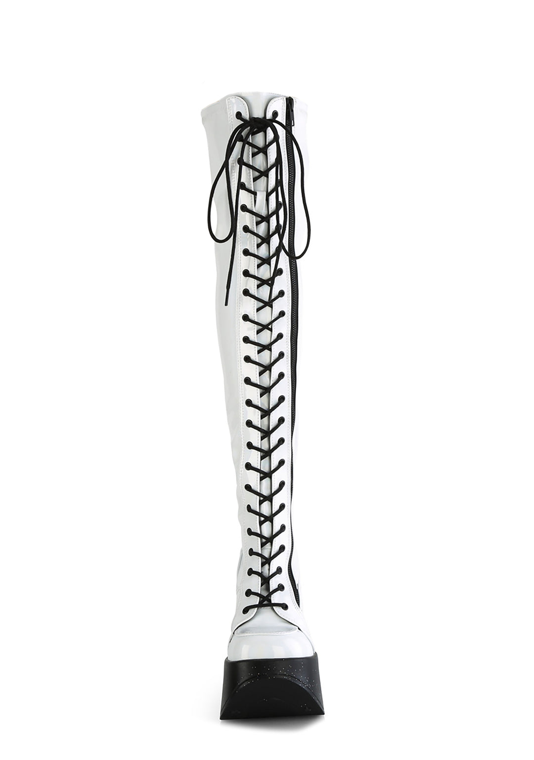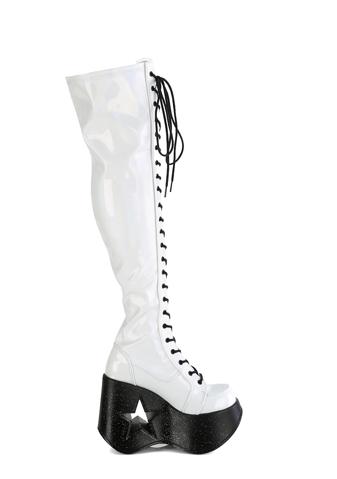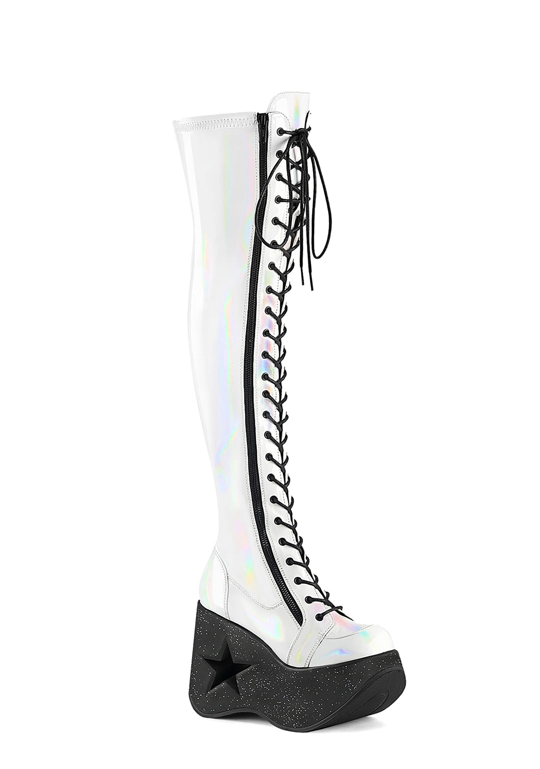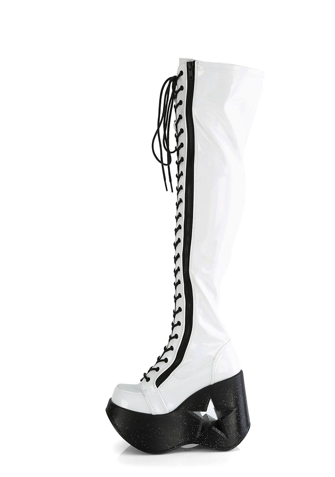 cuz you’re the center of attention! These knee high boots have a vegan leather construction, glitter wedge platform soles with star cut-outs, adjustable contrast colored lace-ups, and side zip closures.