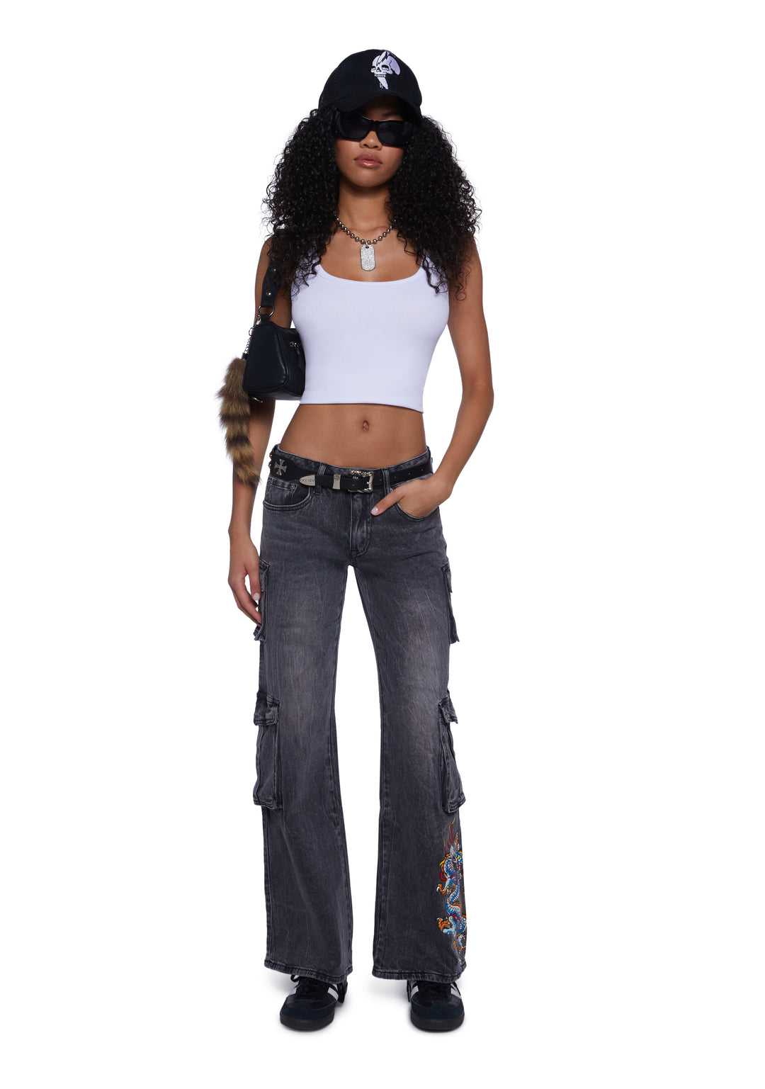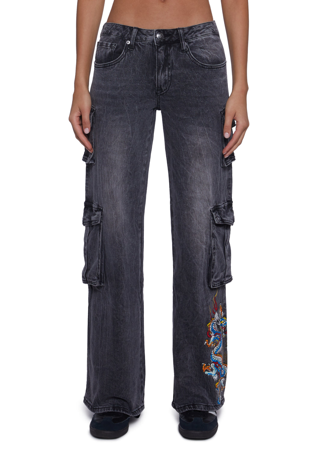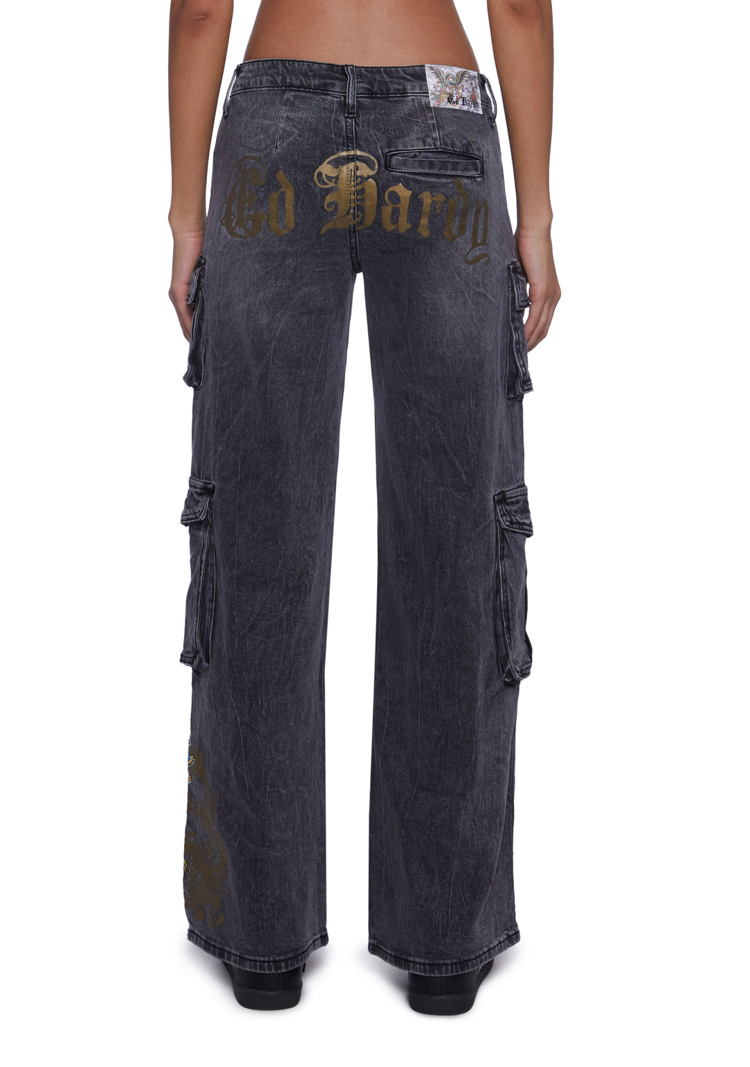 These cargo jeans have a denim construction, a wide leg silhouette, cargo pockets on the sides, front and back pockets, front button and zipper closure, and archival dragon graphic on the front and old english Ed Hardy logo in gold on the back.