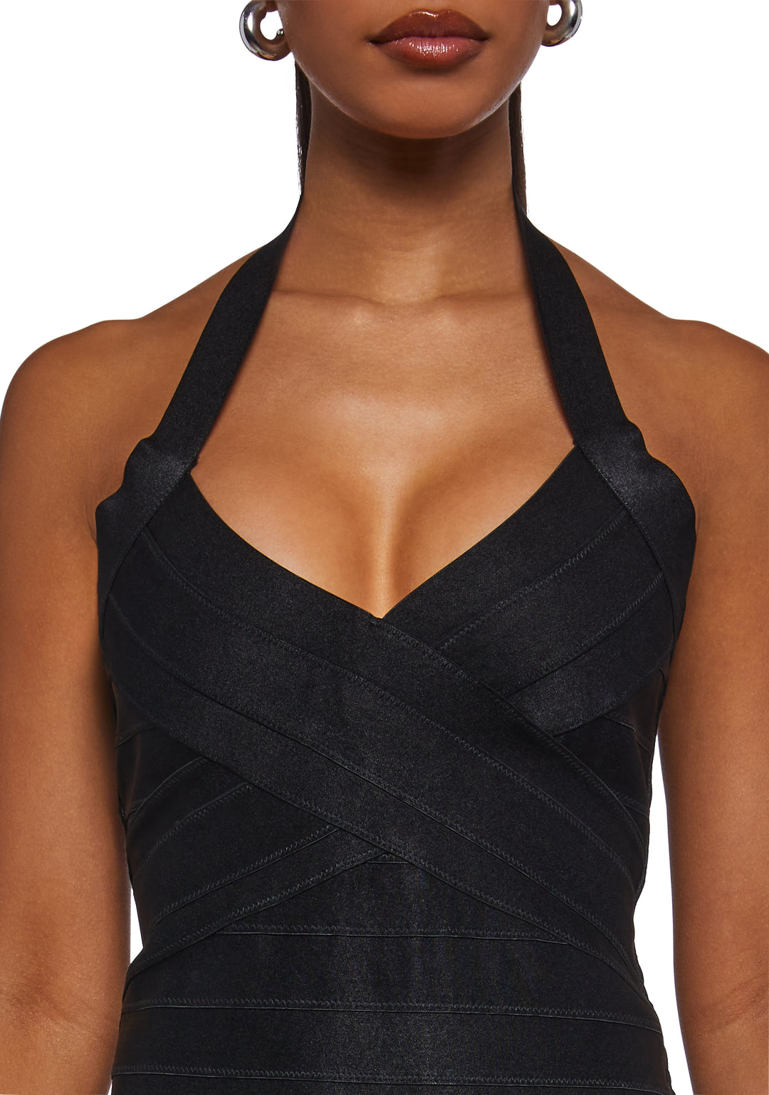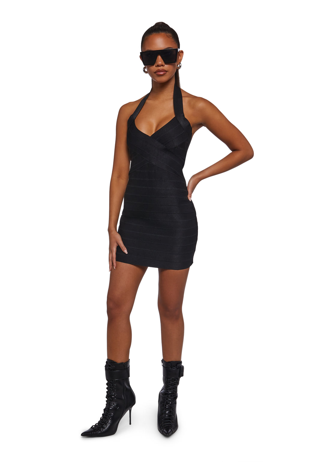 Command attention with this sleek, sculpting mini dress designed to highlight every curve. Featuring a halter neckline and bandage-style paneling, it delivers a bold, body-hugging silhouette perfect for nights out and high-impact moments.
