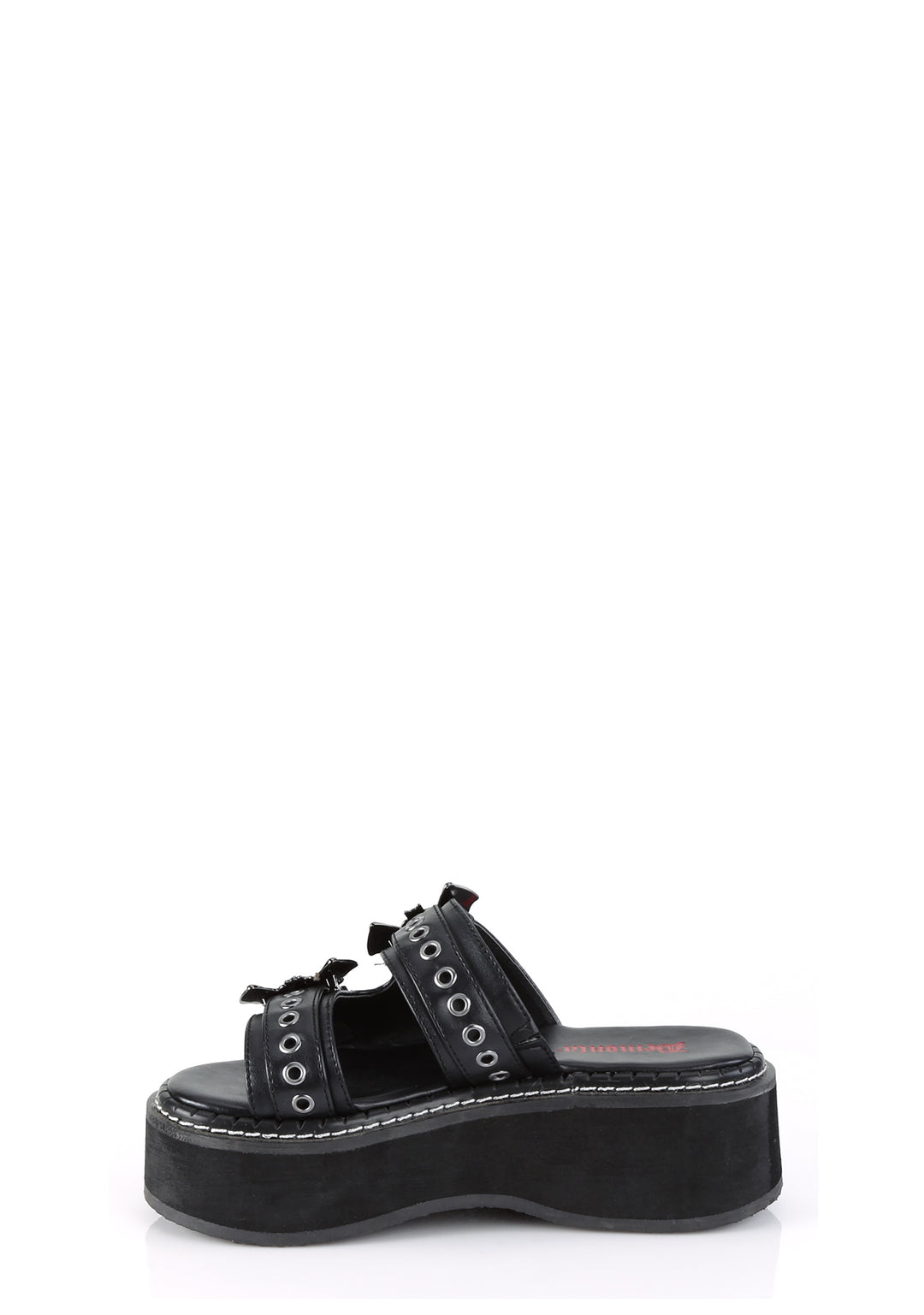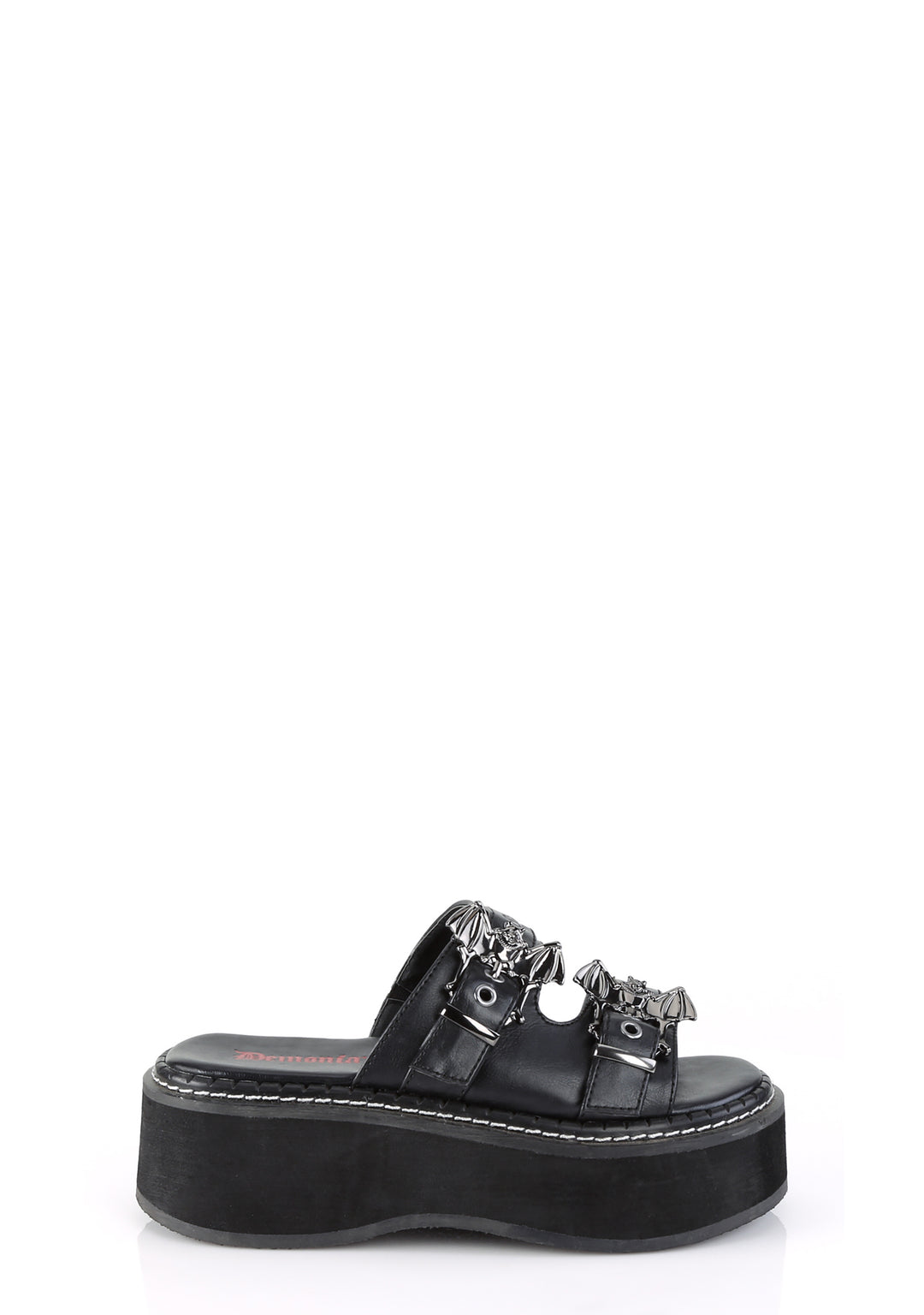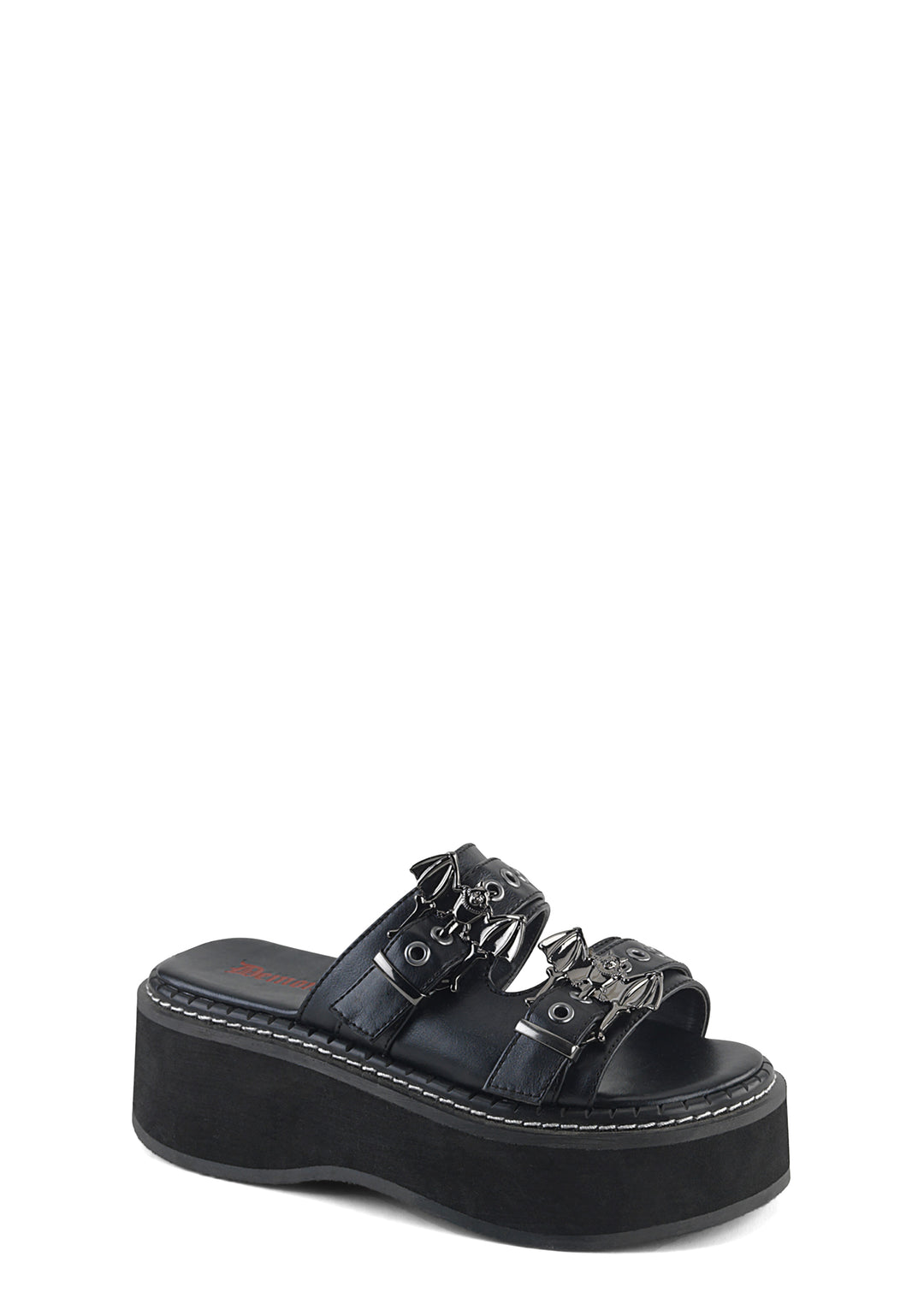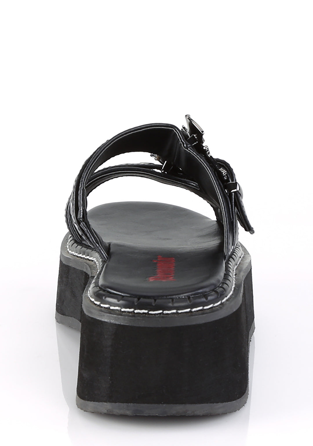 These platform sandals have a vegan leather construction, double straps with bat buckles on the uppers, and a slip on fit.