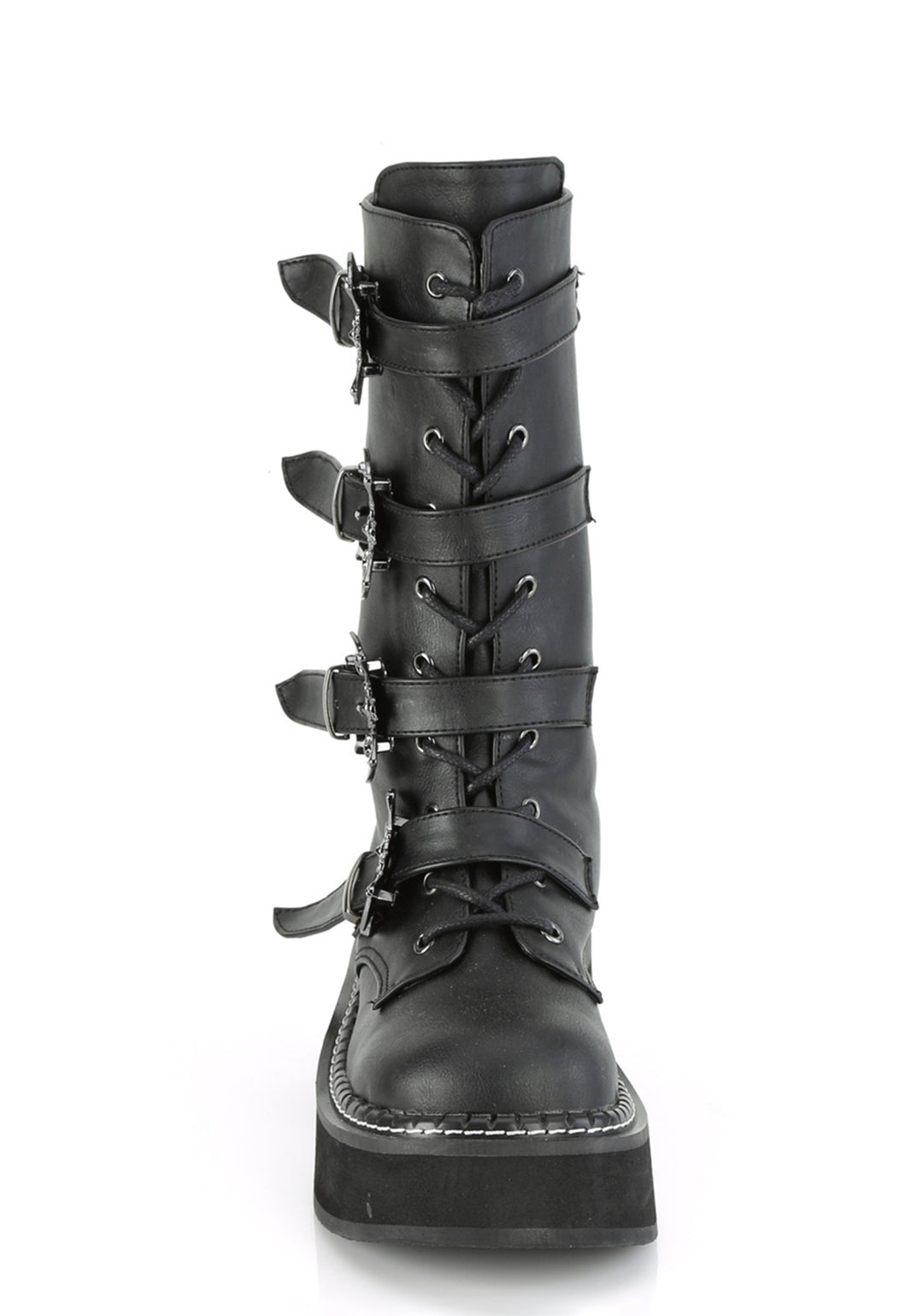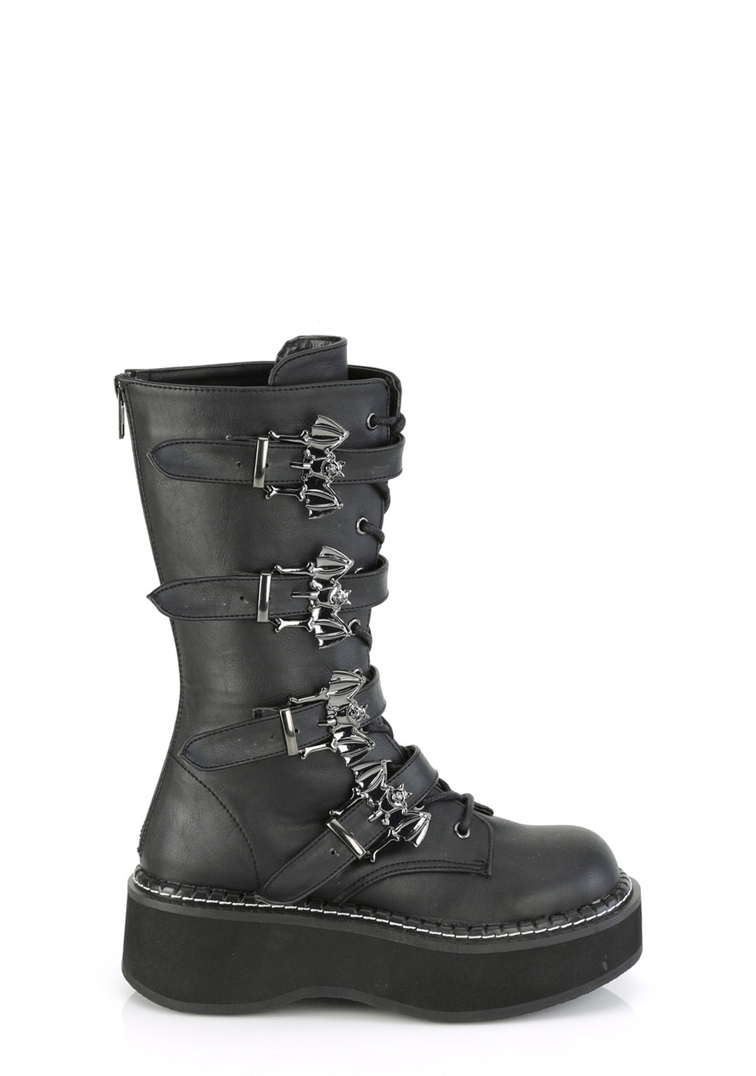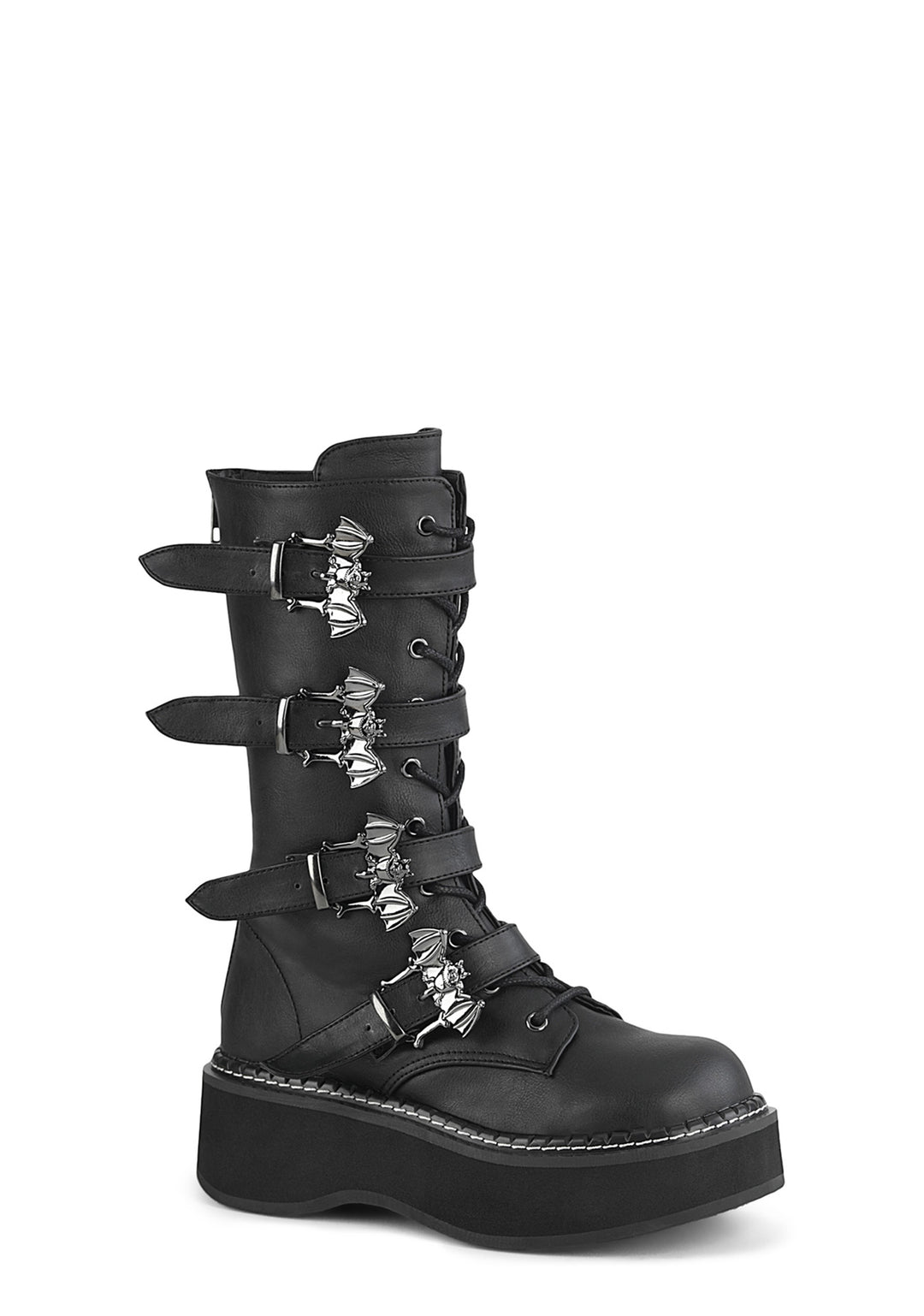 cuz you thrive in the darkness. These hellish mid-calf boots have a vegan leather construction, lace up fronts, buckle straps with bat-shaped closures, and platform soles.