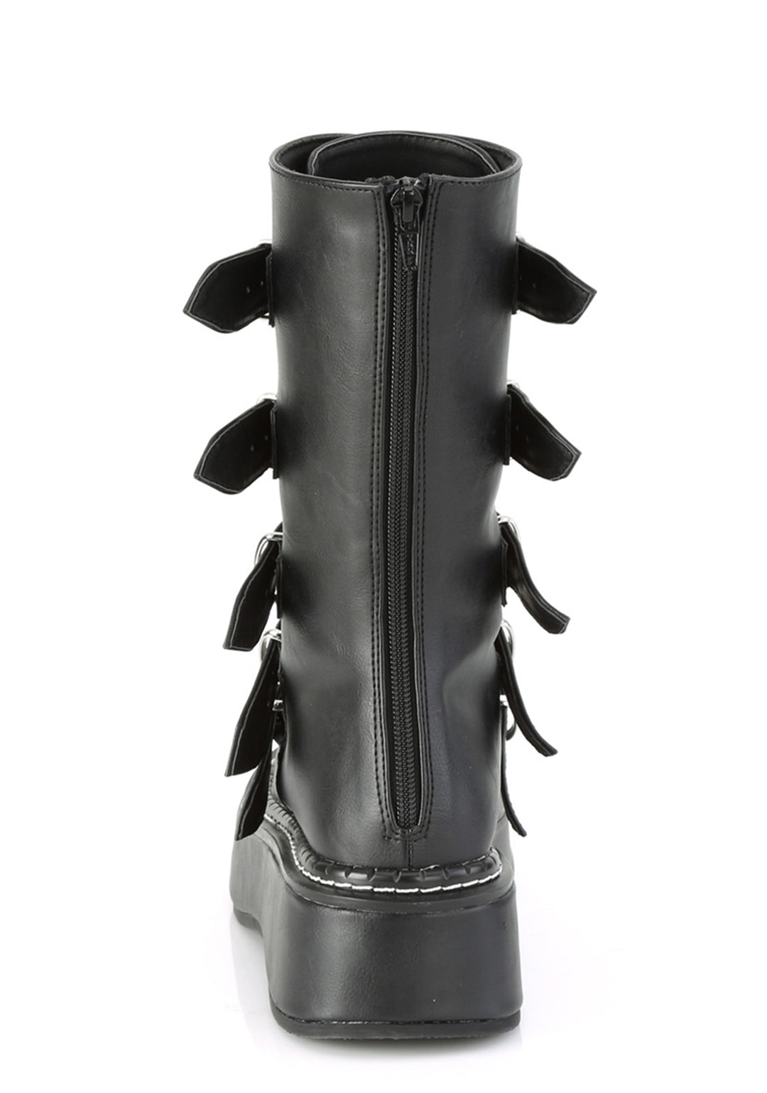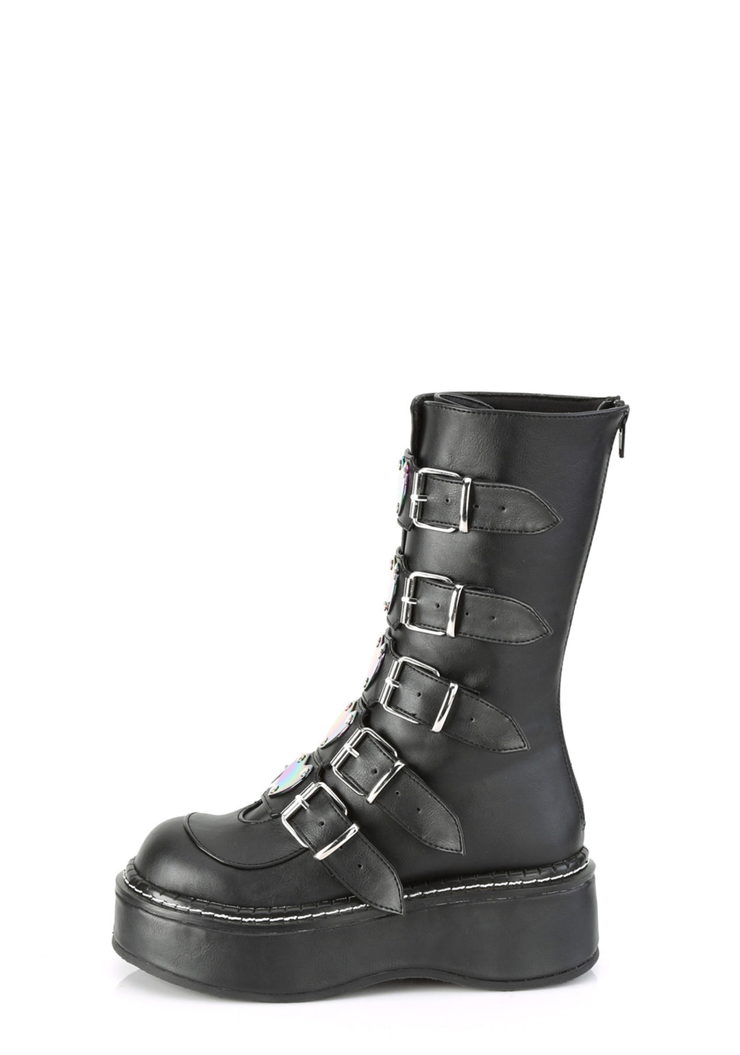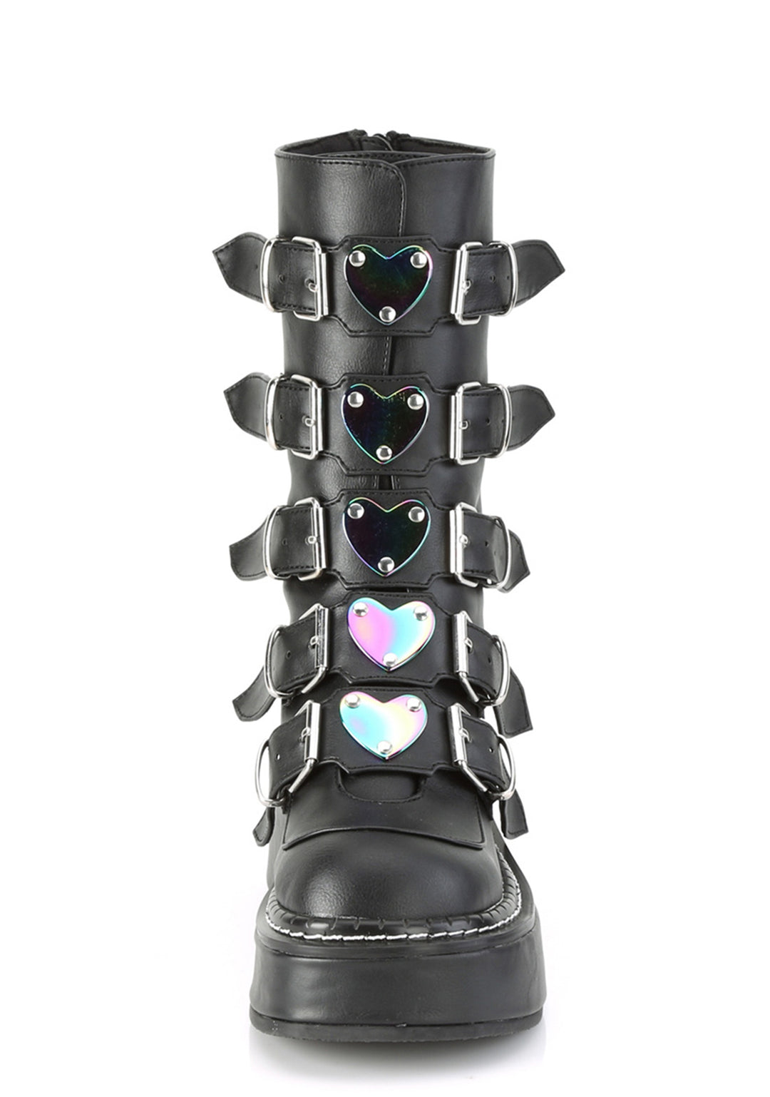 cuz love don’t pay the bills! Shatter the love gamez in these holographic platform buckle boots that have a vegan leather construction with oil slick iridescent heart-shaped plates and back zip closures.