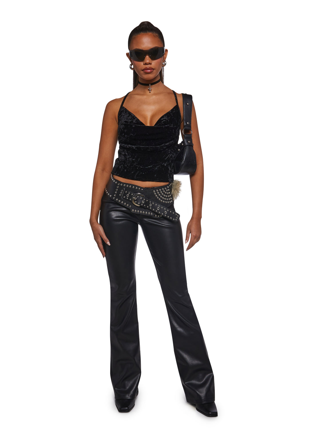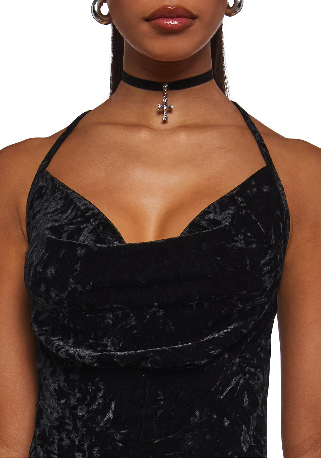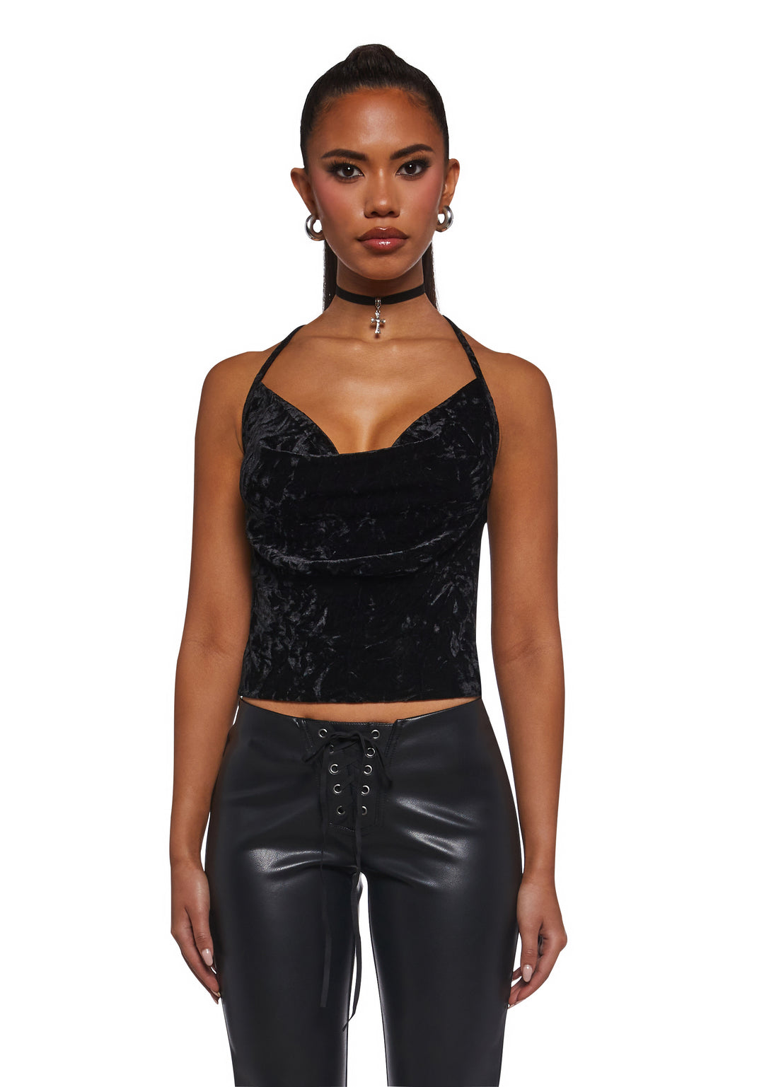 Turn up the glam in this luxe velvet halter top featuring a soft draped cowl neckline, adjustable straps, and a sleek cropped fit perfect for night-out looks.