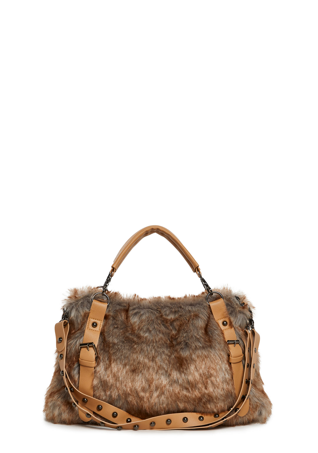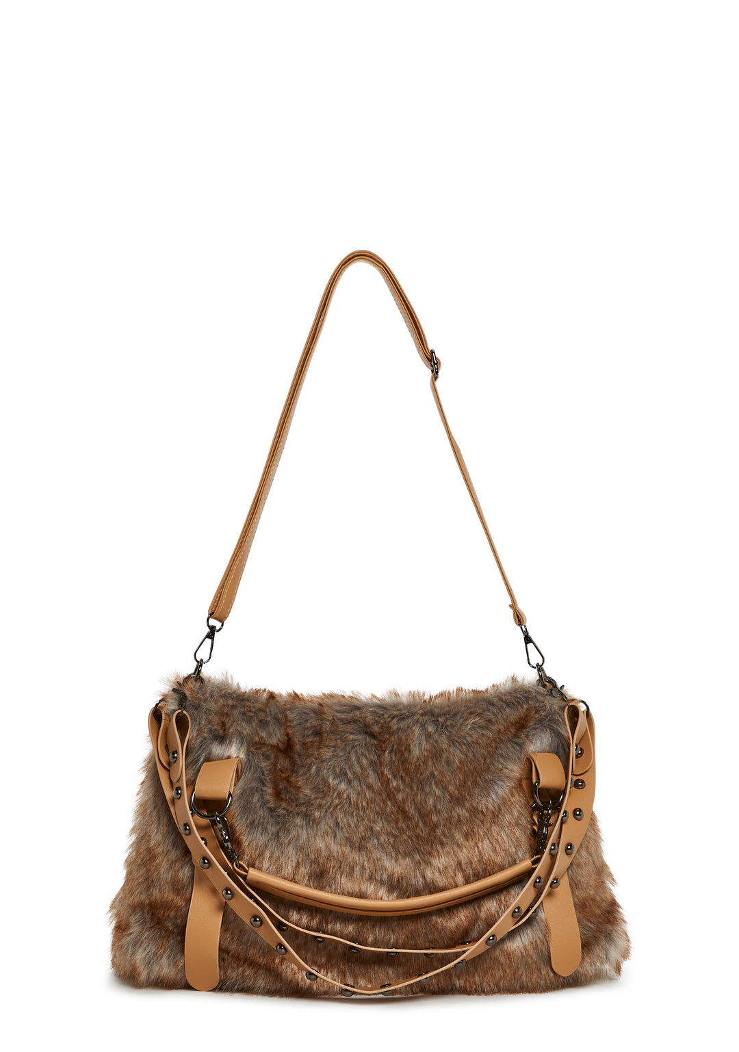 Turn heads with this statement faux fur handbag featuring a plush textured body, smooth vegan-leather straps, and edgy studded detailing. Designed for both style and function, this oversized tote brings cozy, winter-ready vibes to any outfit.