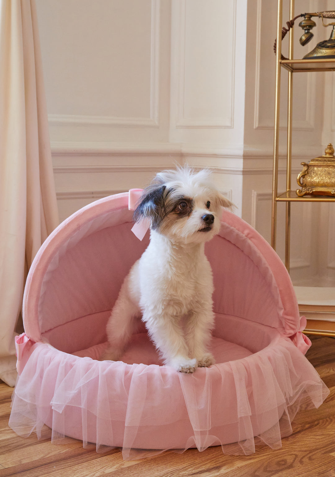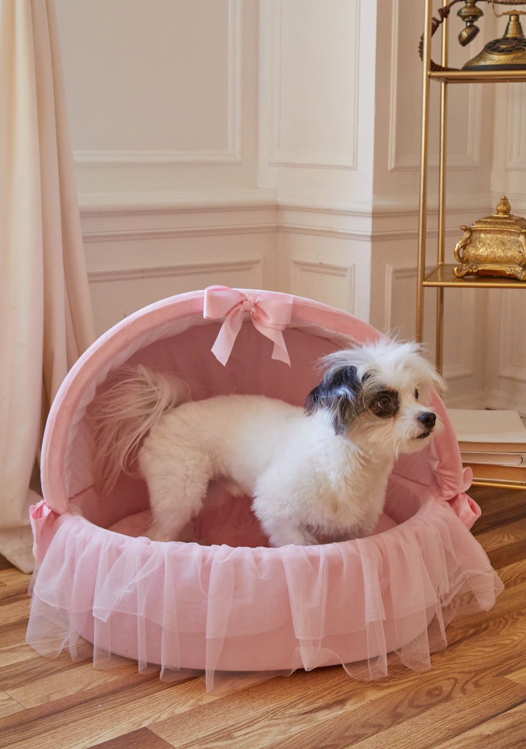 Treat your pet like a princess with this plush faux fur pet bed that has ruffled mesh detailing and satin bow appliques.