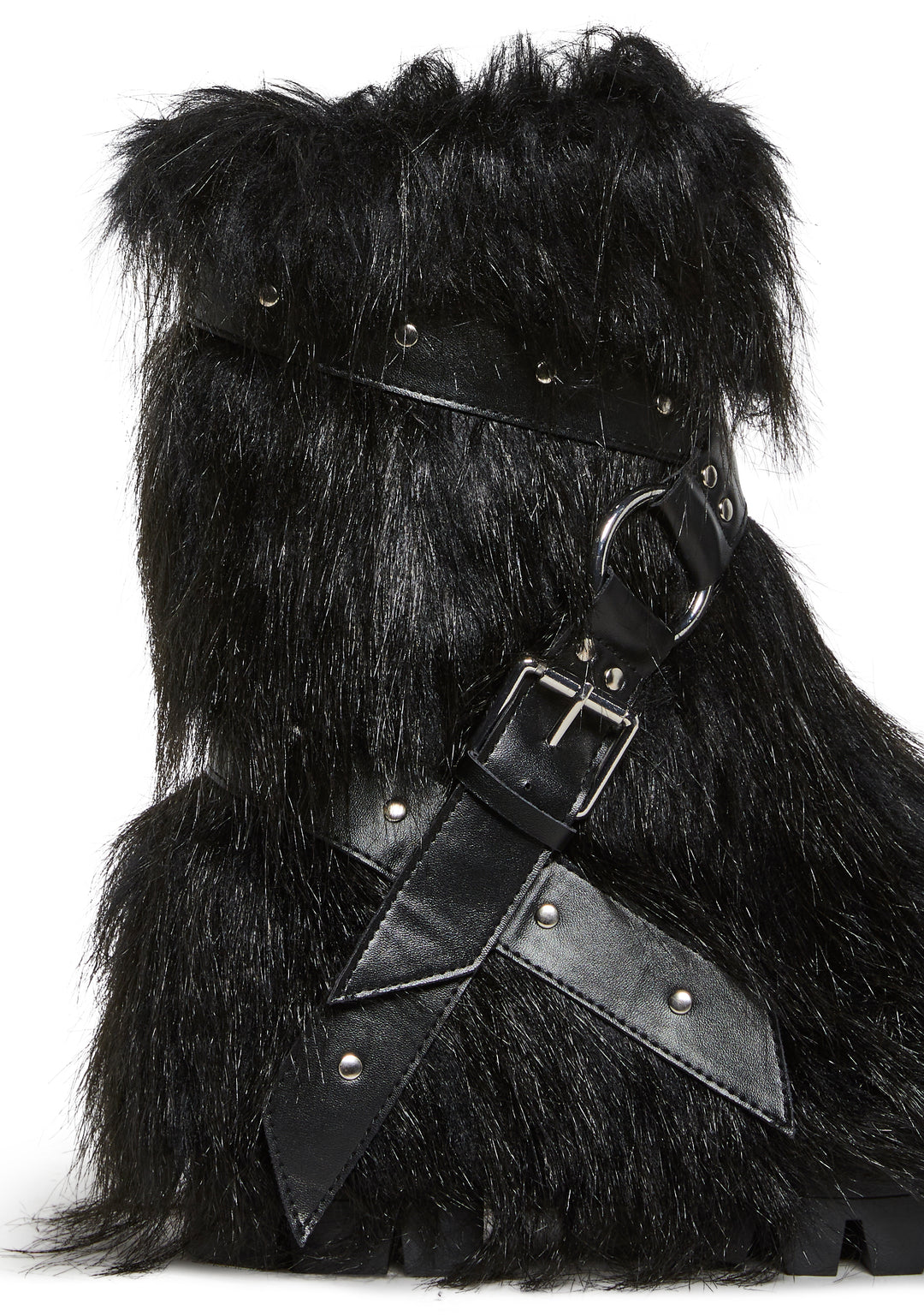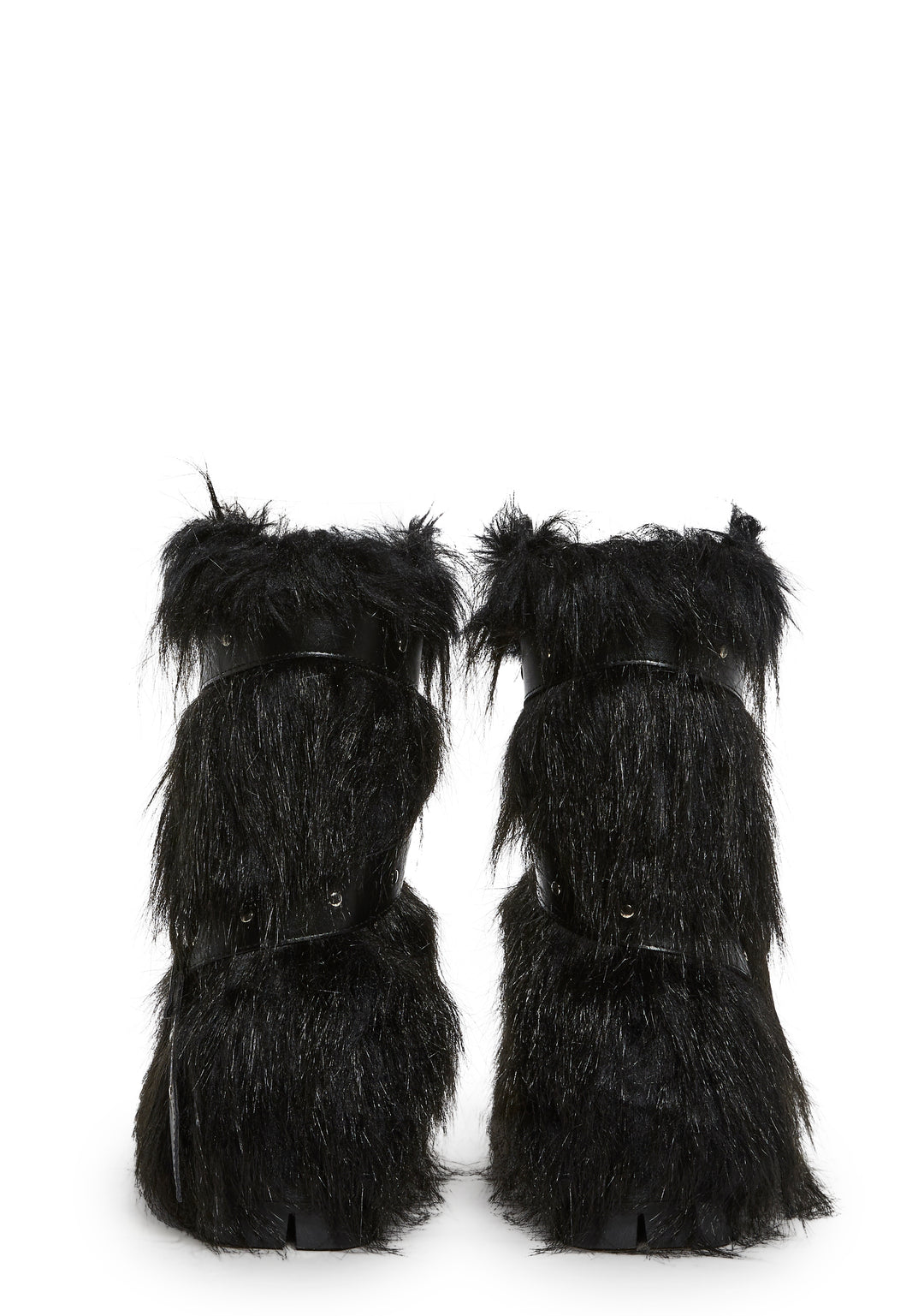 These combat boots have a faux fur construction, a pull-on fit, wedge platform soles, and adjustable wrap buckle straps with O-ring hardware.