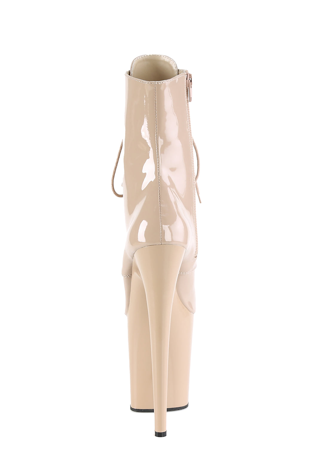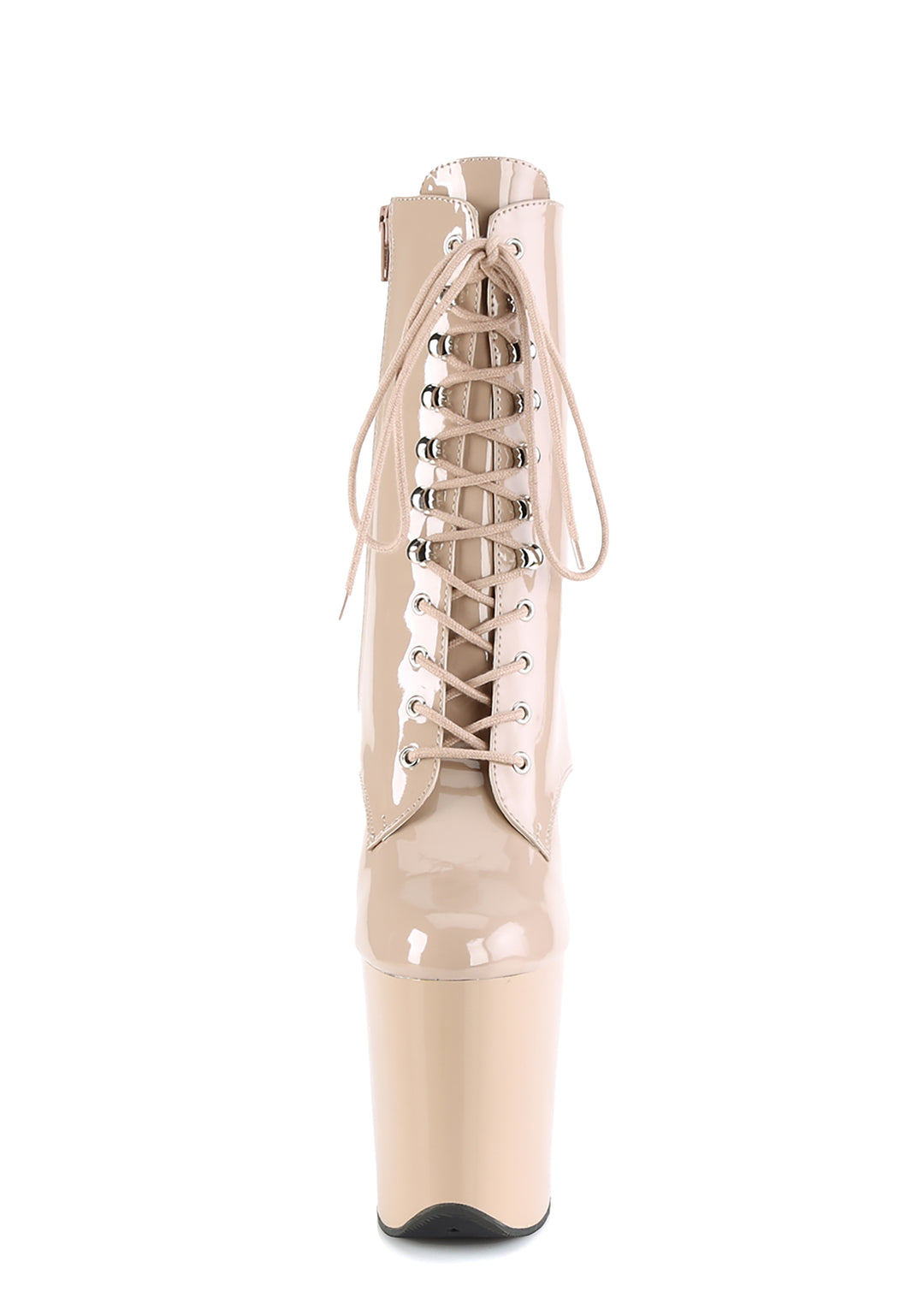 These boots have a vinyl construction, front lace-ups, platform soles, stiletto heels, and side zipper closures.