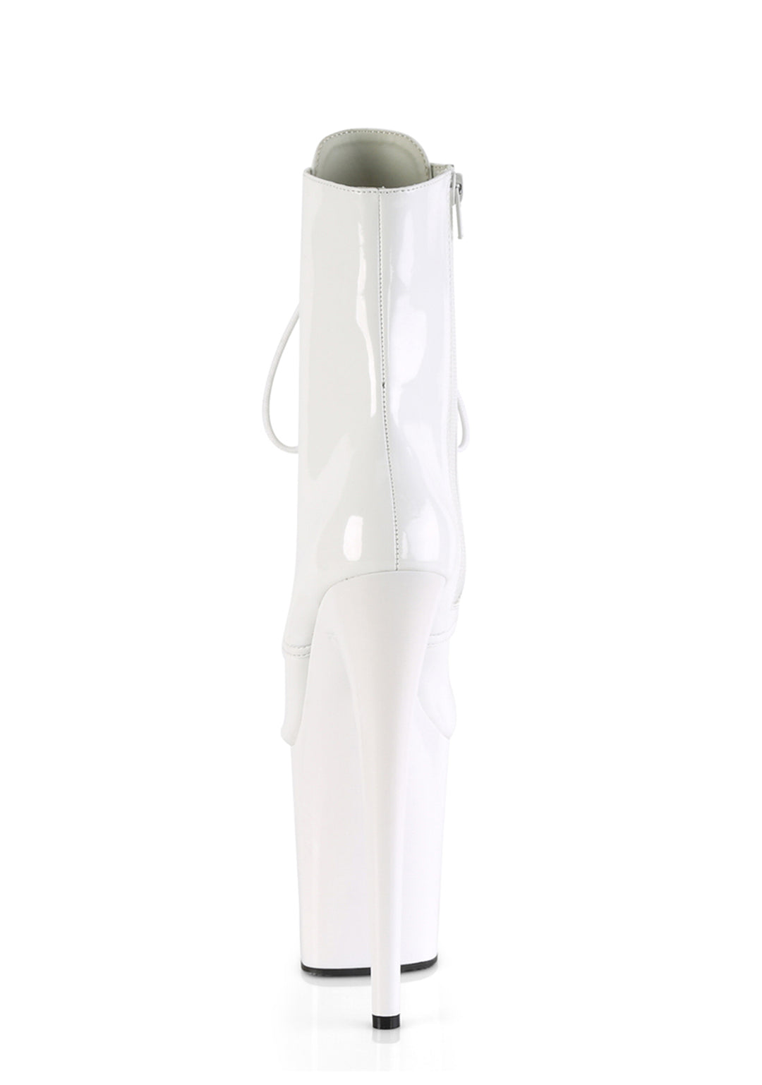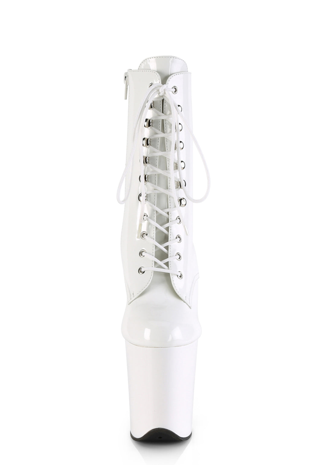 These boots have a vinyl construction, front lace-ups, platform soles, stiletto heels, and side zipper closures.