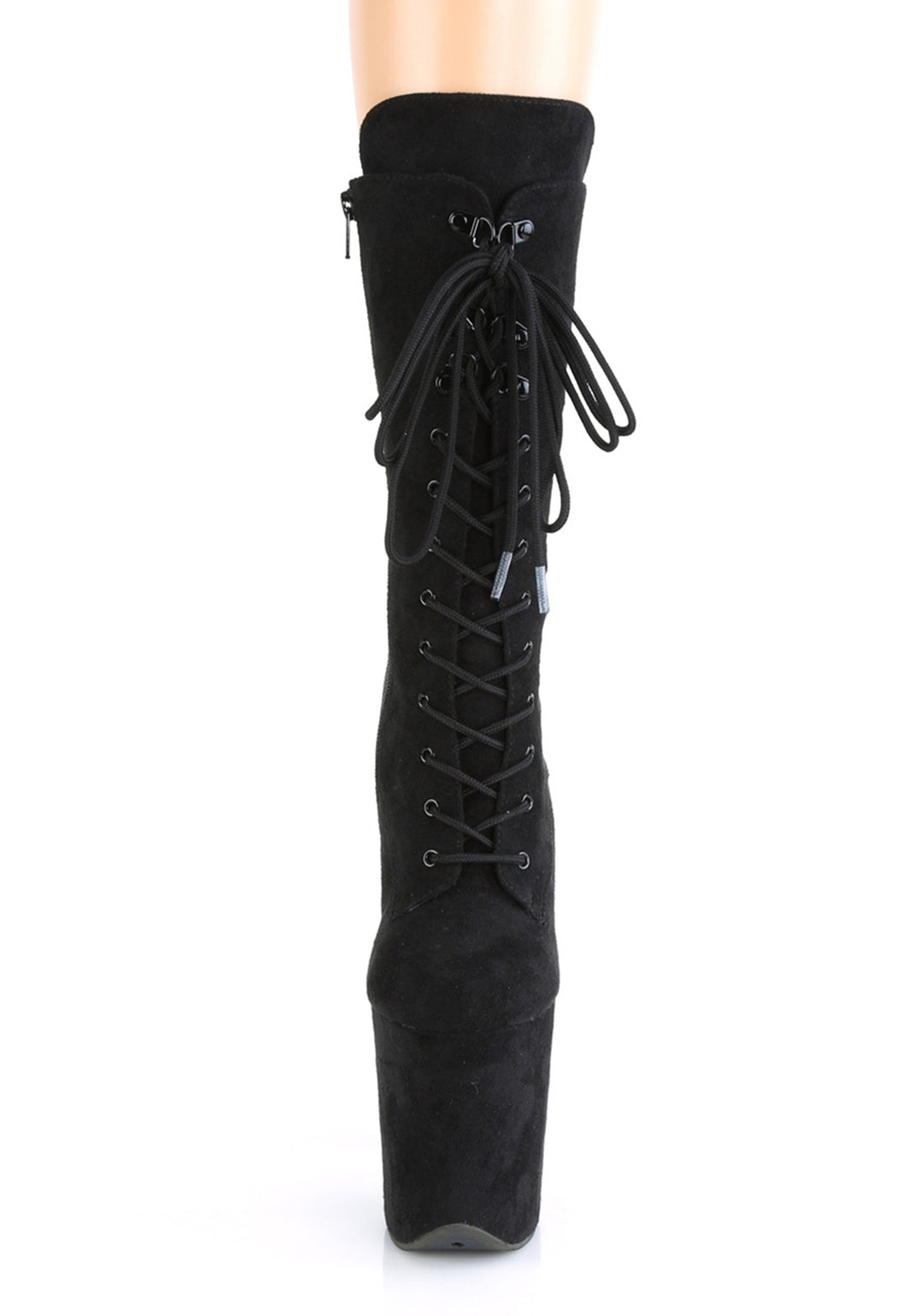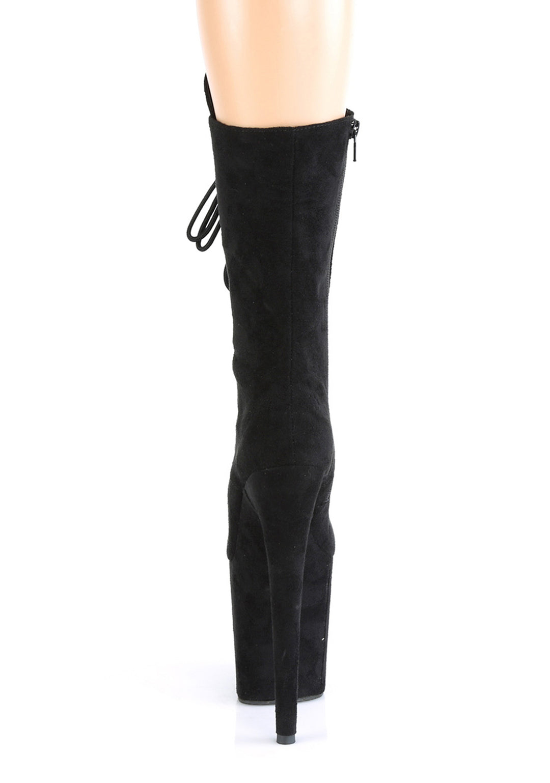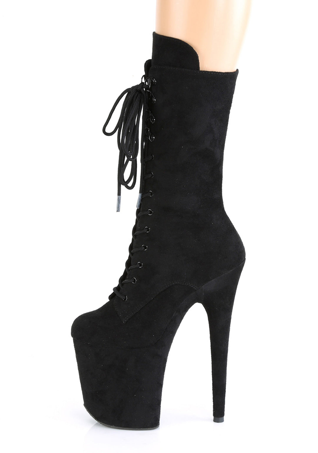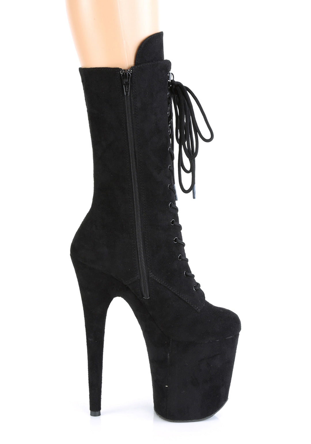 These shoes have a faux suede construction, platform soles, stiletto heels, front lace-ups, and side zipper closures.