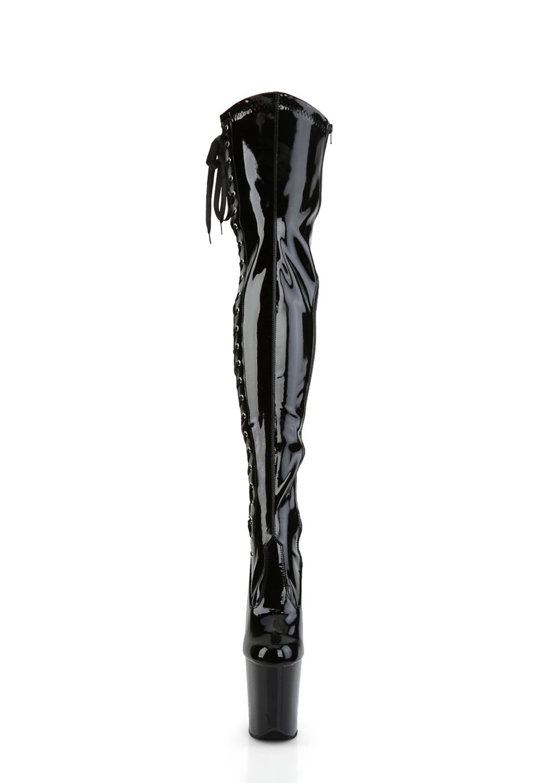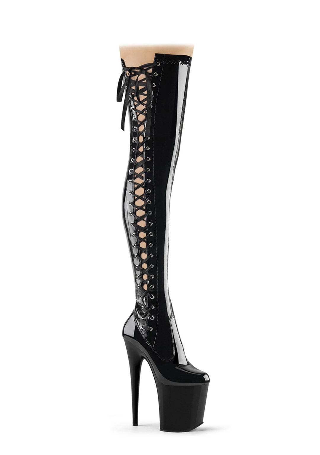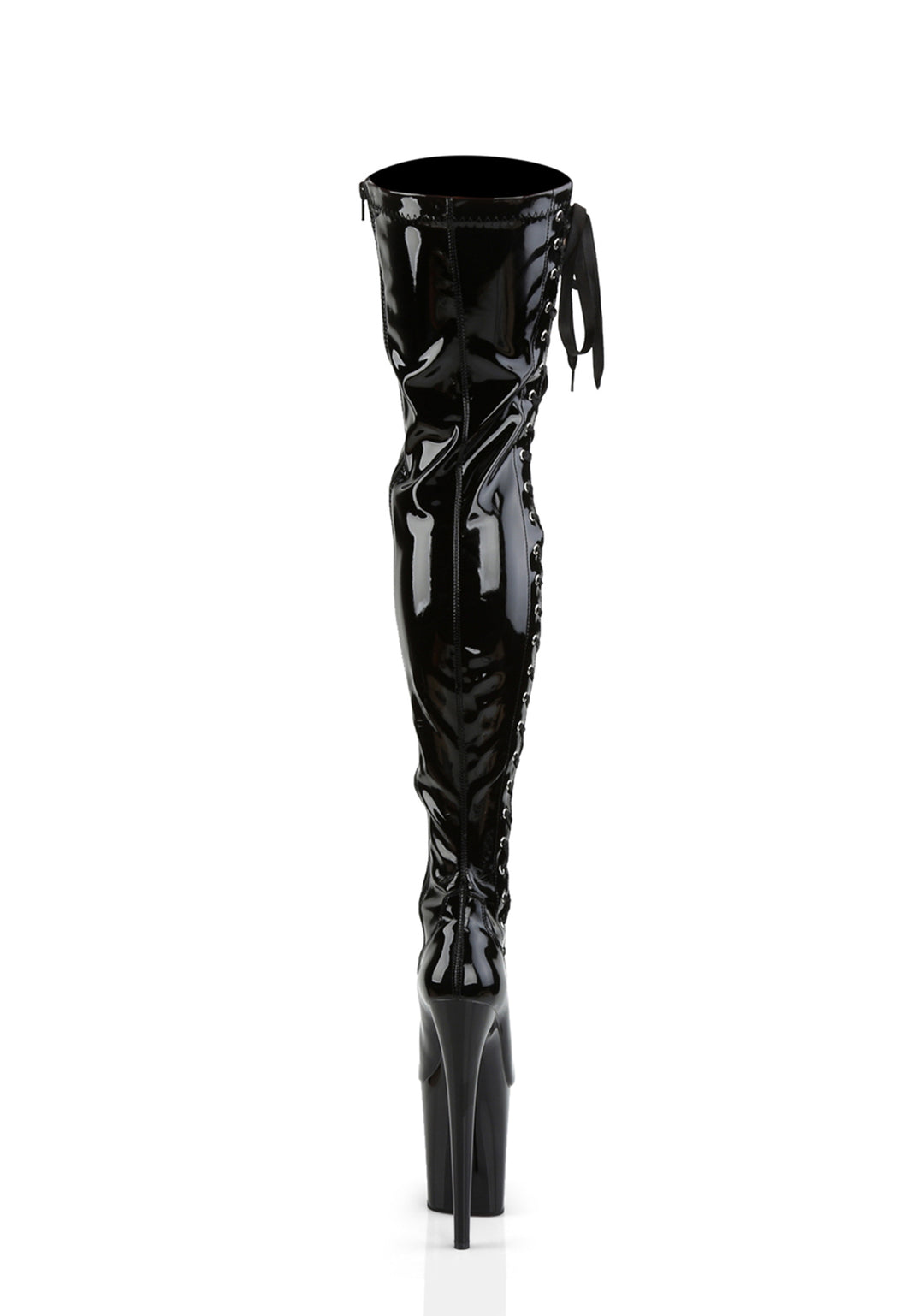 These vinyl stretch boots have platform soles, stiletto heels, ribbon lace-ups, and side zipper closures.