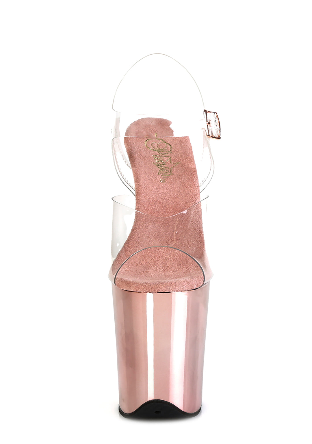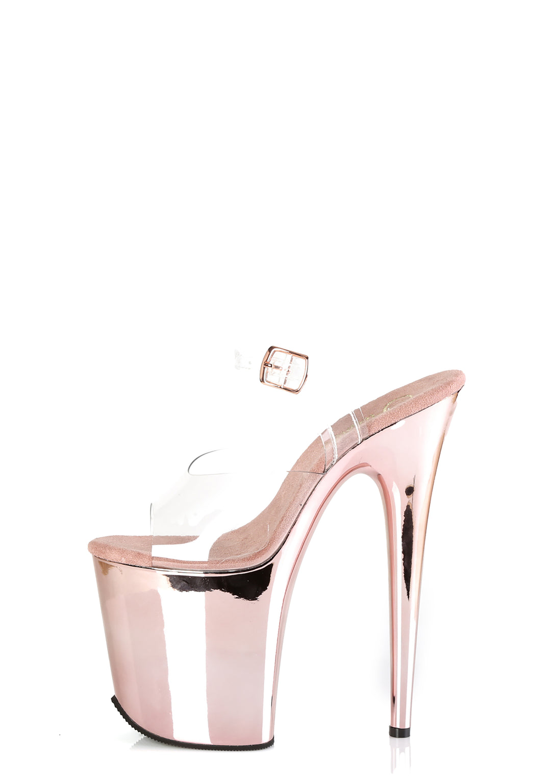 These platform sandals have clear vinyl uppers, a peep toe design, chrome plated platform soles and stiletto heels, and adjustable ankle buckle strap closures.