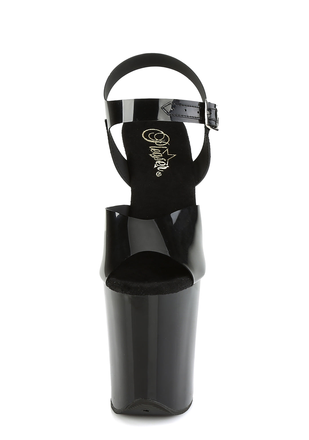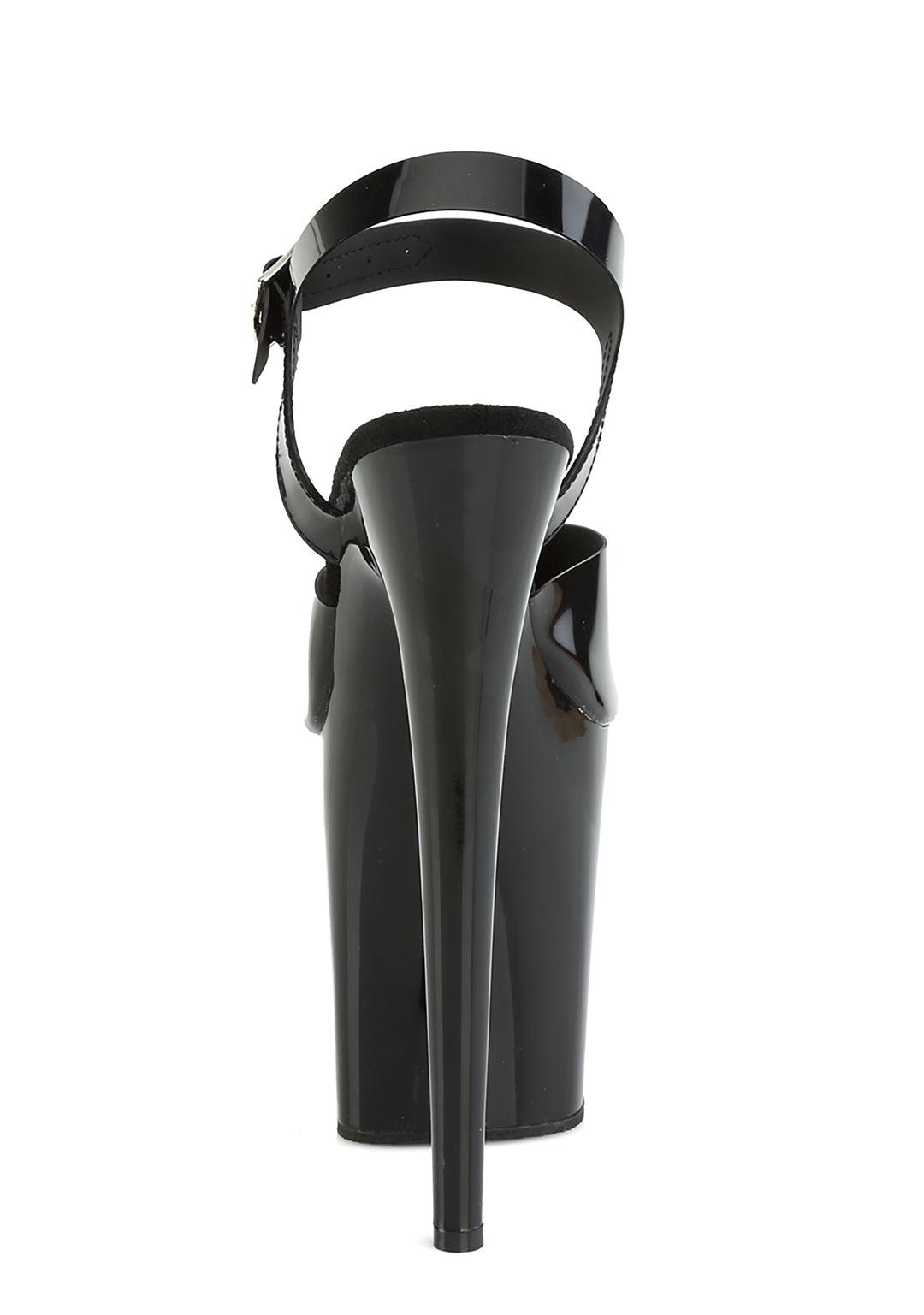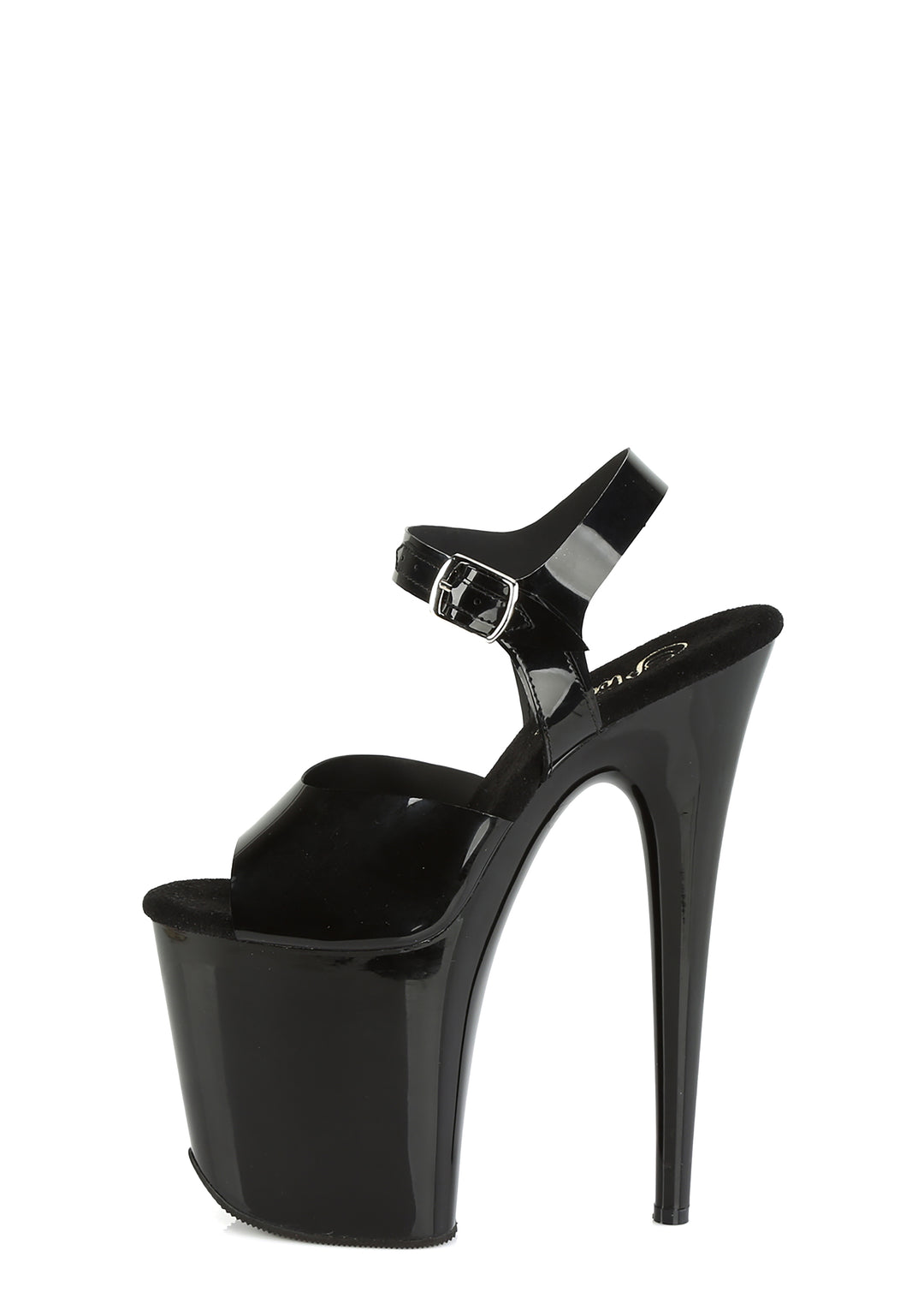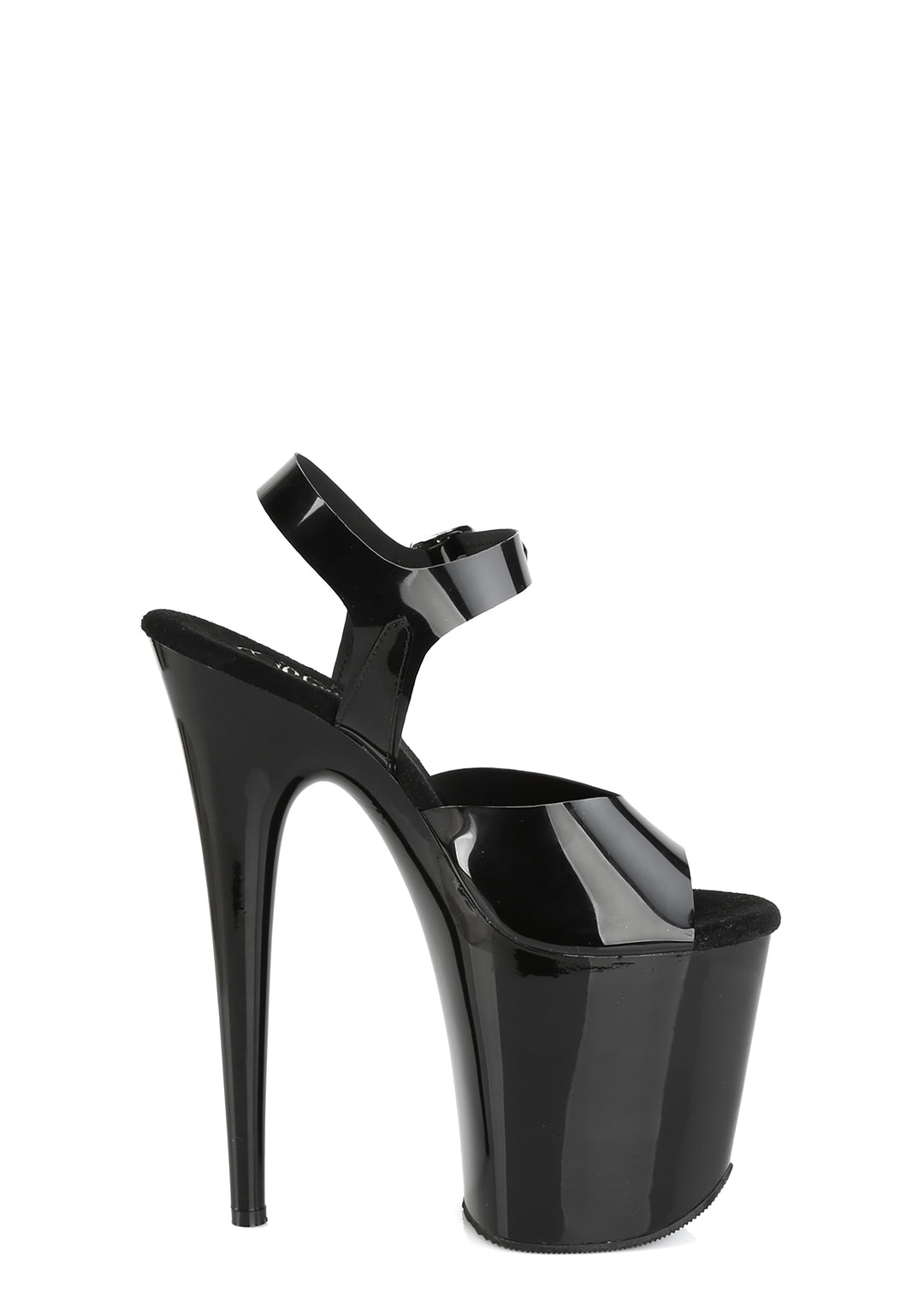 These platform sandals have vinyl uppers, a peep toe design, platform soles, stiletto heels, and adjustable ankle buckle strap closures.