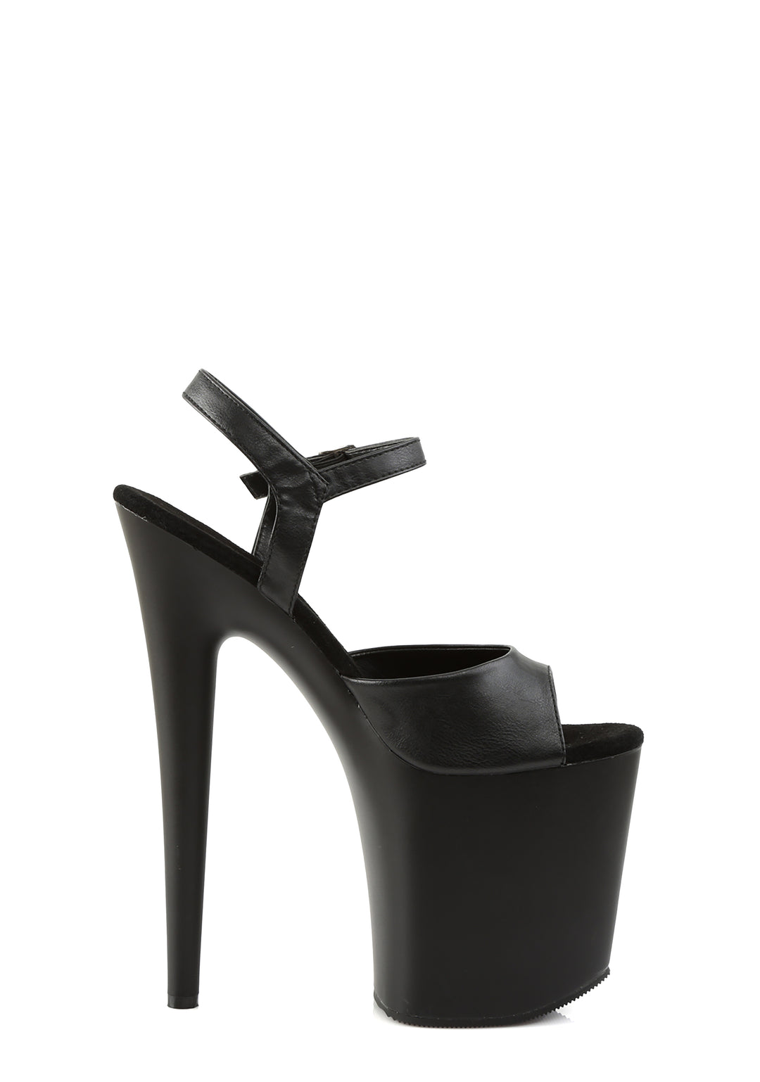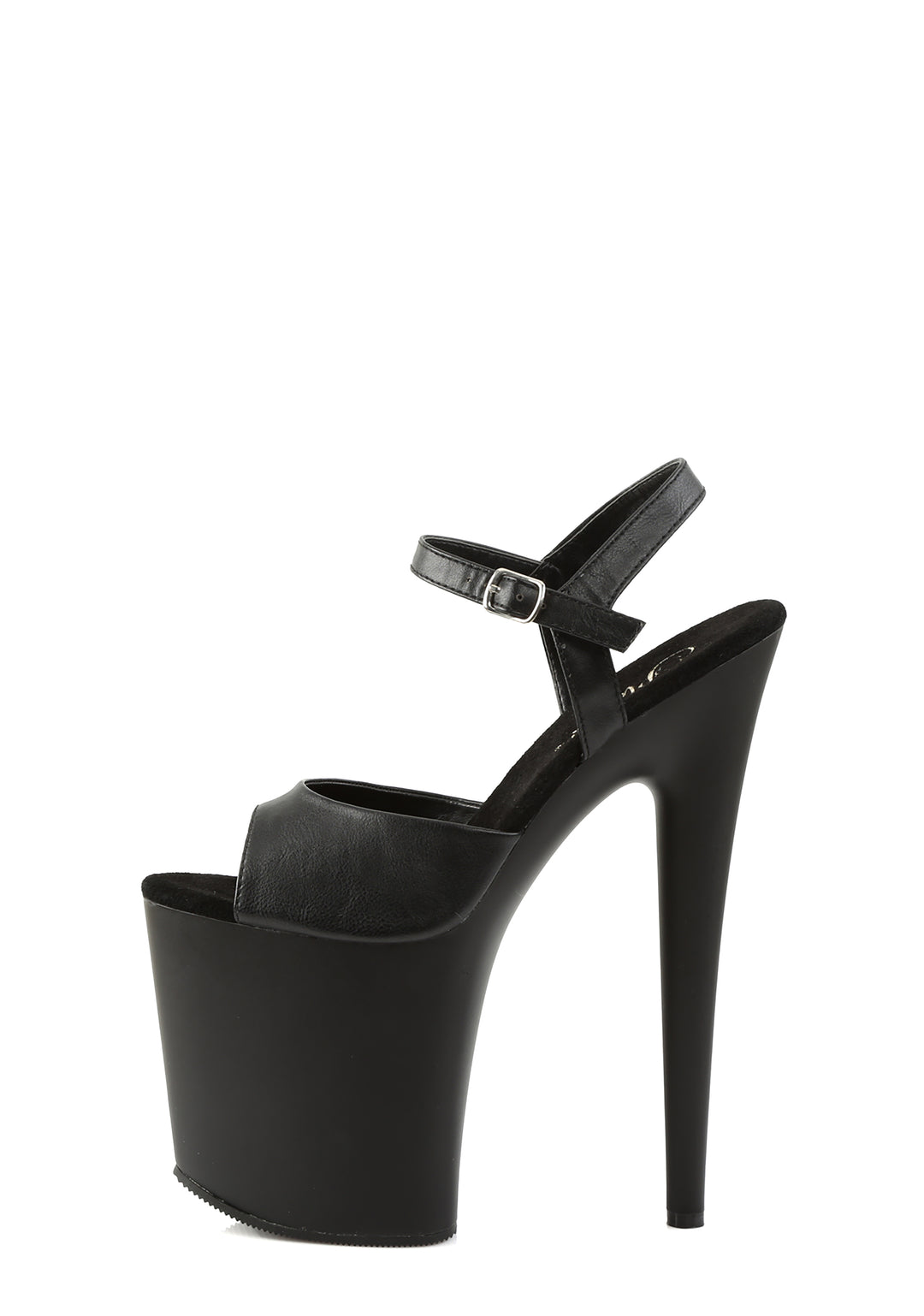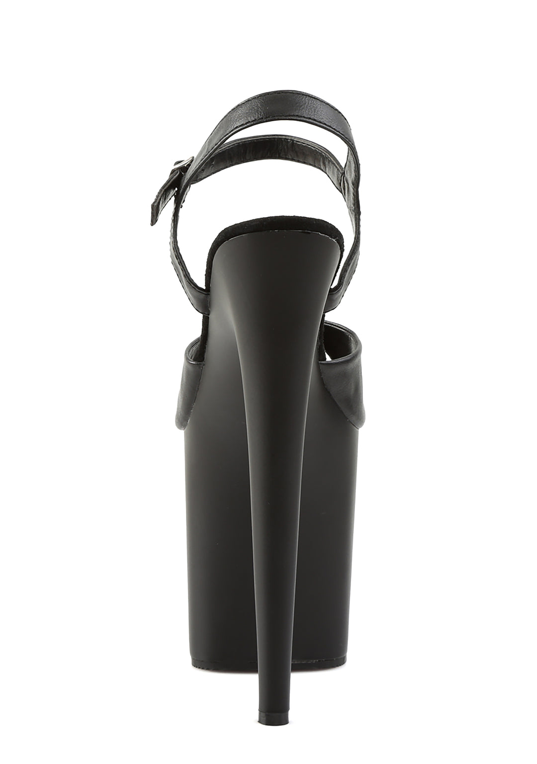 These sandals have a matte vegan leather construction, platform soles, stiletto heels, and adjustable buckle closures.