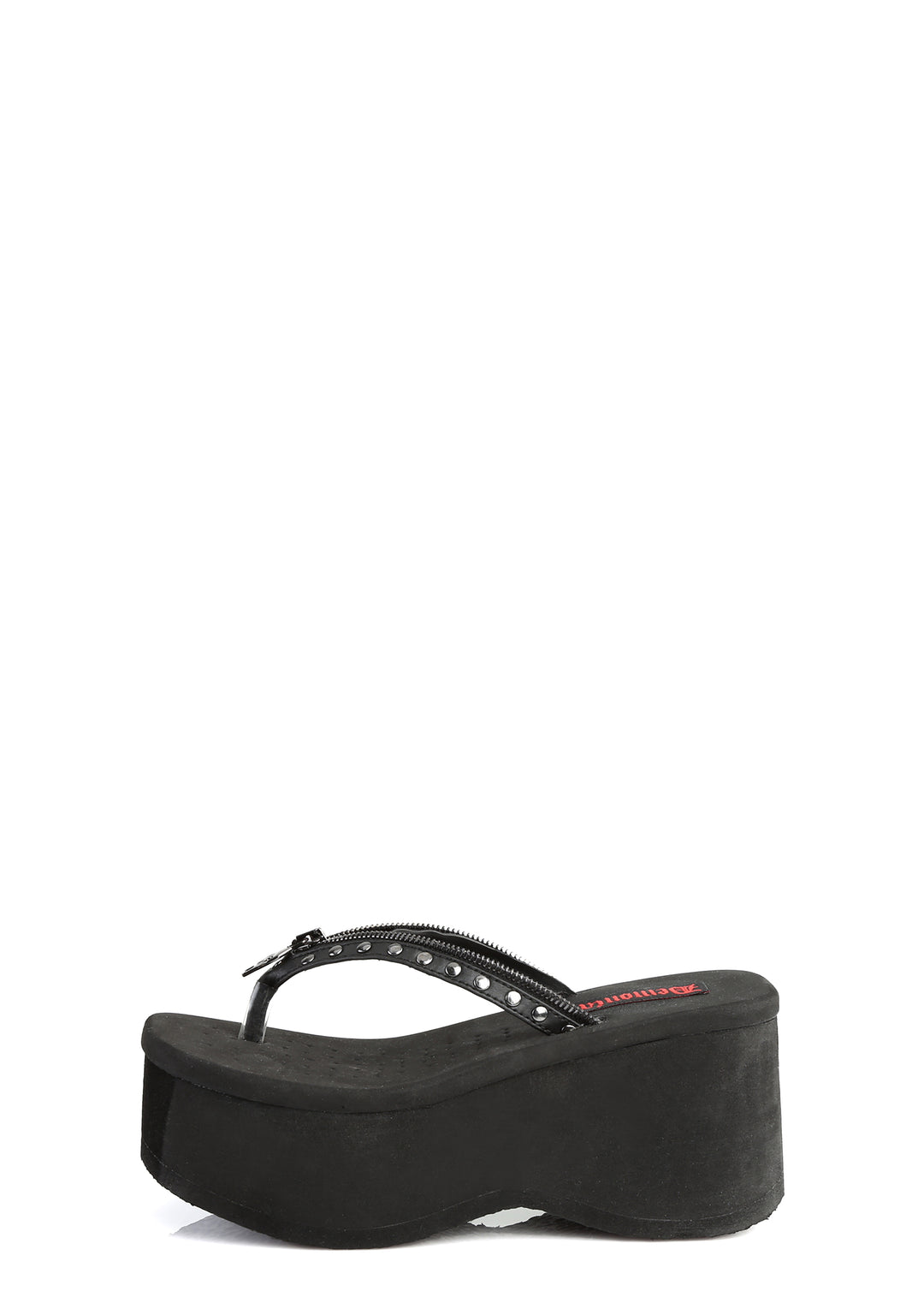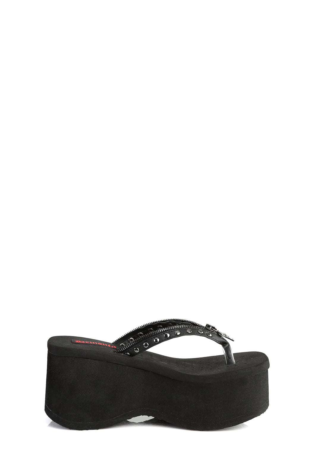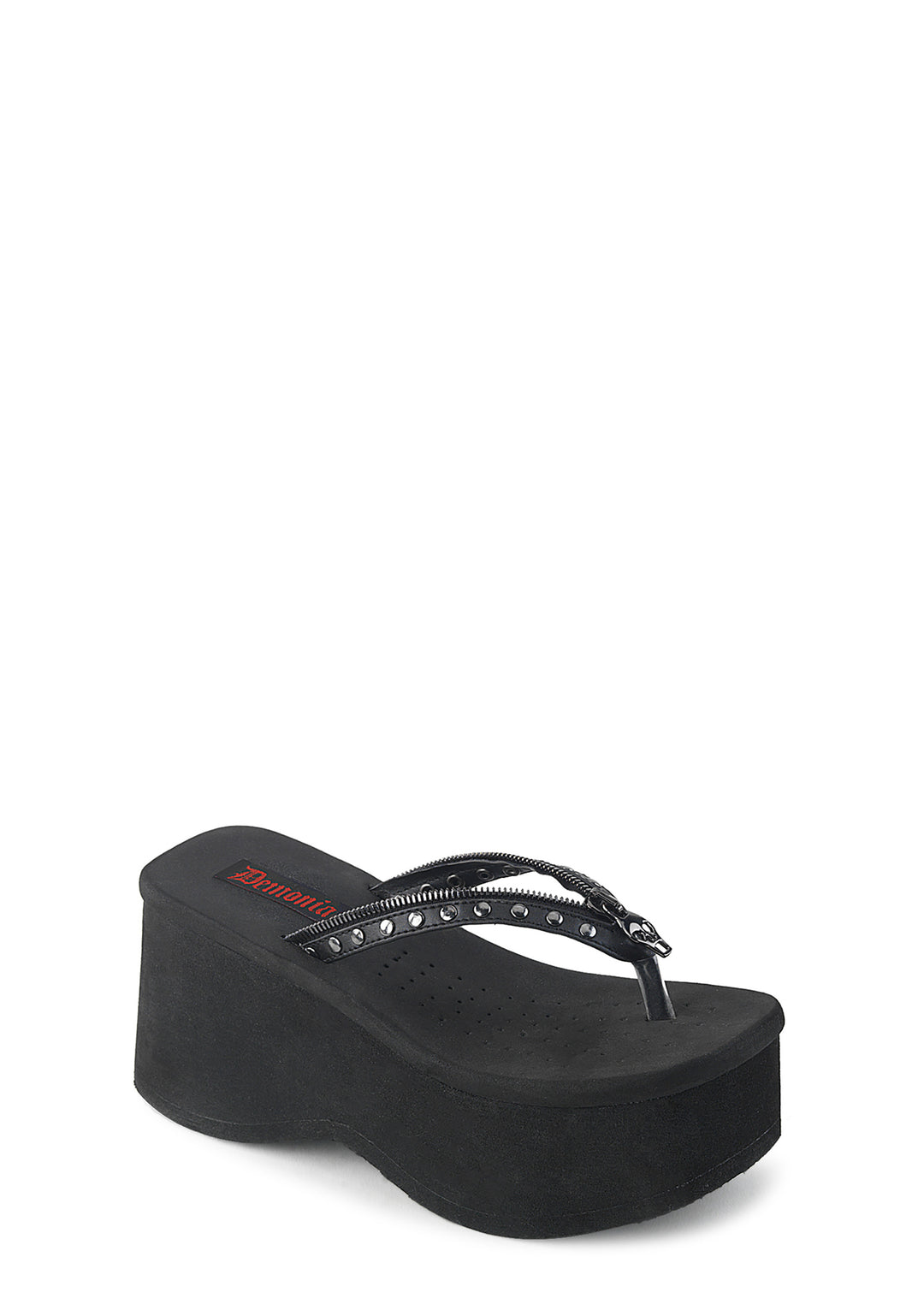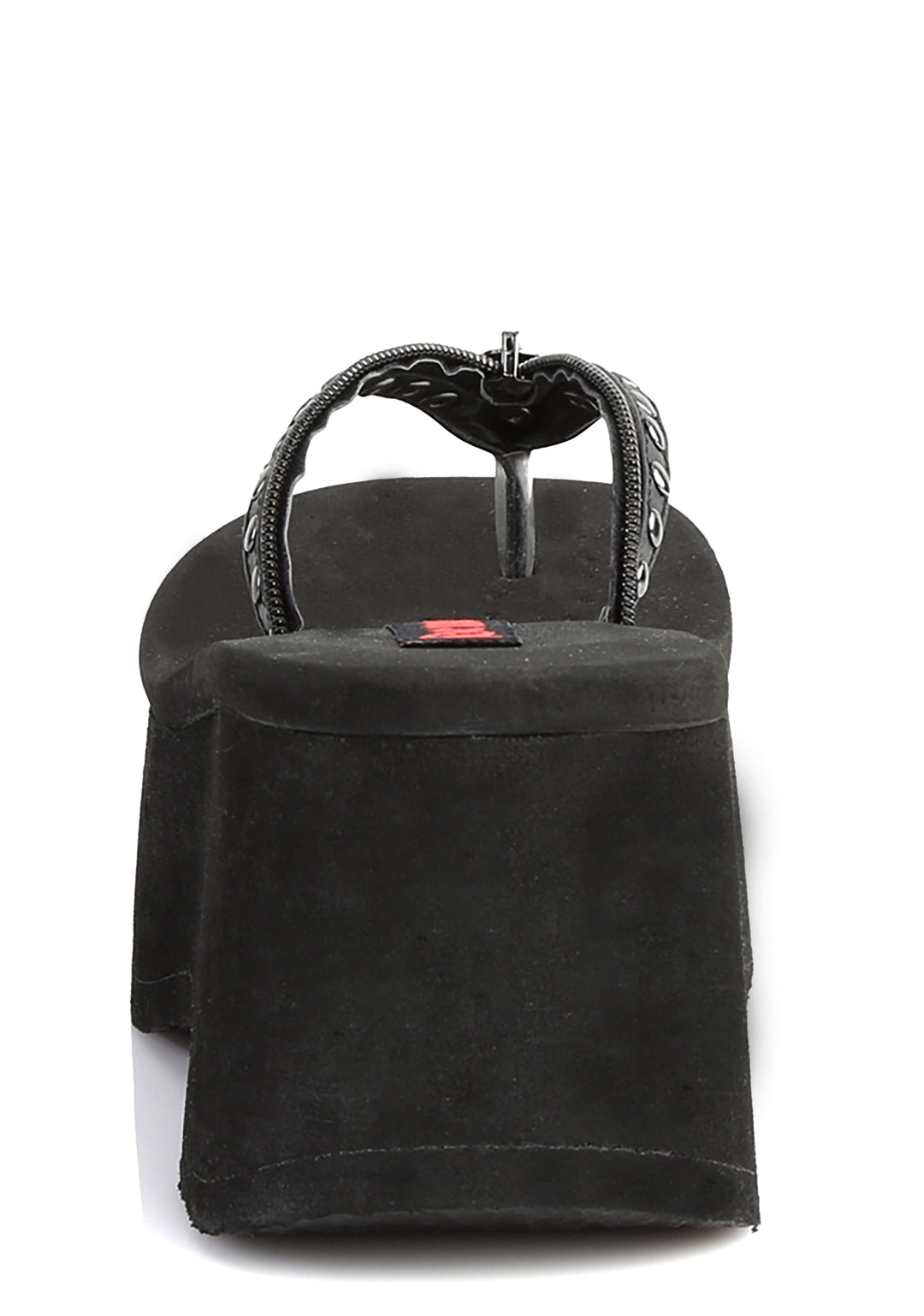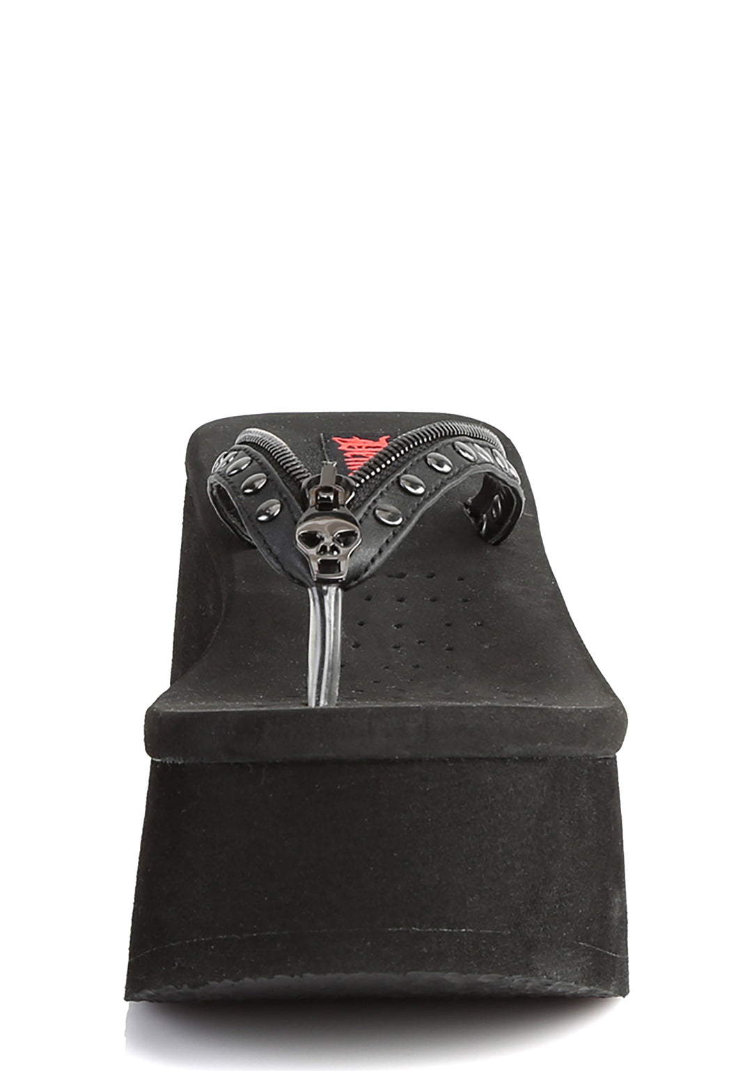 cuz the fun stops now. These platform studded thong sandals have a vegan leather construction and decorative zipper trim with skull head charms.