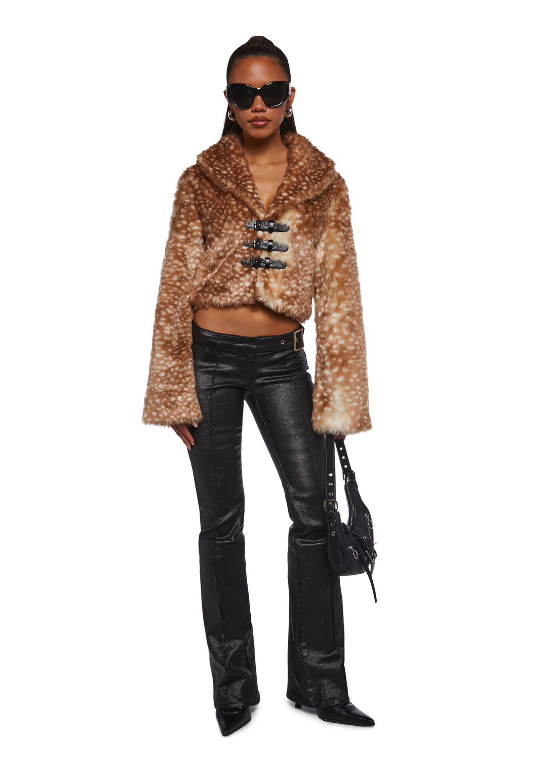 This jacket has a faux fur construction, an all over deer pattern, a notched lapel collar, long sleeves, a cropped fit, and front buckle closures.