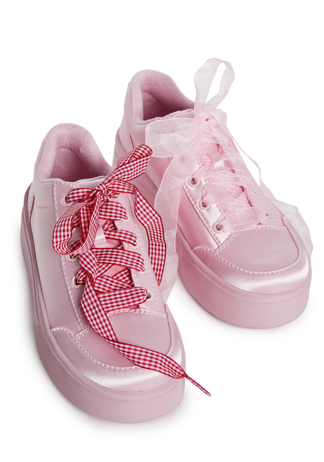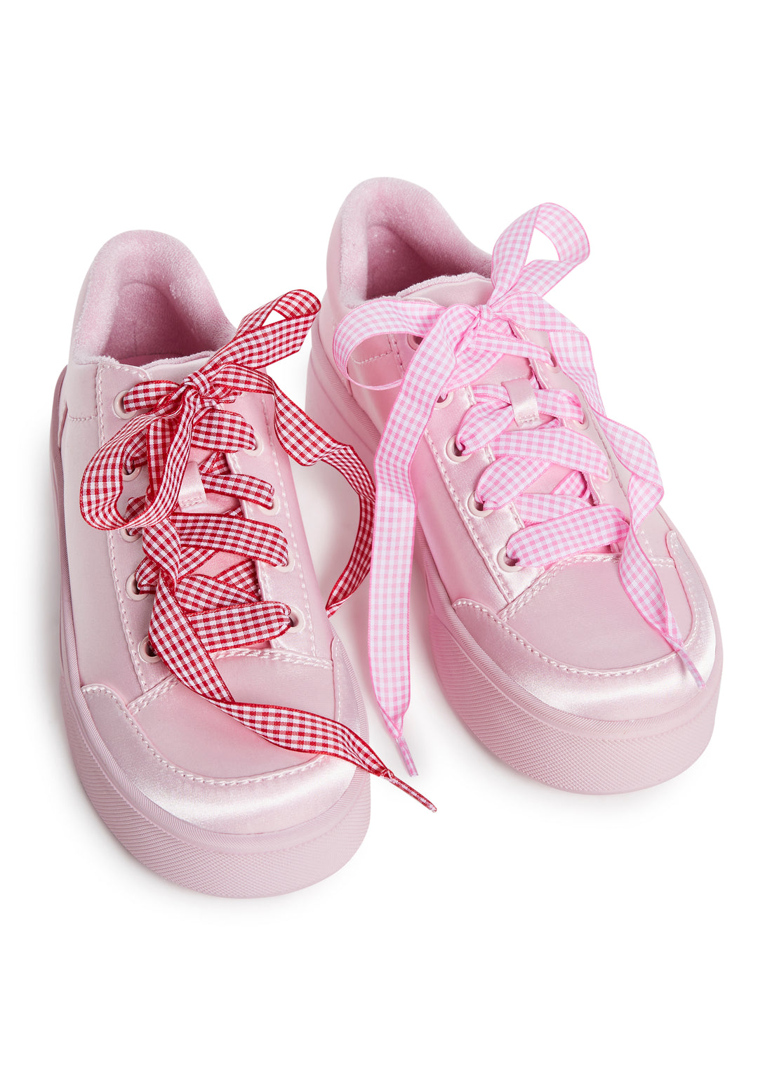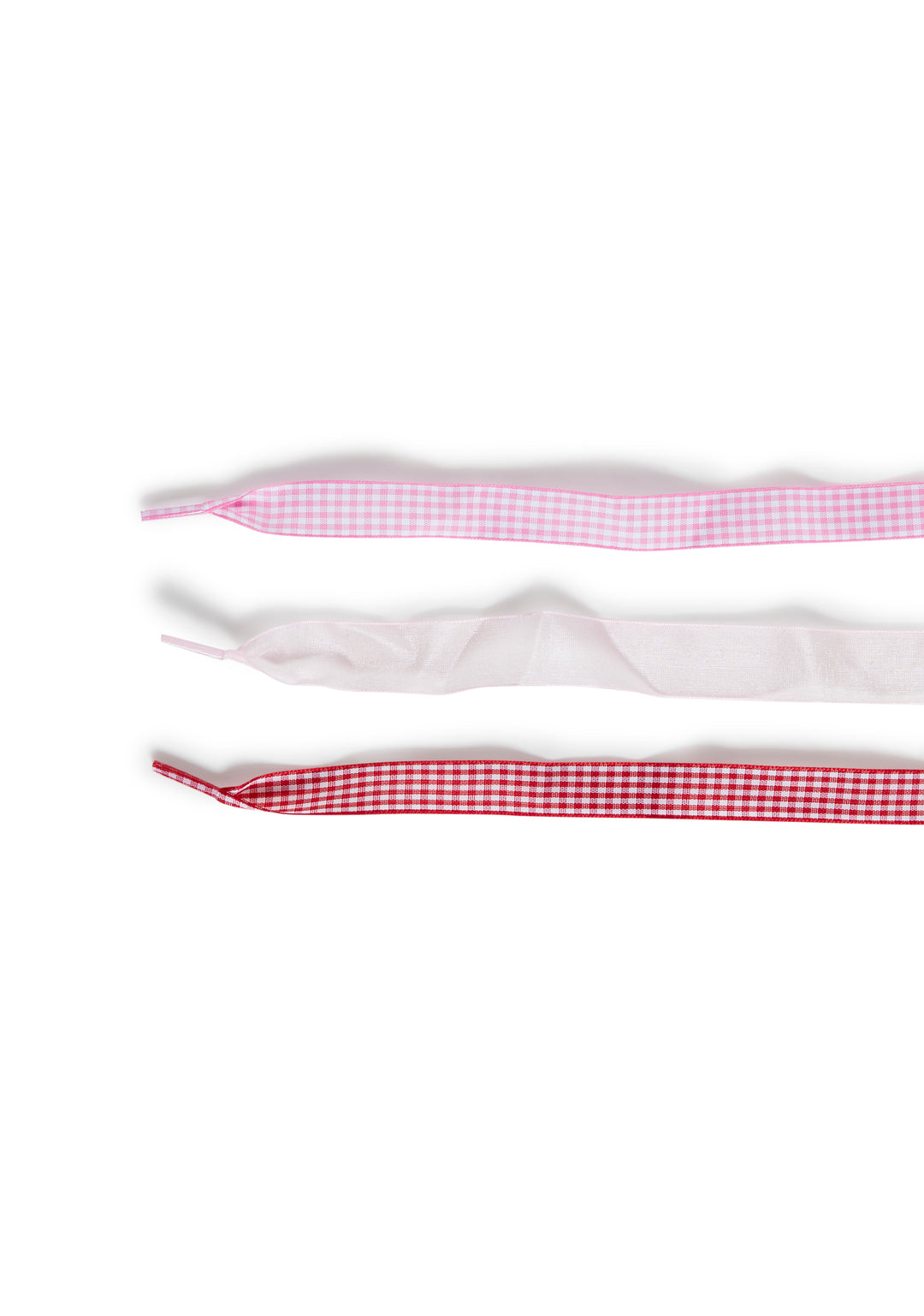 This shoe lace set includes two shoe laces with a gingham print and one with a sheer organza construction.