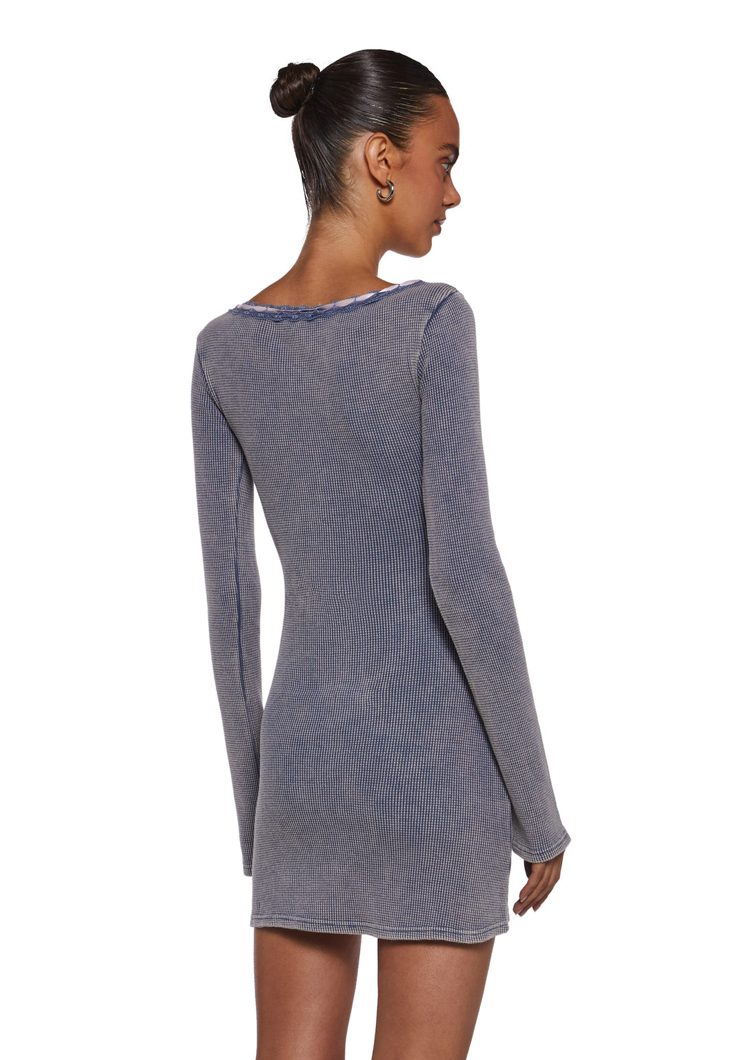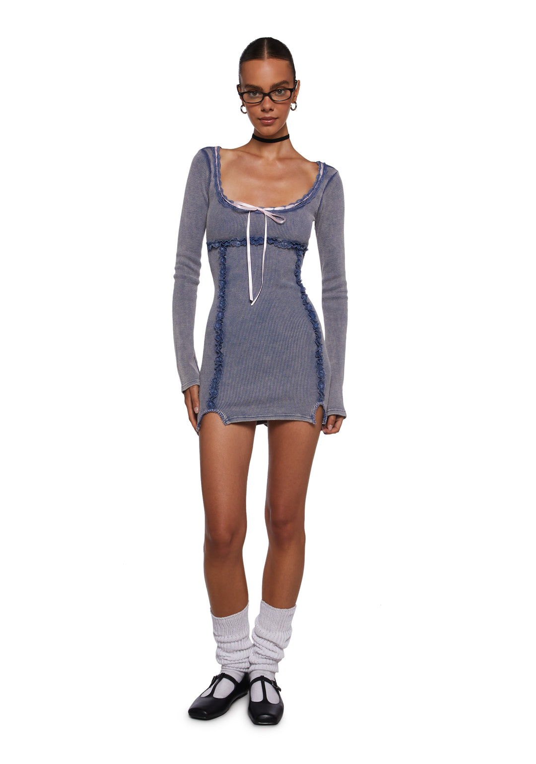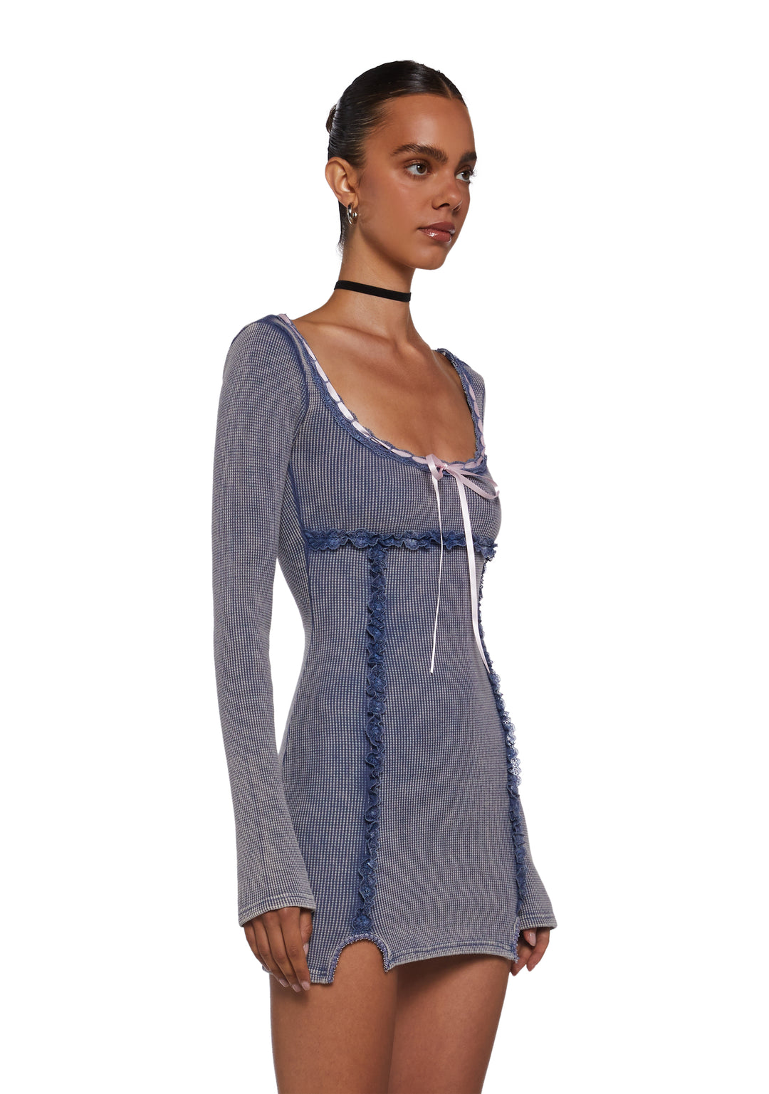 This mini dress has a waffle knit construction, a scoop neckline, an interlocking ribbon design with a bow on the front, lace ruffle details, and long sleeves.