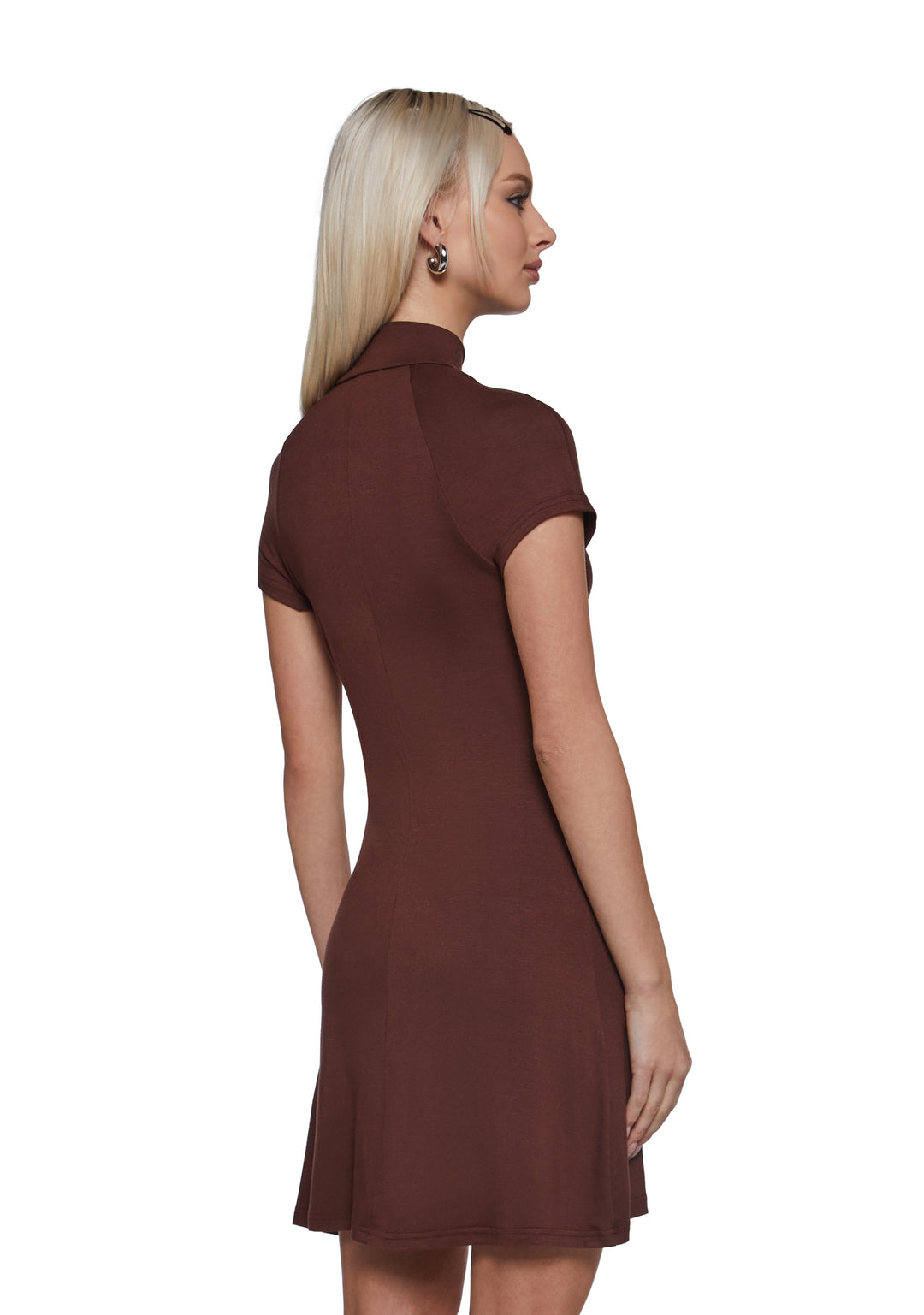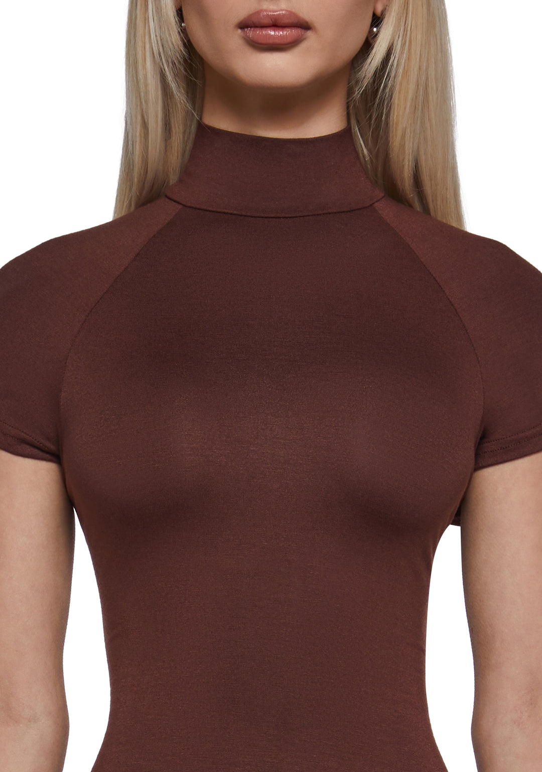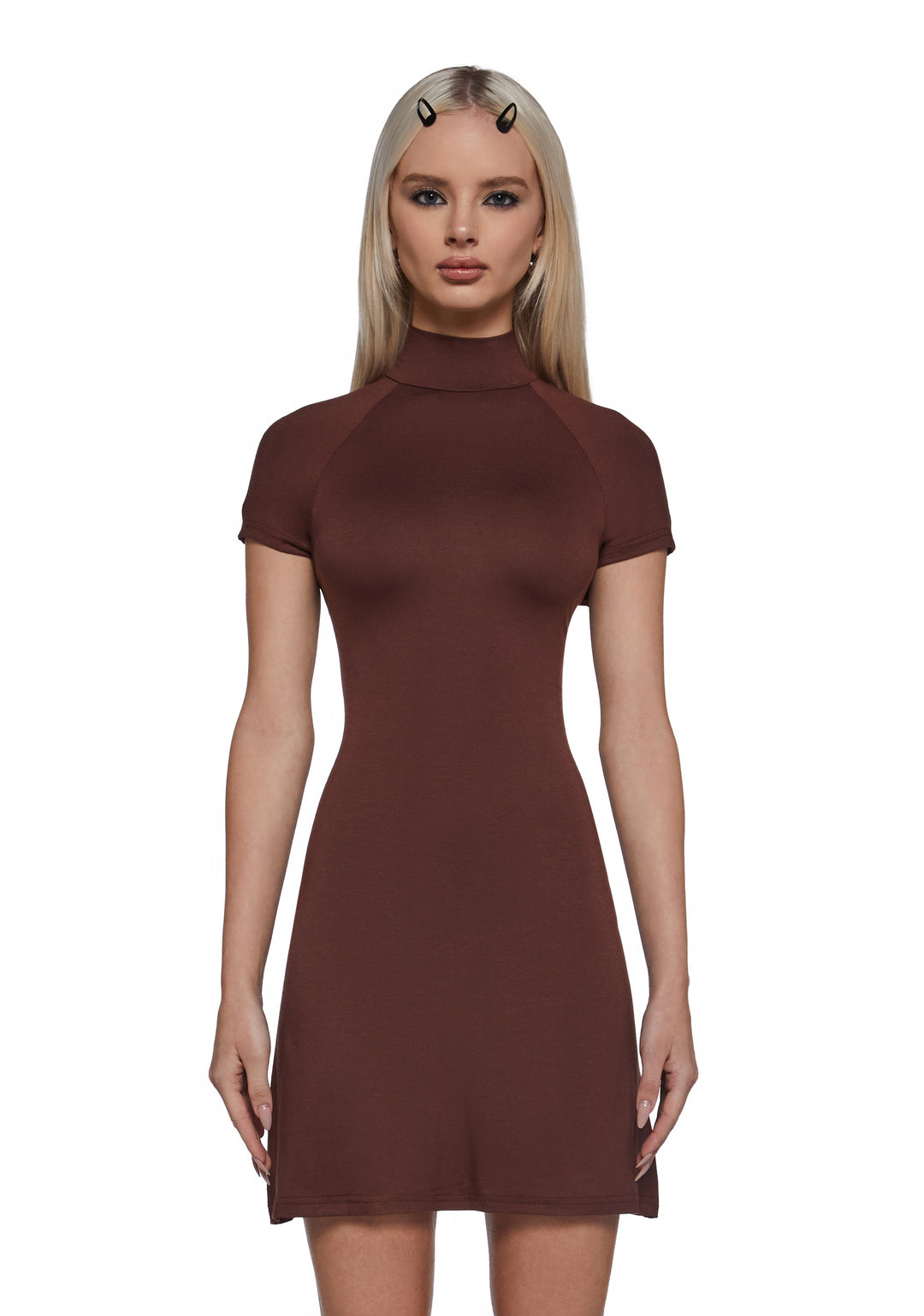 Glow through every moment with this mini dress featuring a soft stretchy knit construction, a sleek mock neckline, and fitted short sleeves for a flattering silhouette.