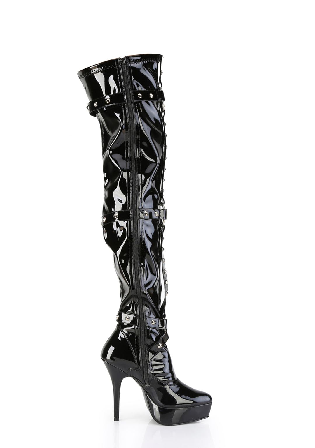 These boots have a stretch vegan leather vinyl construction, side mesh paneling, D-ring hardware, chain details, straps, stud detailing, and side zipper closures.