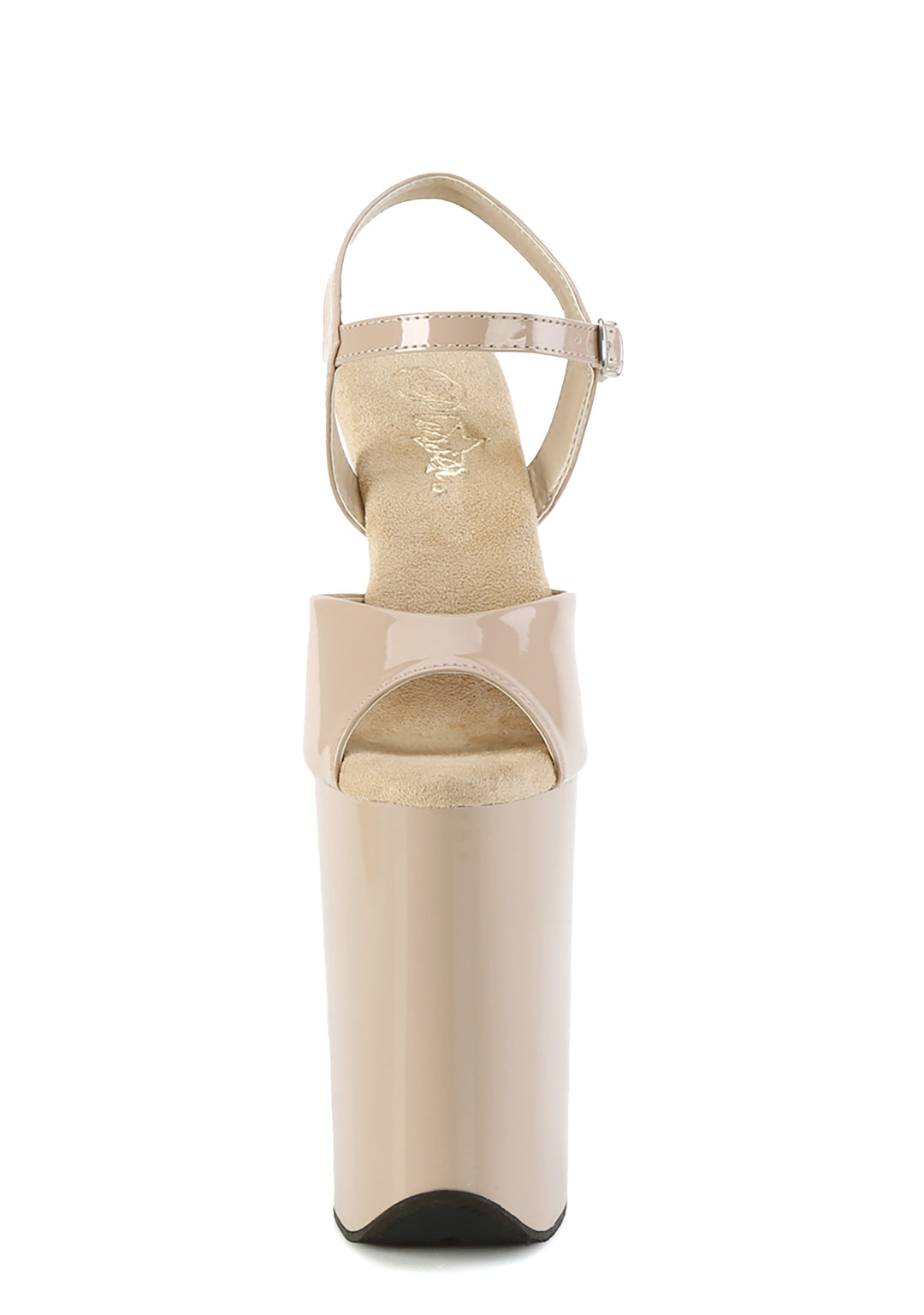 These sandals have a vinyl construction, platform soles, dramatic stiletto heels, and adjustable ankle buckle closures.