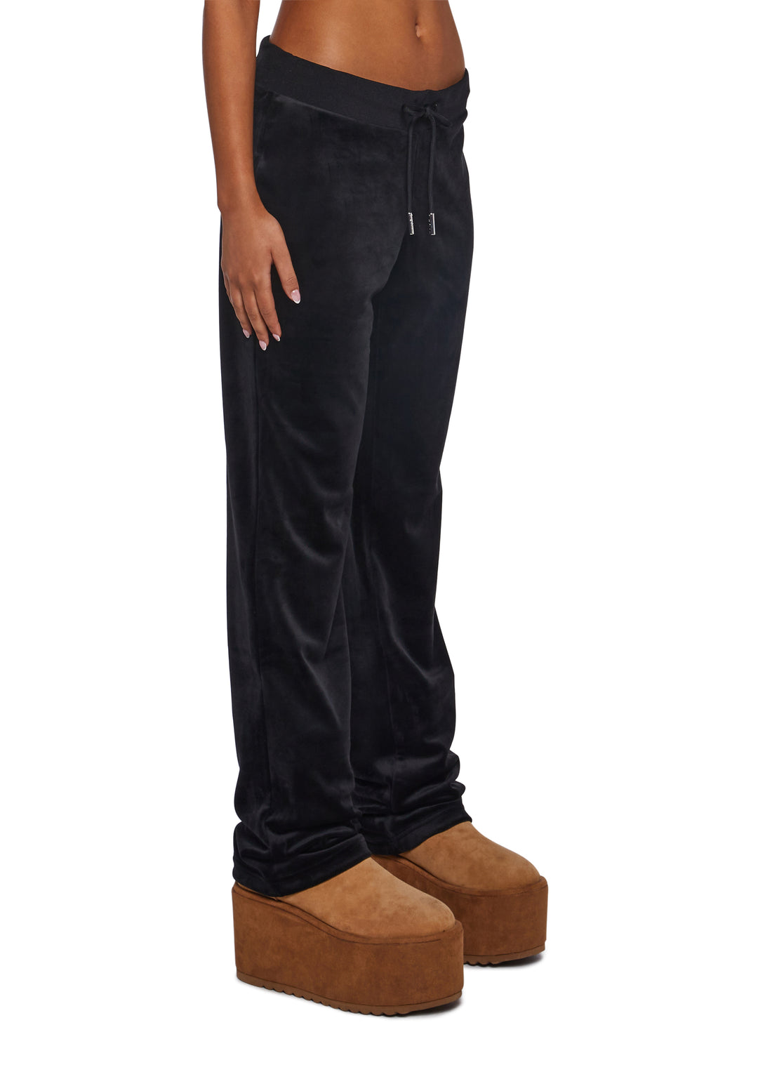 These pants have a velour construction, the word “Juicy” embellished in rhinestones on the back, and an elastic waistband with adjustable front tie closures.