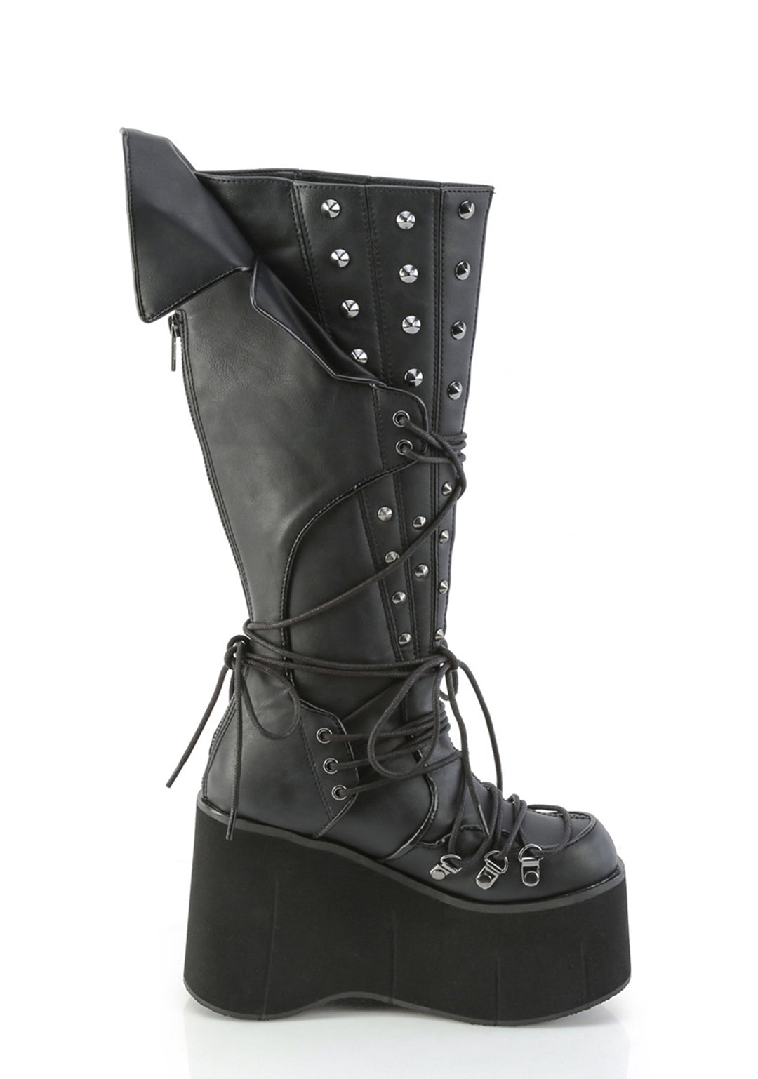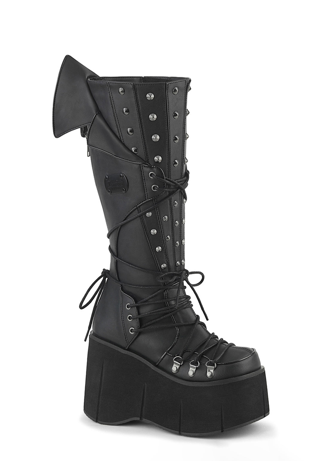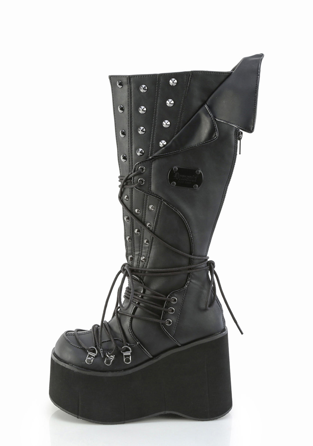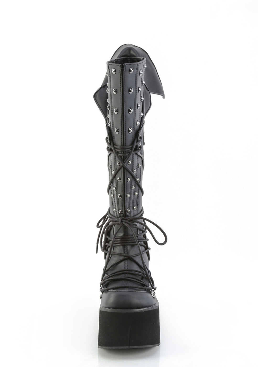 These boots have a vegan leather construction, cone spike studs, and lace up closures.