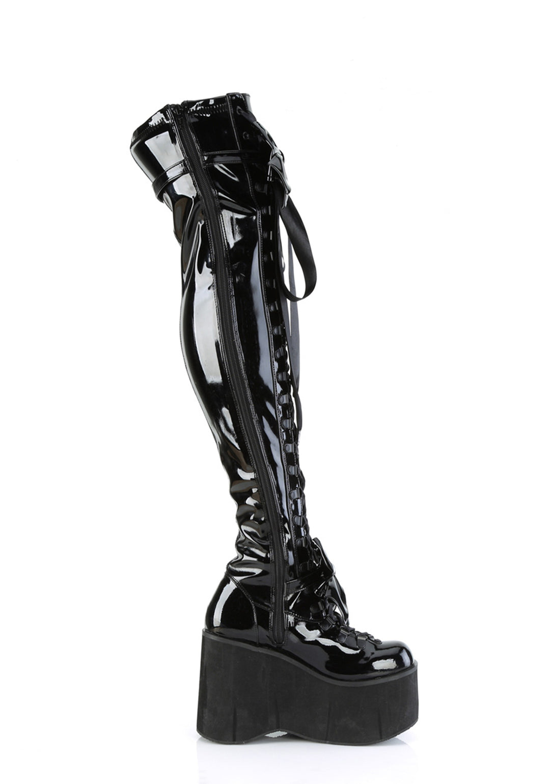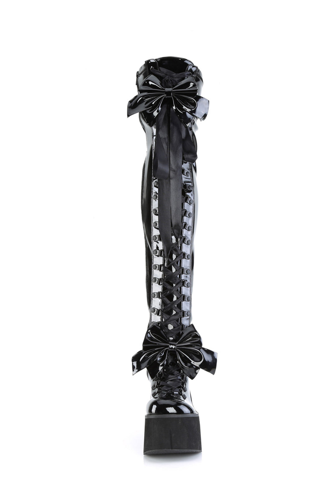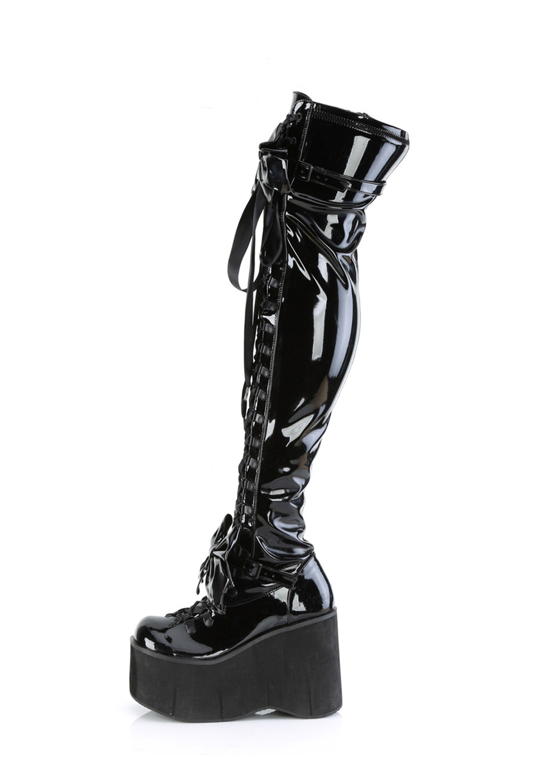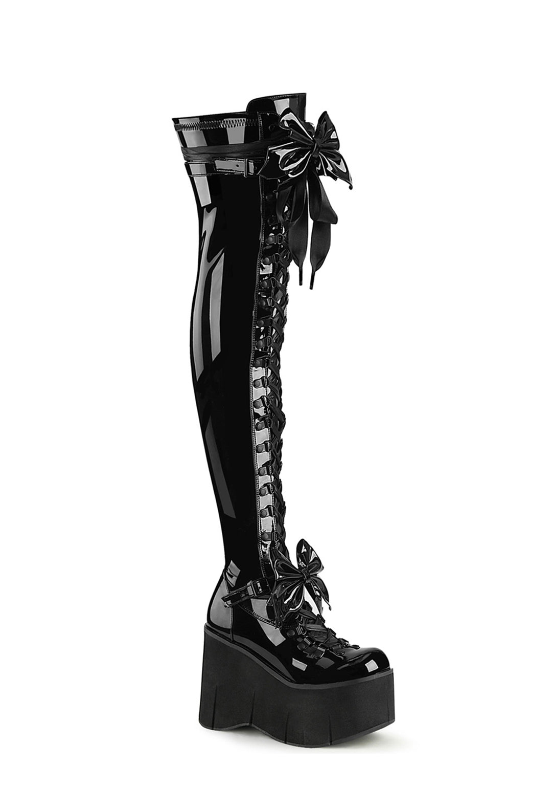 rule the darkness! These gothic thigh high boots have a stretch vegan leather construction, big detachable bows, wedge platform soles, lace up fronts, and side zip closures.