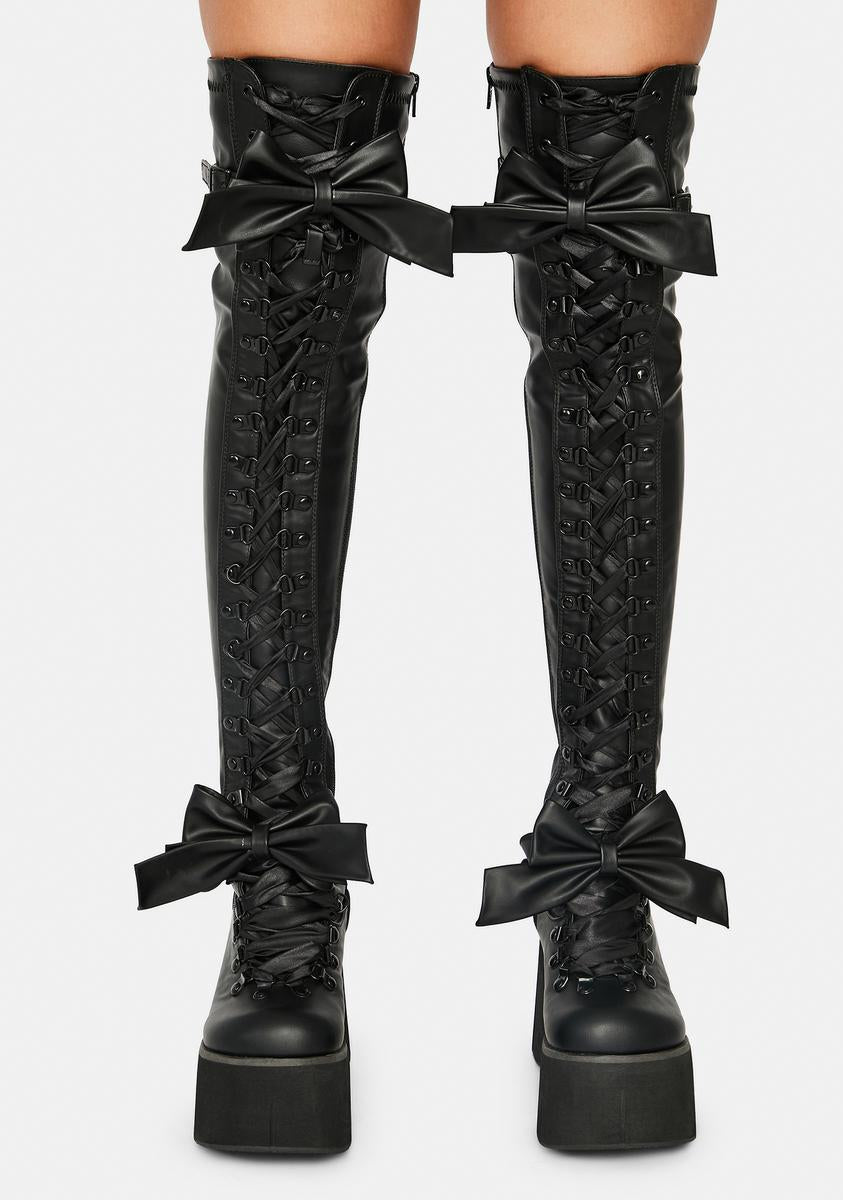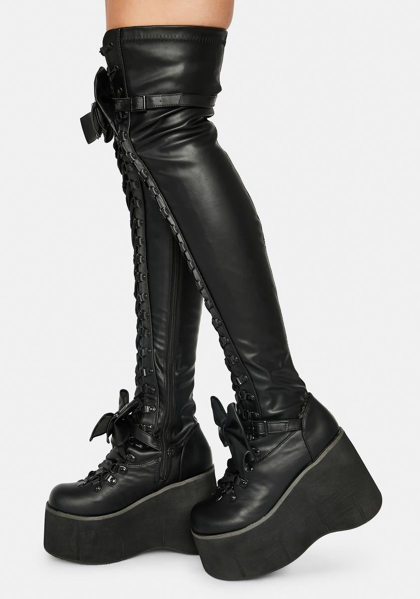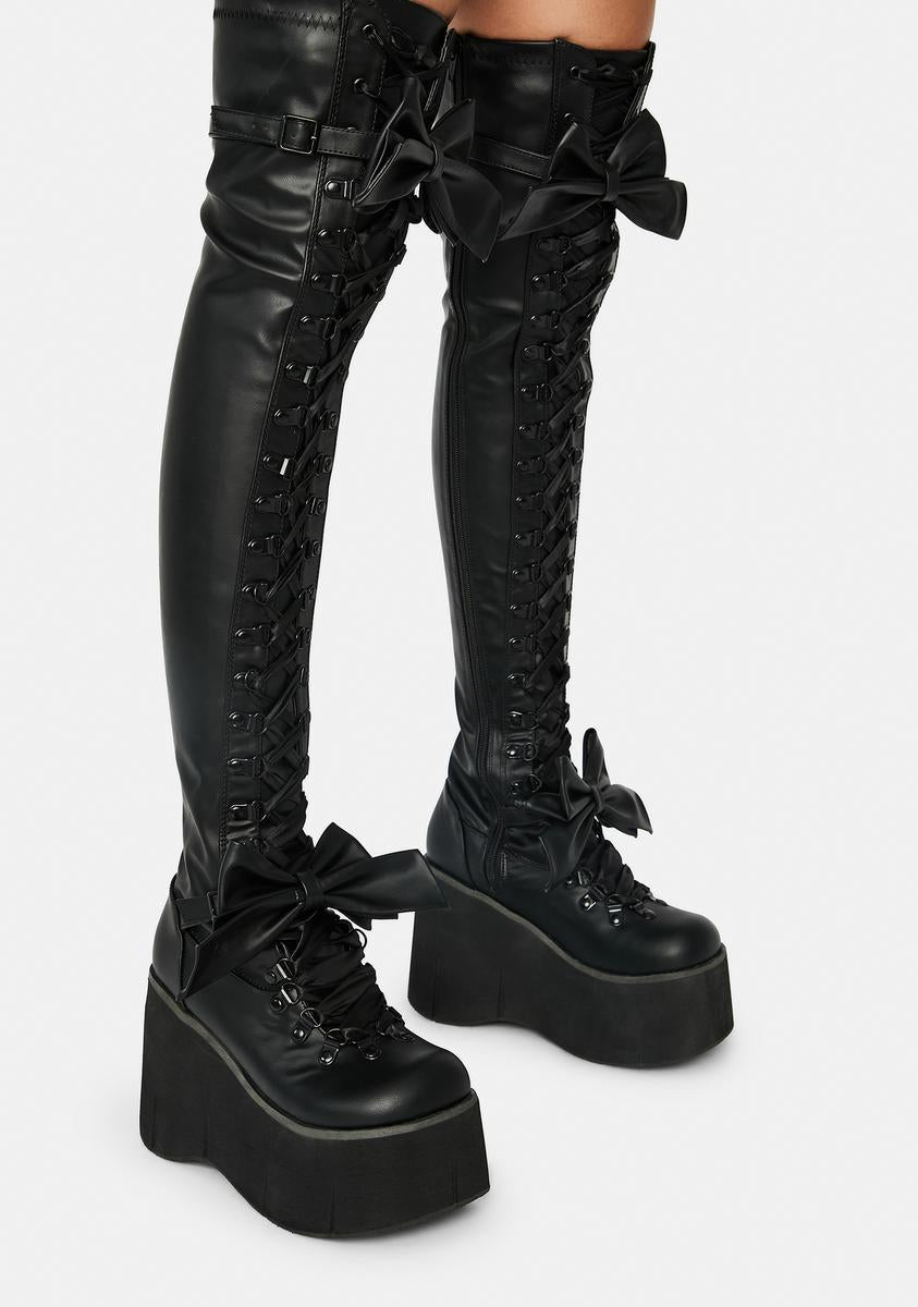 rule the darkness! These gothic thigh high boots have a stretch vegan leather construction, big detachable bows, wedge platform soles, lace up fronts, and side zip closures.
