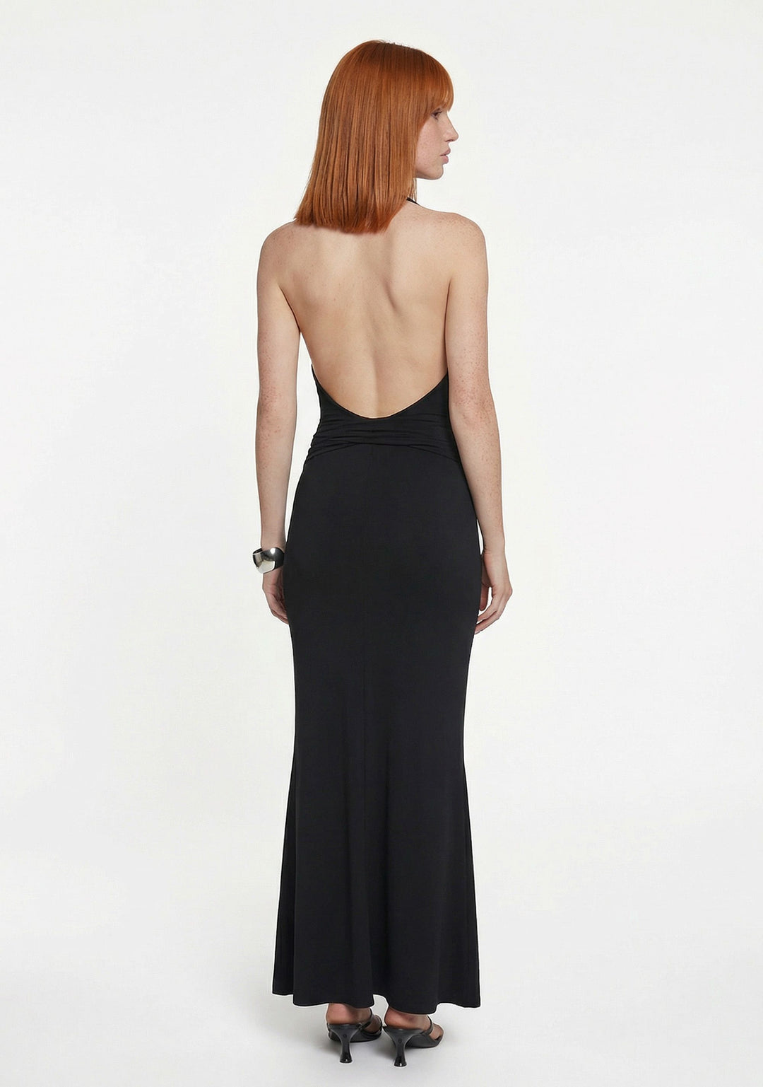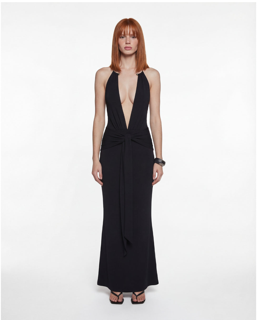 Make a daring entrance in this sultry maxi dress featuring a plunging neckline, sleek halter straps, and a waist tie that sculpts your silhouette. Its smooth, flowy fabric drapes effortlessly for an ultra-elegant, high-impact look.
